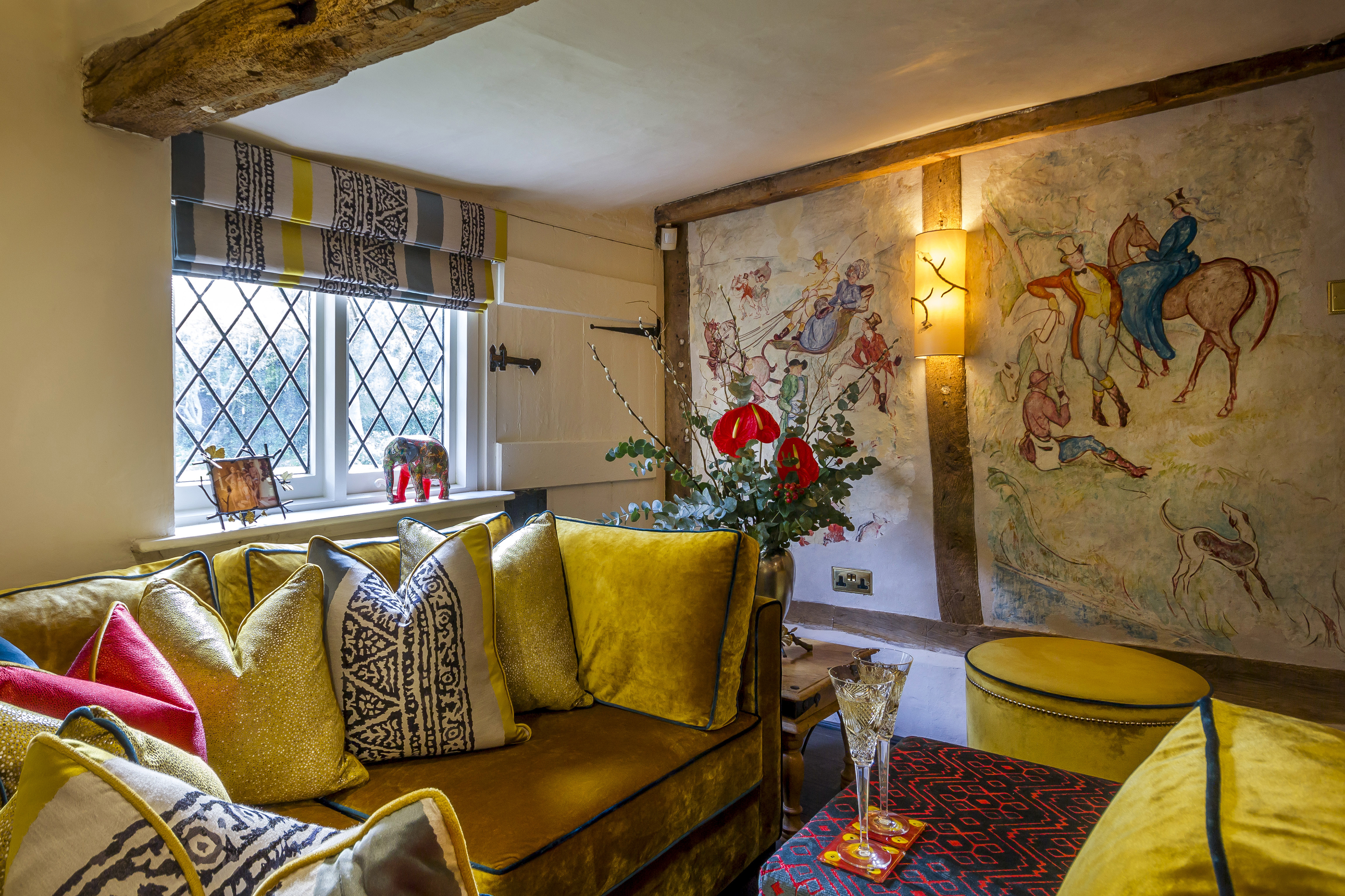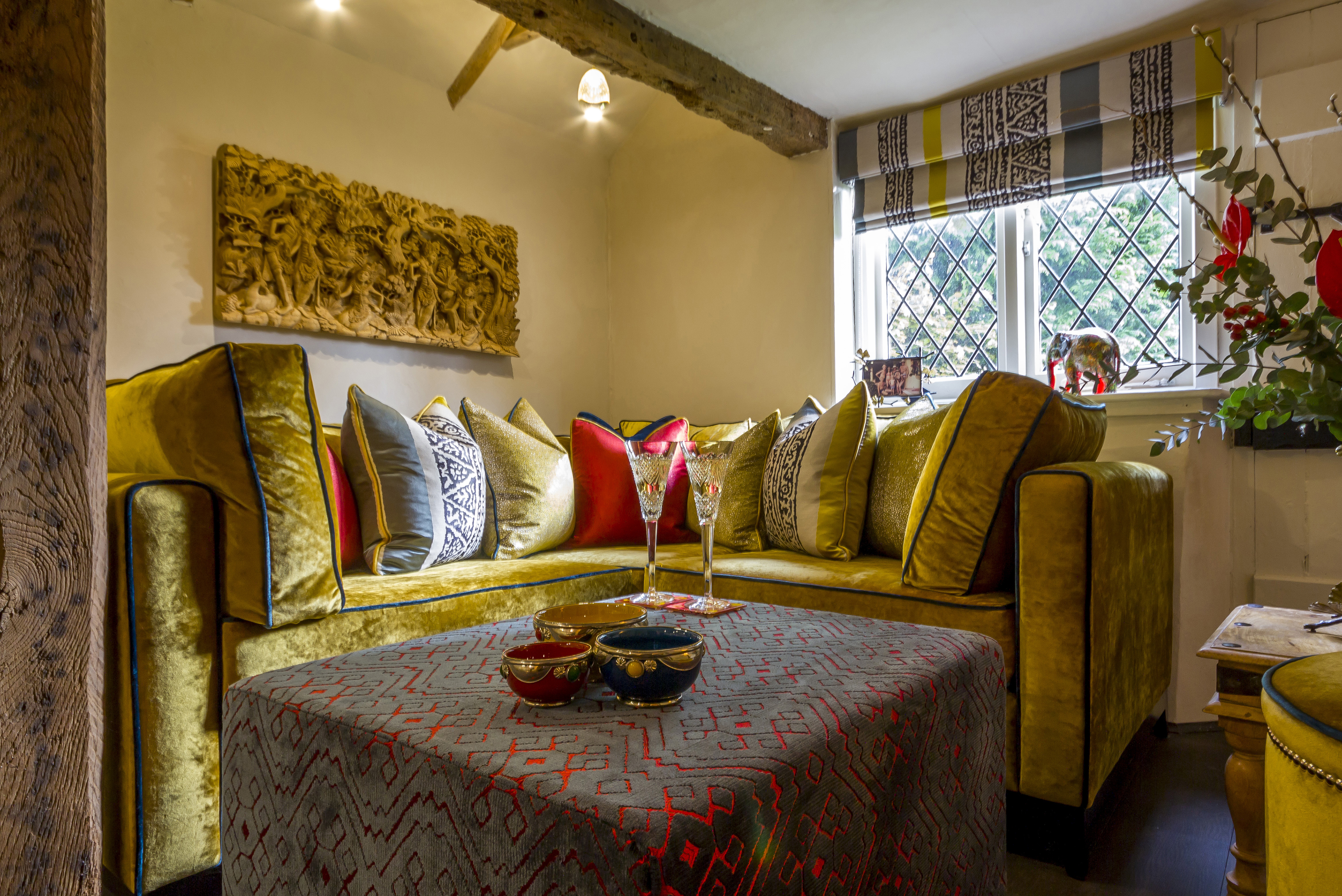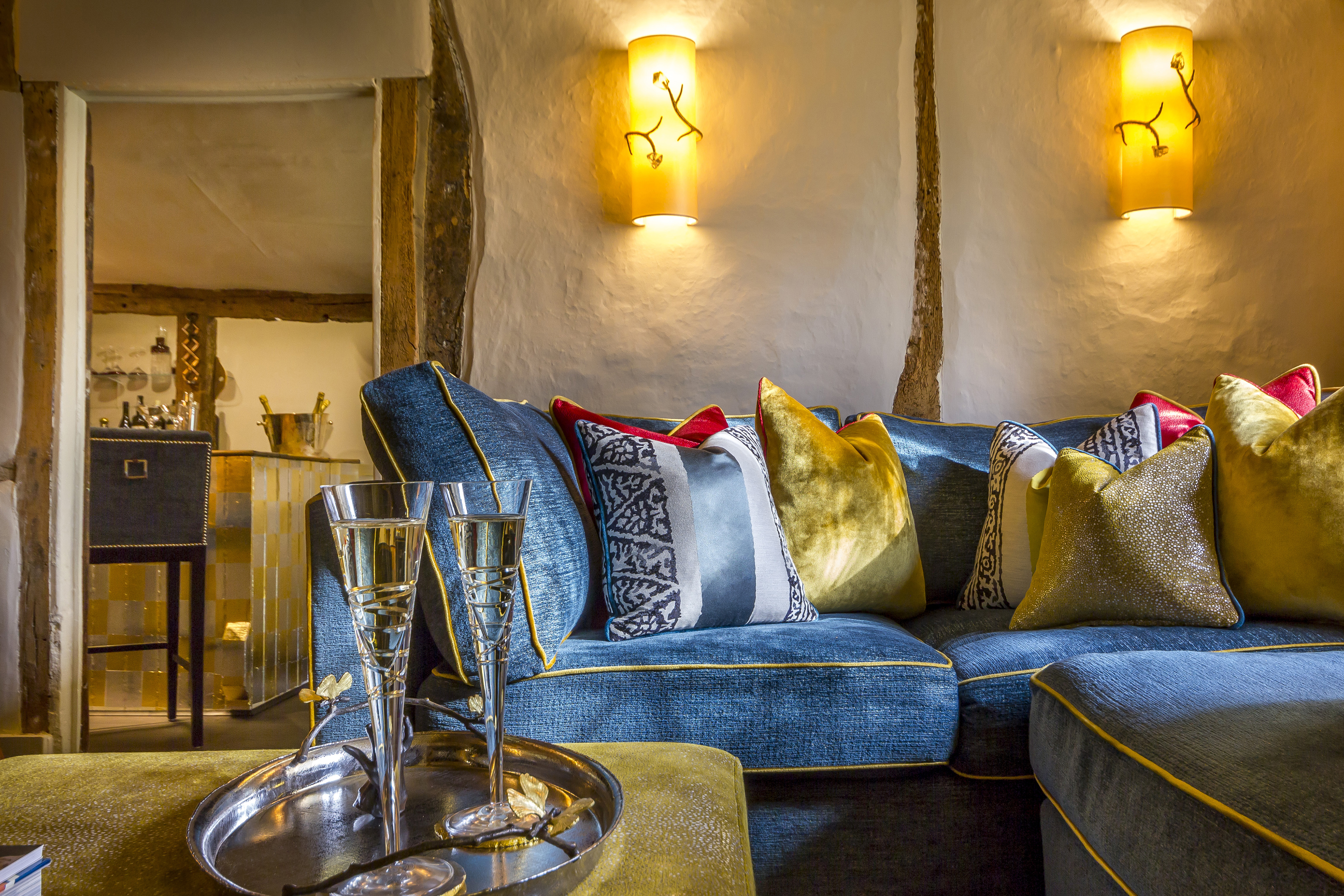 Full furnishings and decoration to this bar and lounge area of a cottage. Every project brings the design team new and diverse challenges. An example of this was for clients who owned a 16th Century grade II listed home.