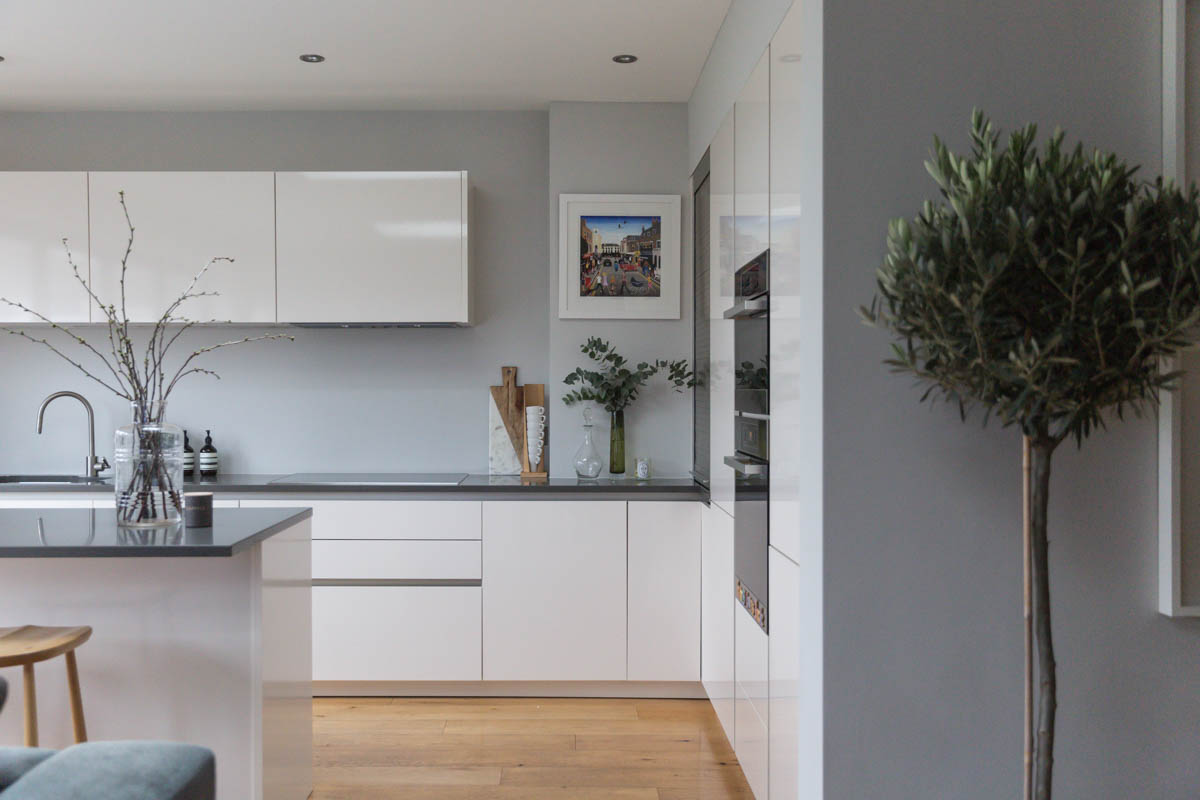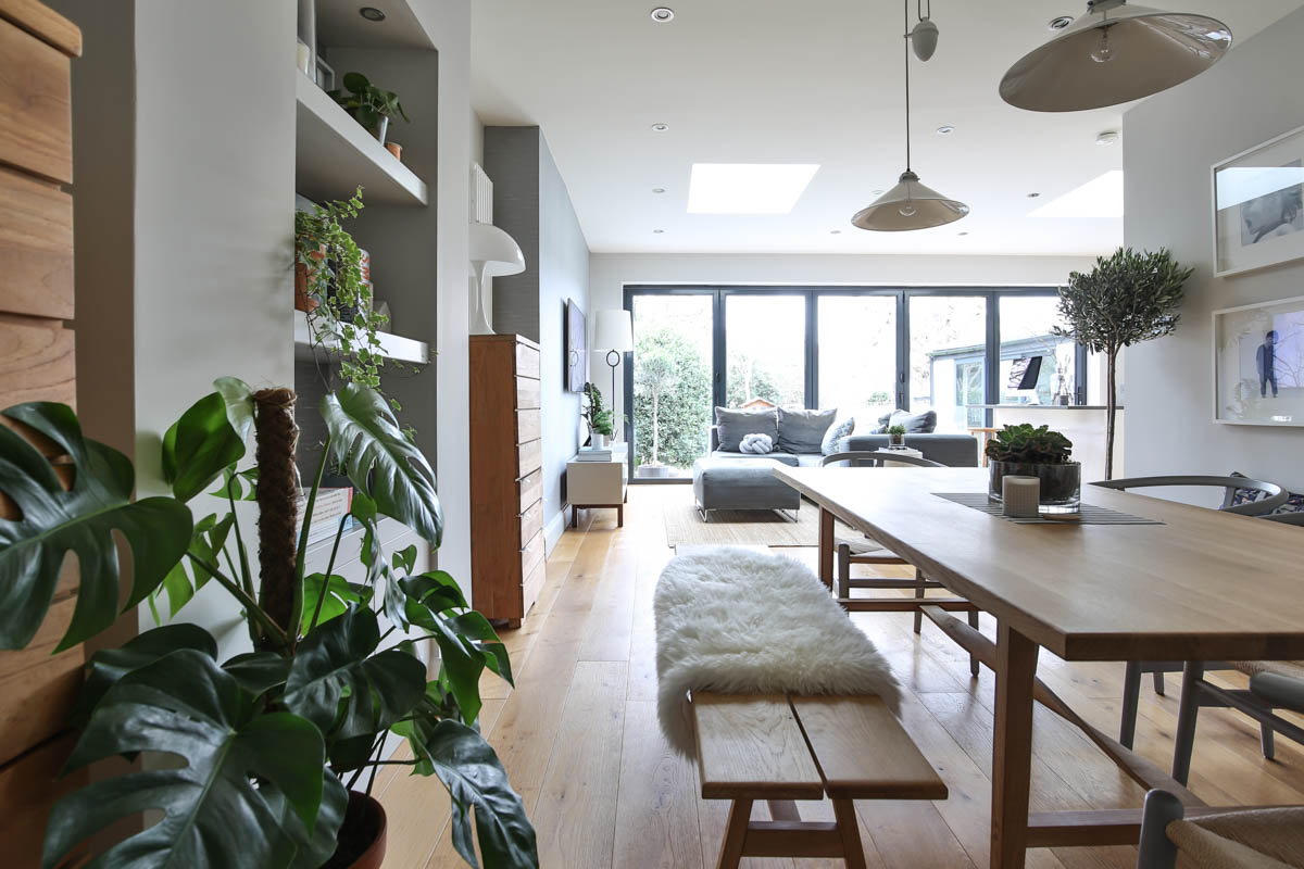 We reinstated architectural details throughout the home such as skirting, cornice and architraves and introduced wide planked oak wooden flooring on the ground floor. A simple calm neutral palette of off white, and shades of grey gives a spacious art gallery feel to the home. With a love for good British design in natural materials we introduced elegant understated classic porcelain BTC lighting features throughout the home and created a stunning statement above a handcrafted oak dining table from British design Tom Raffield to make this interior feel homely and lived in.