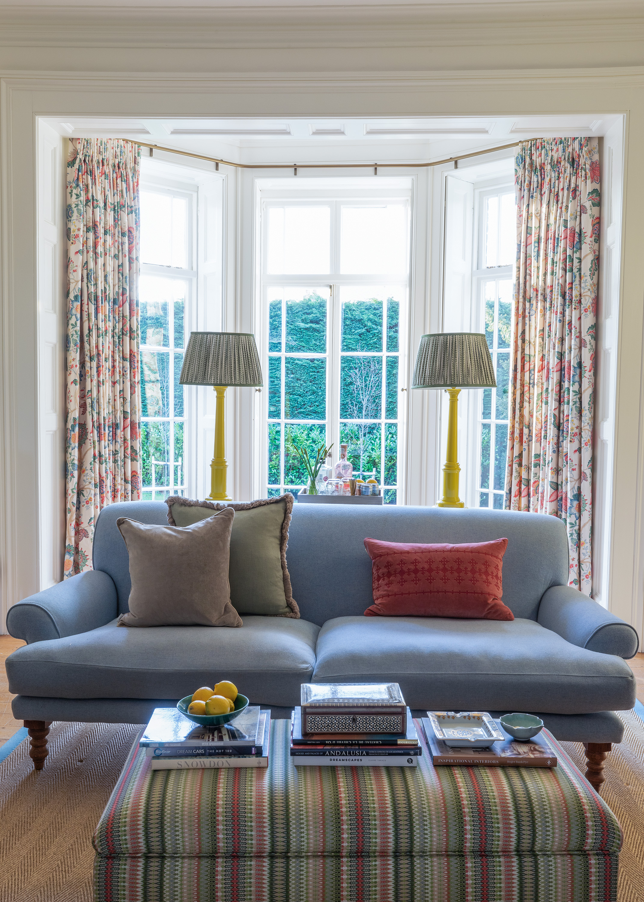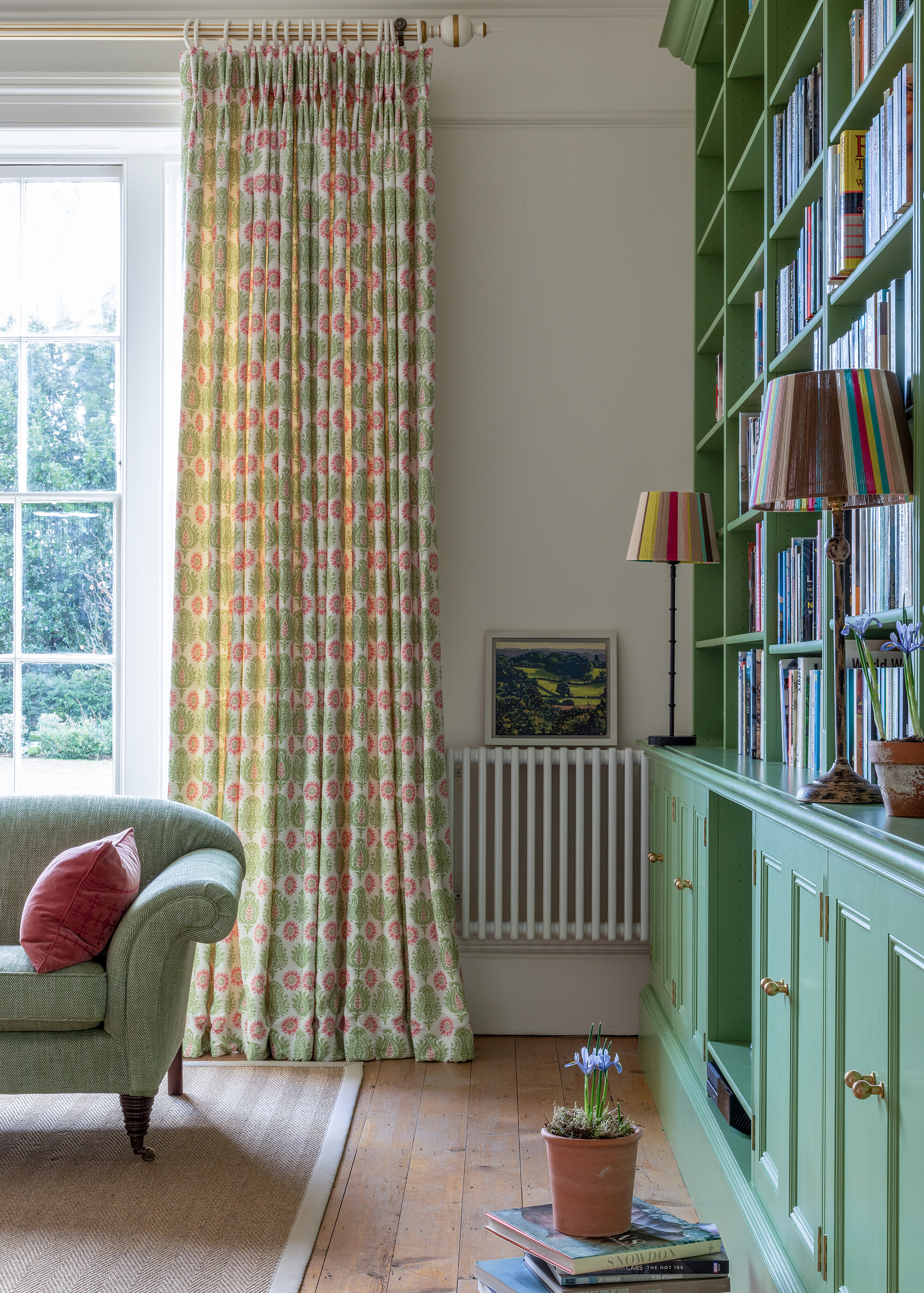 The brief was to introduce colour and comfort into the home for the whole family to enjoy. The spaces now, which all have wonderful views of the garden, have warmth and vibrancy, and we have now brought the outside in by decorating in verdant greens and incorporating floral prints and jolly upholstery into the room schemes.