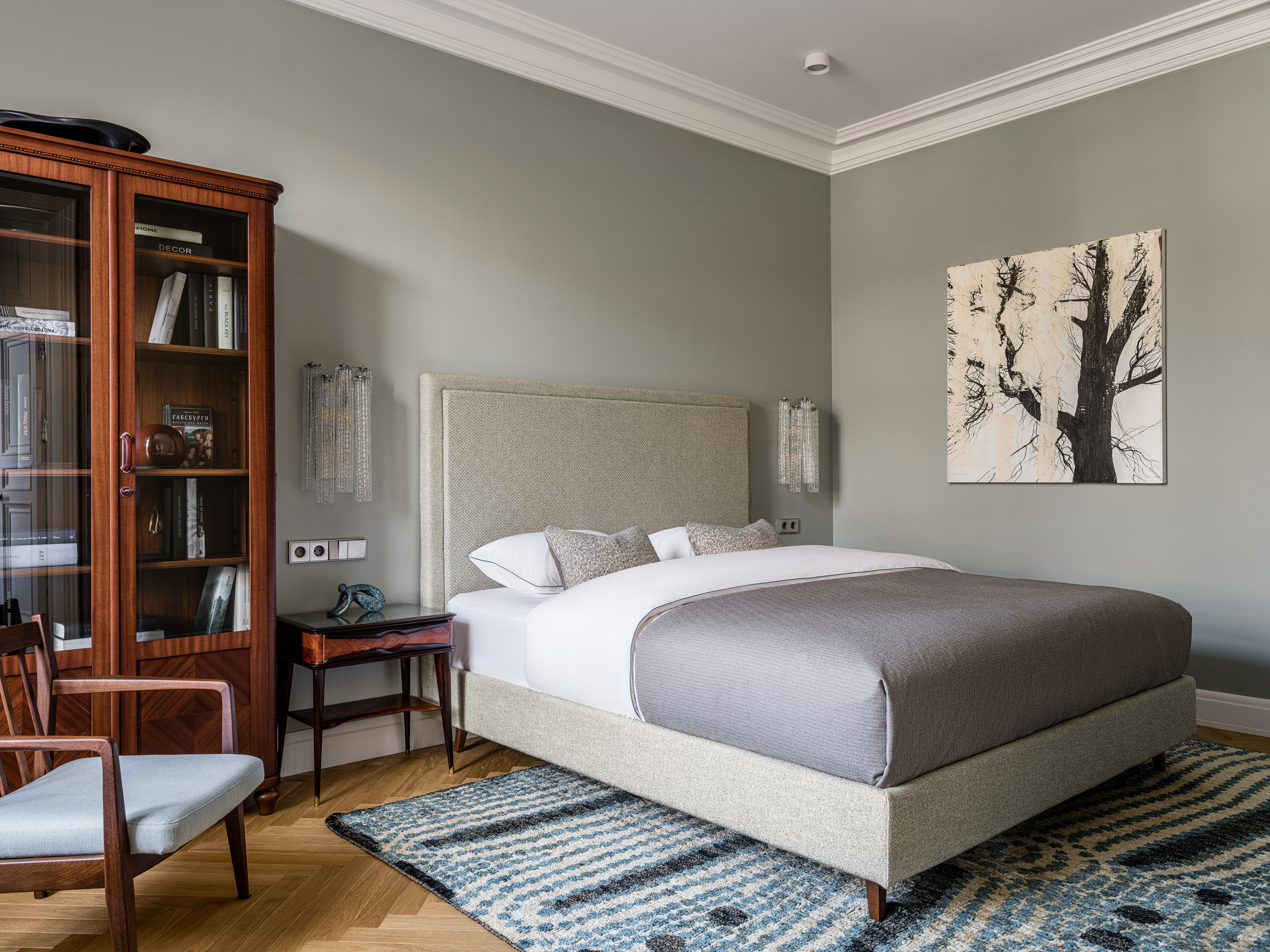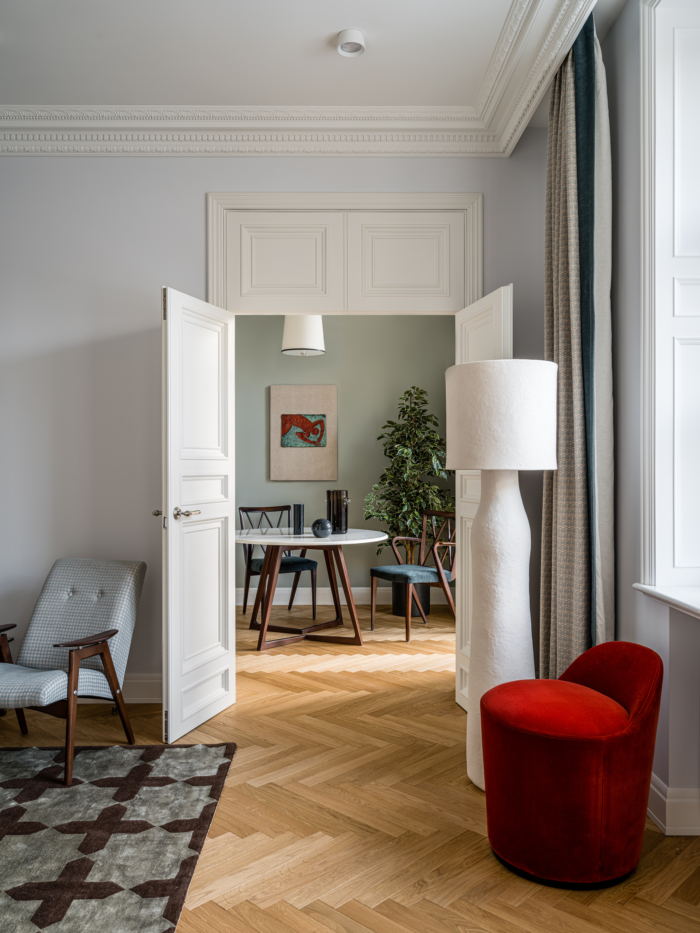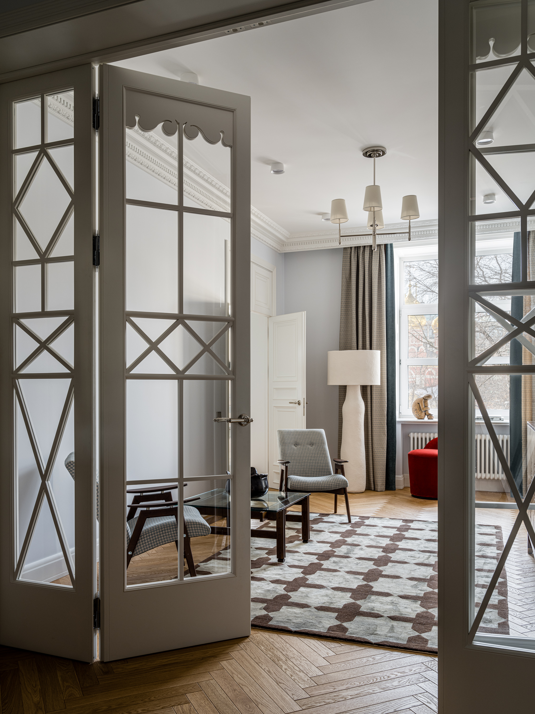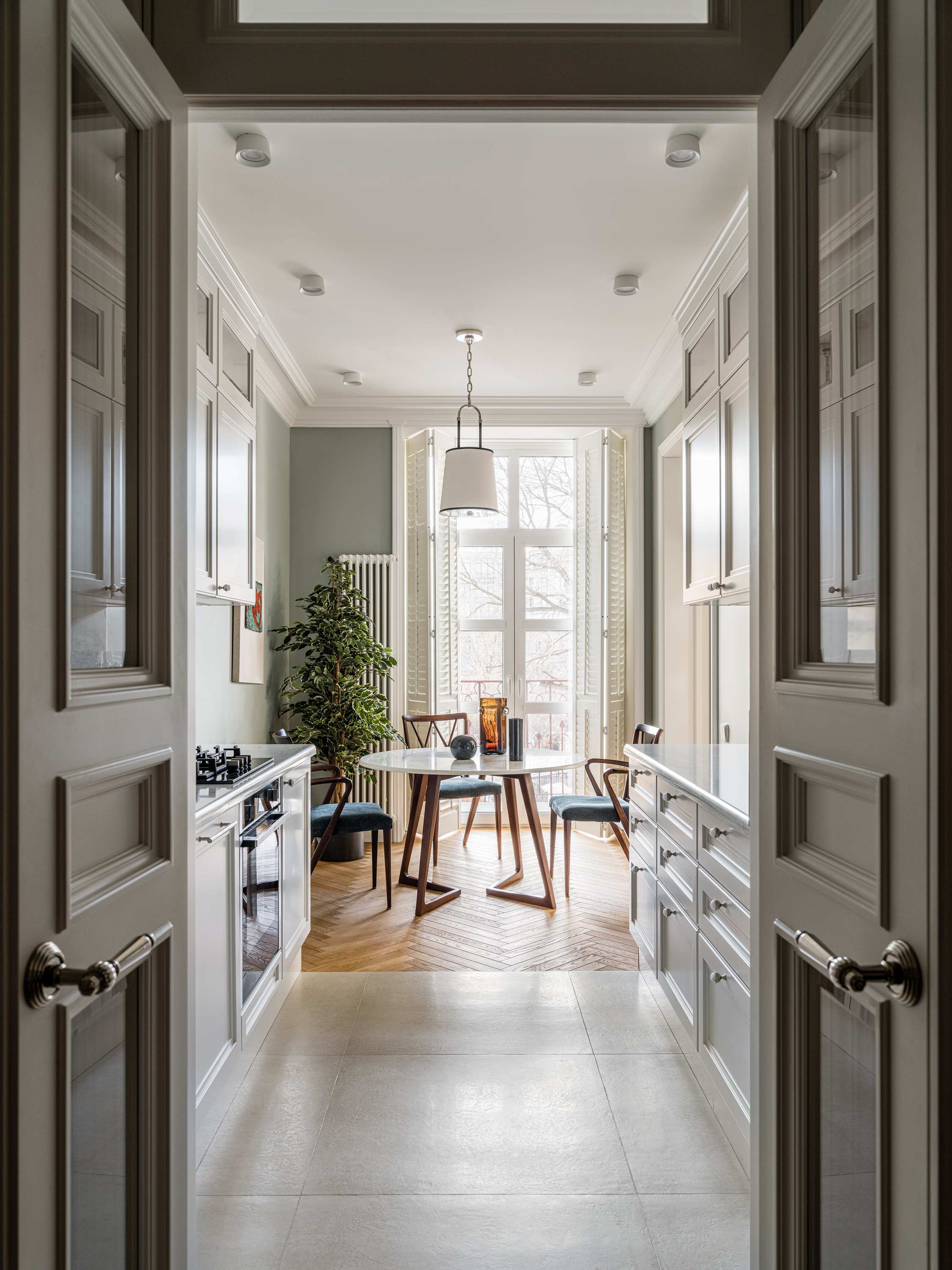 A renovated apartment in a historical building in the centre of Moscow. The pale light colour palette is mixed with bold accent furniture and decor elements. The traditional doors and partitions were restored and painted as well as some pieces of furniture were restored and breathed a new life. The apartment is done in an eclectic style mixing old and new elements together. It is a typical one bedroom apartment layout with an isolated kitchen, dining and a living room. High ceiling and doors add space into the apartment and it looks bigger than the actual size. The floor layout was changed from the initial one. Now it is a so-called circular apartment layout - an enfilade was added from the kitchen to the bedroom. You can either go through the whole apartment via beautiful double doors or there is an alternative private entry into the bedroom.