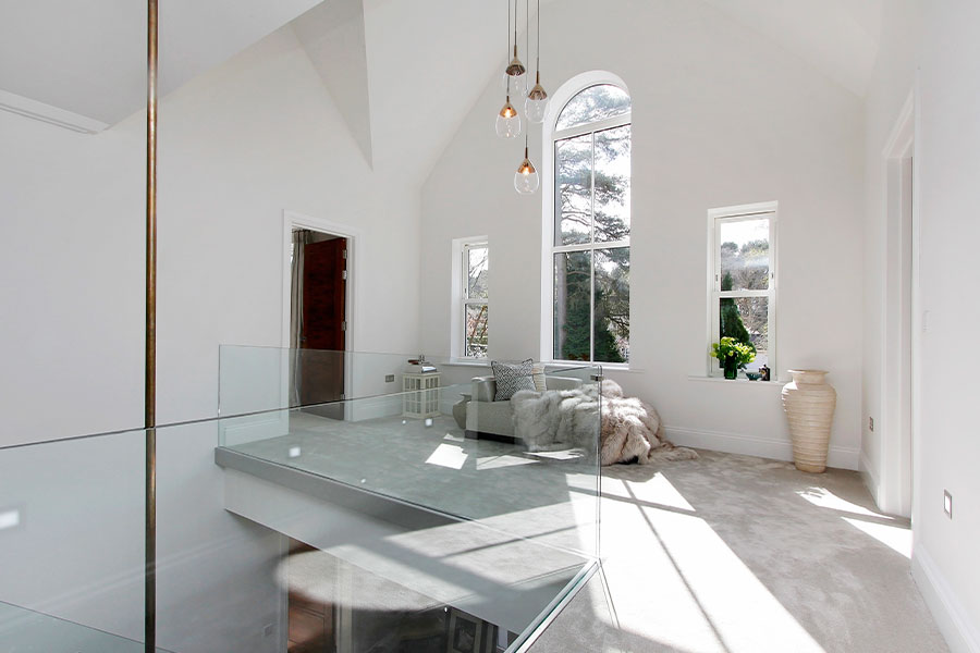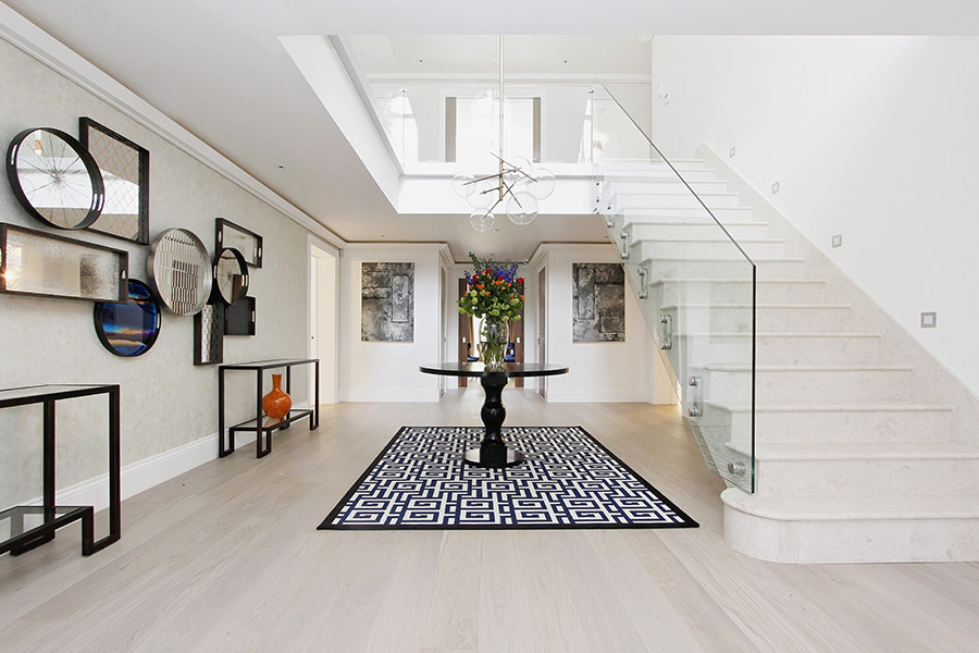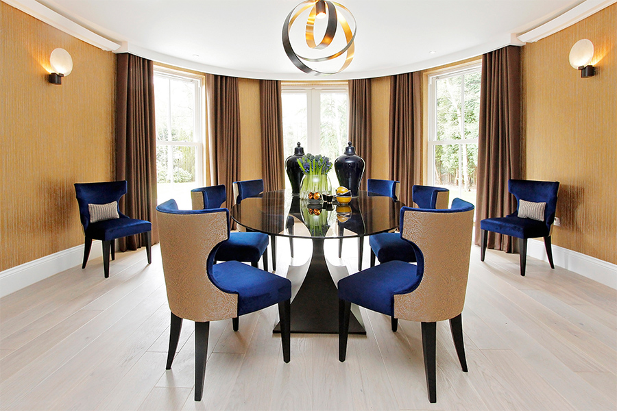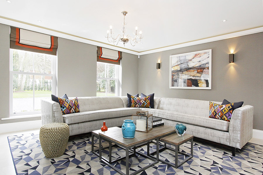 Working initially with both the developer and ultimately the purchaser on this project, our brief was to deliver a unique, stylish and energised scheme whilst also achieving a family-friendly environment for this large new build development on the outskirts of Ascot, Berkshire. The double height entrance hall lent itself to the elegant glass bollé pendant, drawing attention not only to the sheer scale of the property but through the house to the stunning gardens beyond. From a monochromatic scheme in the Master Bedroom to pops of tangerine orange in the open plan Family room, the colour palette throughout the house reflected our brief. At the 2018-19 UK Property Awards, we won ‘Best Interior Design Show Home South East’ for our designs for this property.