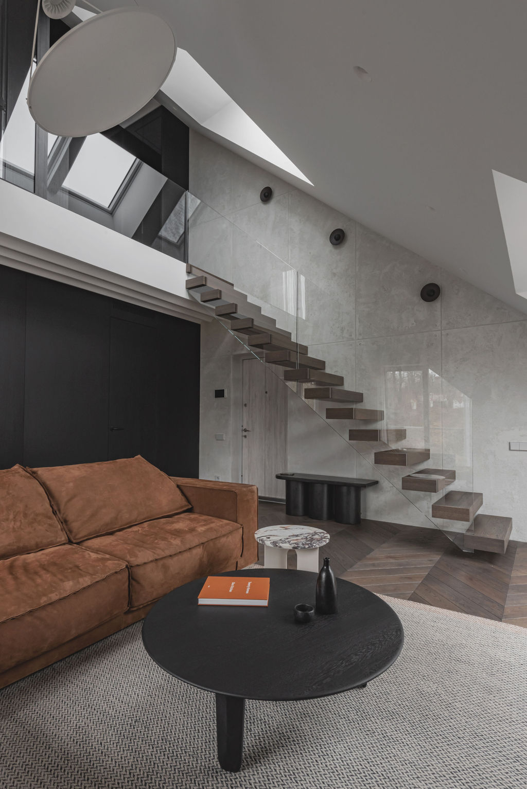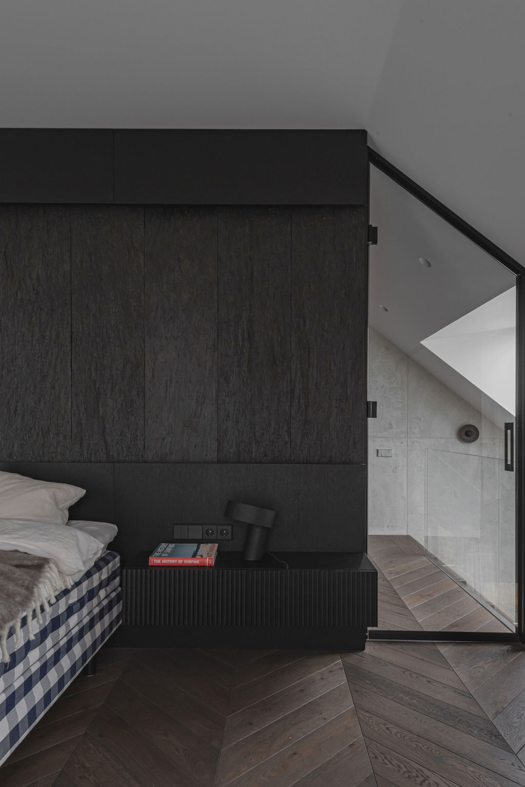 The allure of attic spaces lies in their distinctive layout and the abundant natural light that floods in through skylights, making them highly sought-after. Maximizing the potential of these spaces often calls for the expertise of architects and interior designers. One remarkable project was entrusted to architect Indre Dorofejute of InArch studio. Thanks to the plentiful skylights, daylight was never in short supply, empowering the homeowners to embrace darker hues, from a sleek black kitchen and a moody bathroom to bedroom walls and richly toned dark oak wood parquet flooring.