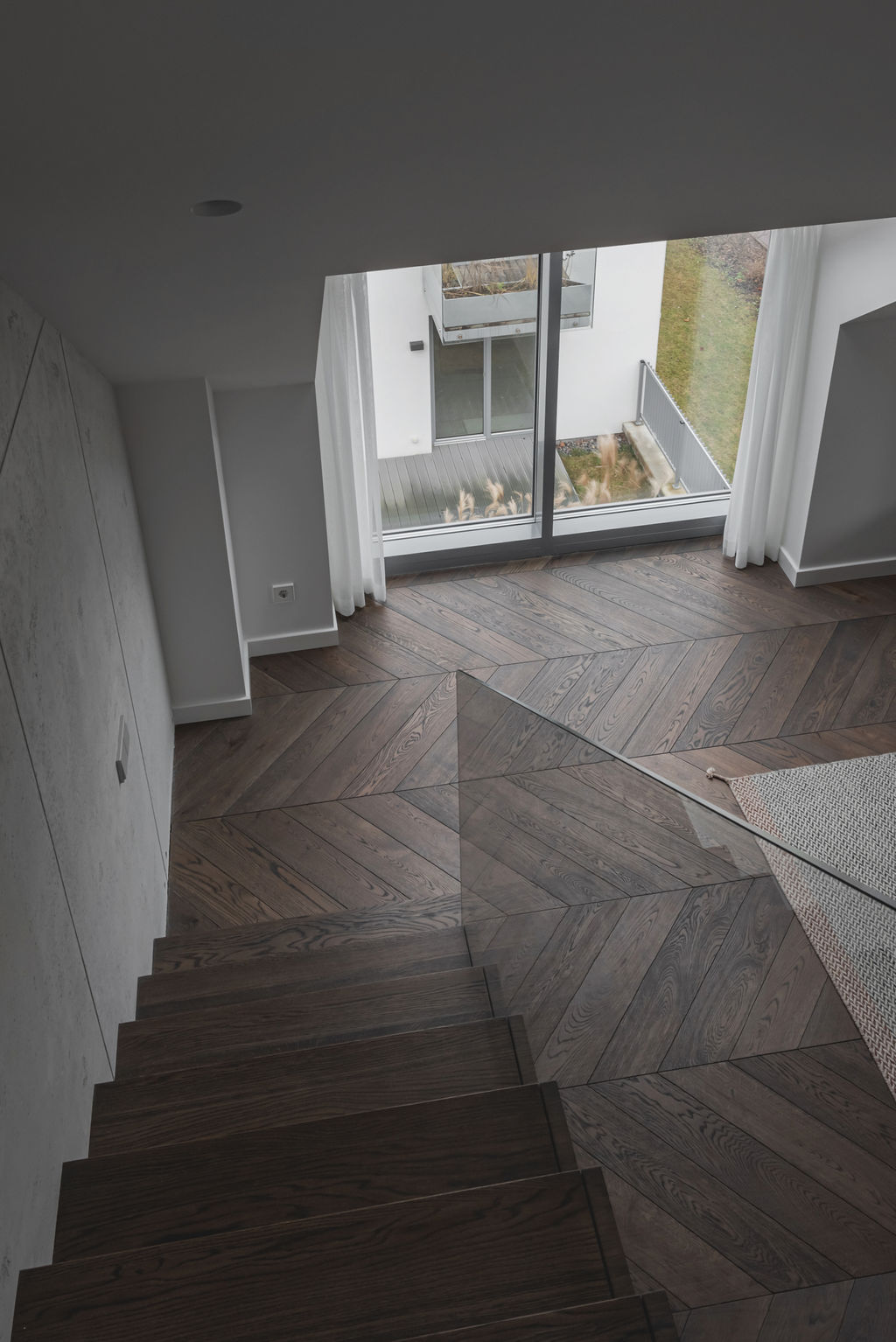 The attic reveals an impressive harmony between various wooden elements, extending from the floors to the wall decor. The choice of oak wood parquetflooring imparts warmth and organic touch. The sense of solidity is further accentuated by the engineered oak wood flooring in Chevron 45 pattern and the deep Antique colour (3479).