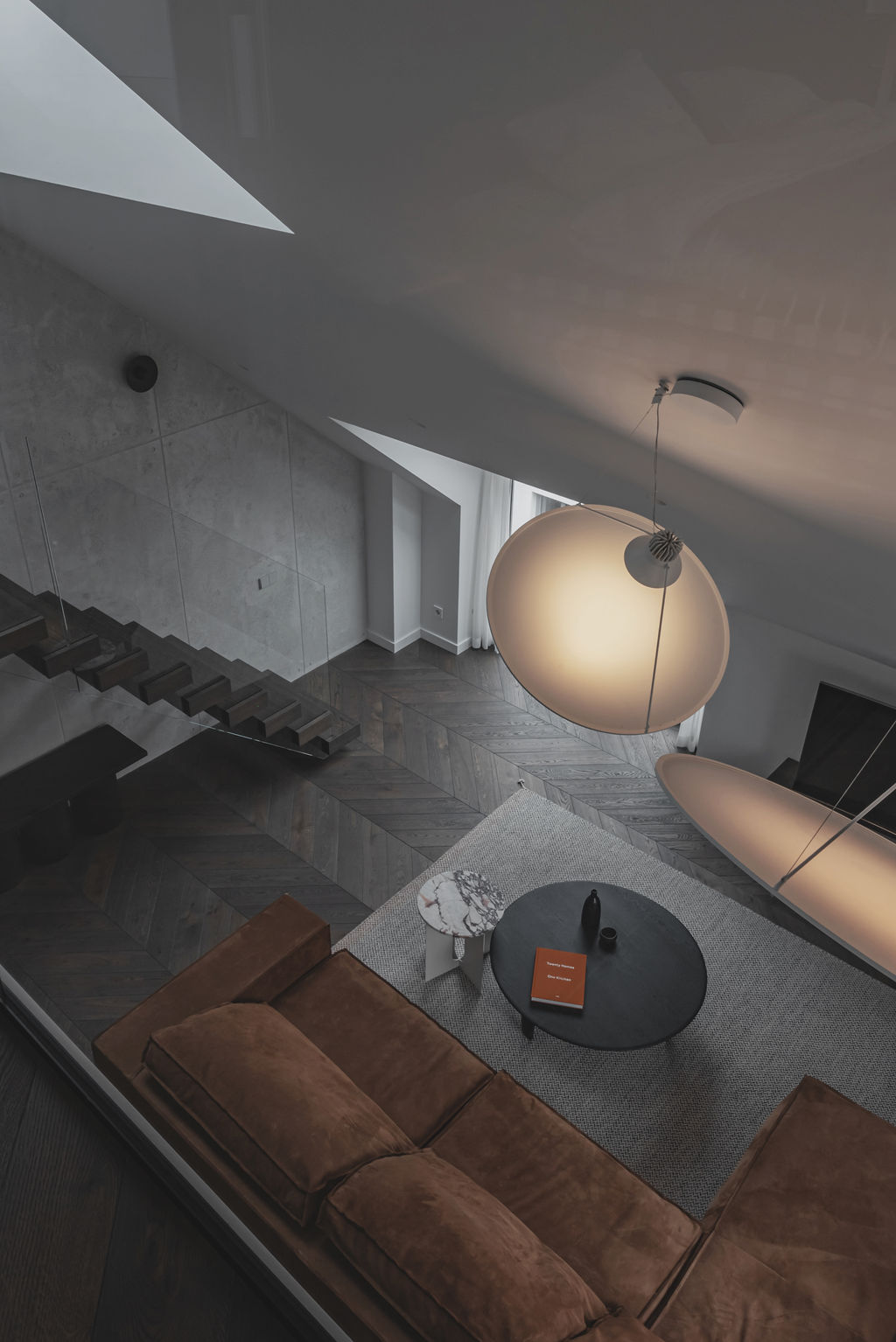 The dark wood parquet flooring exudes a sense of solidity, precisely what the attic demands. With sloping ceilings throughout, except for the first-floor shower room, the architect adapted the original layout to optimize every centimetre. "In the lower part of the slope, we often create recessed niches with doors to store less frequently used items, as well as shelves and dressers," explains the architect. In this project, bespoke gypsum ceiling details were meticulously crafted beneath the mezzanine level in the kitchen area, forming recesses for LED strips. This bespoke feature seamlessly integrates with the building's natural architectural elements, establishing a truly unique interior atmosphere.