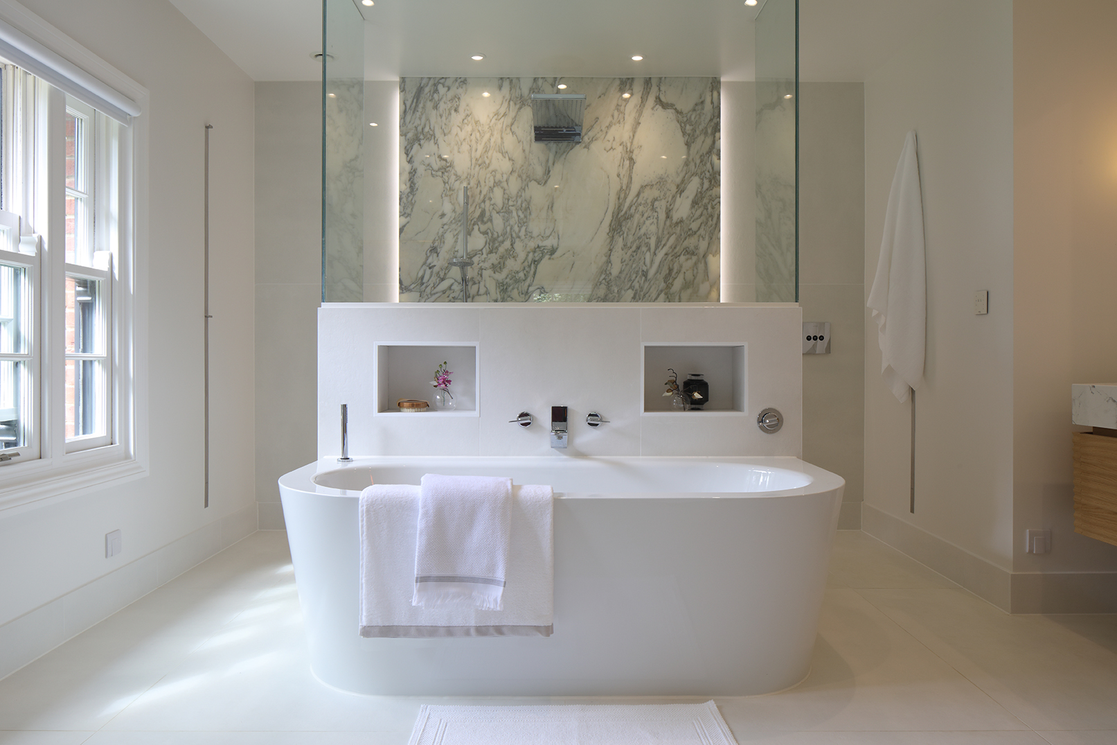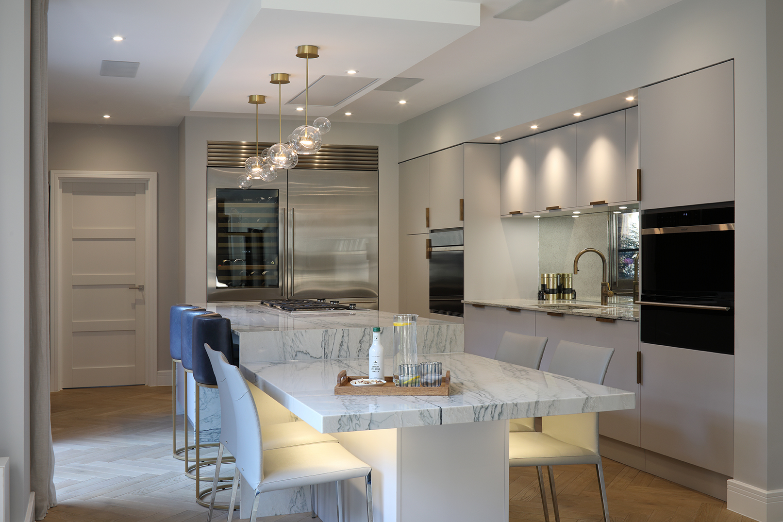 Marble, wooden slated panelling, antiqued glass and sprayed grain finishing create compelling contrasts and enveloping depth throughout this home, with varied light sources offering ambiance and exceptionally crafted bespoke joinery ensuring the scheme was finished to a high standard and built to last in a busy family environment.