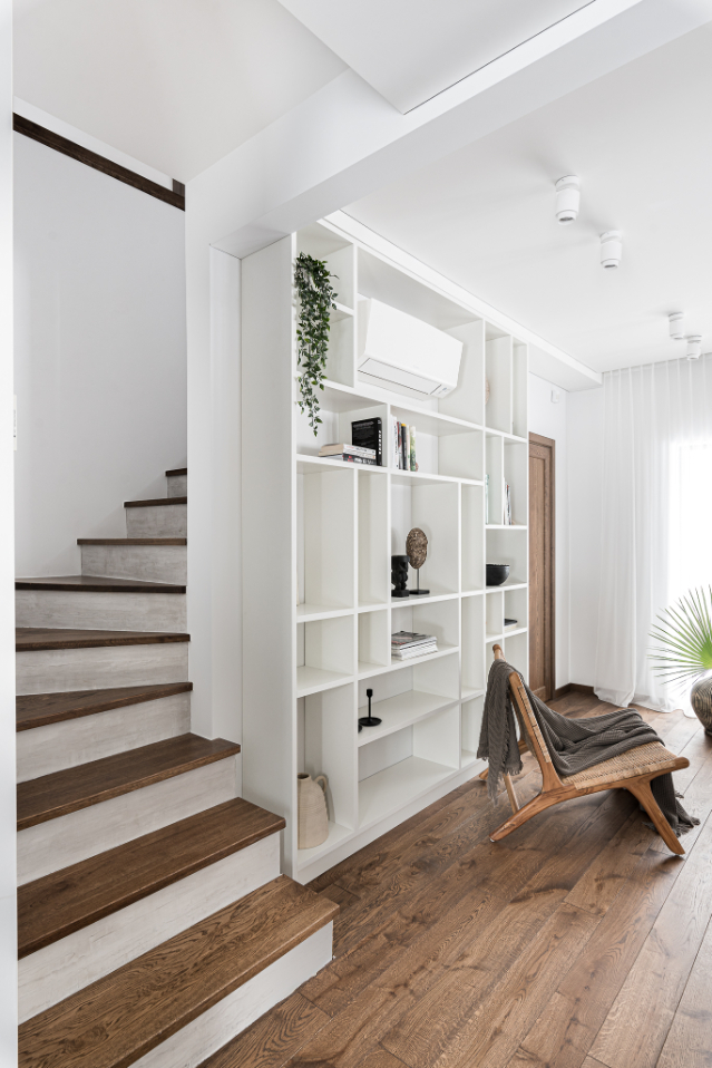 Oak appears in unexpected places in this interior: oak handles on the wardrobe, oak veneers for the bathroom cabinet facades, and a solid oak tabletop in the kitchen. Oak plays a significant role in the interior of this house due to its many uses. According to the designer, oak is durable and versatile. Once you experience its warmth, you will realize it is the perfect investment.