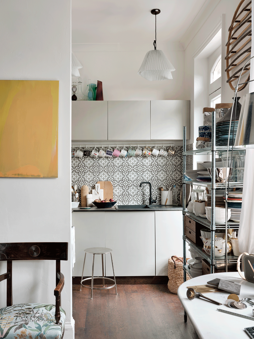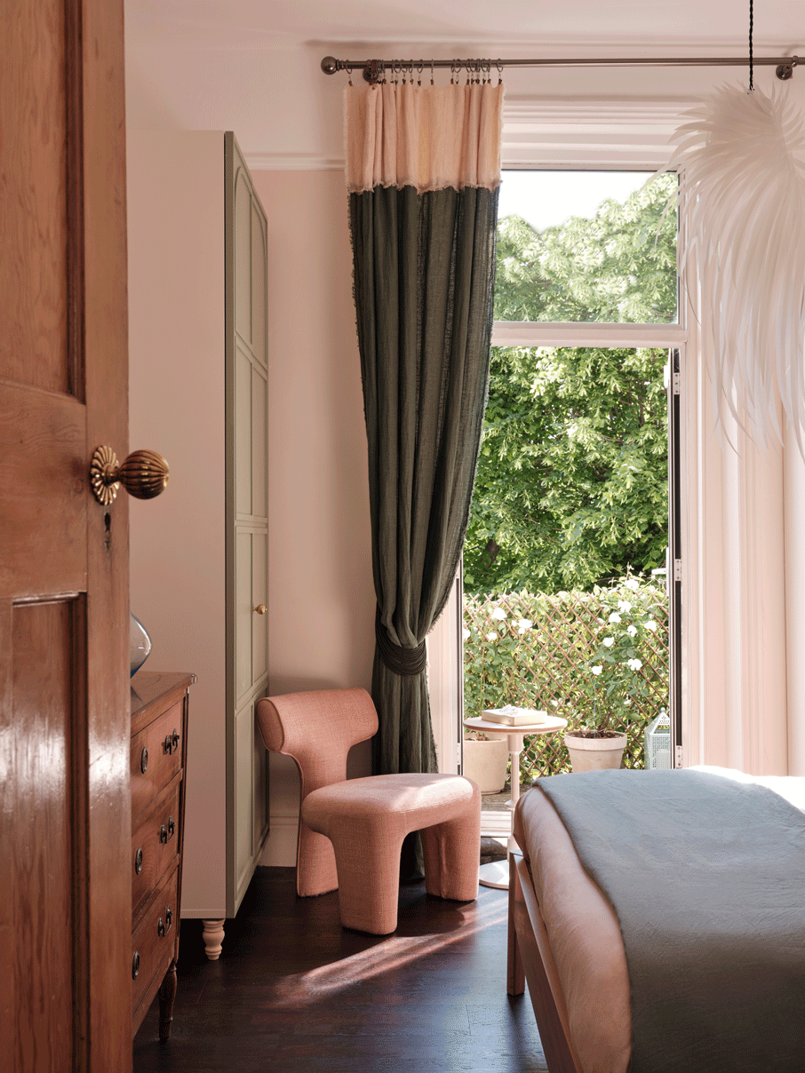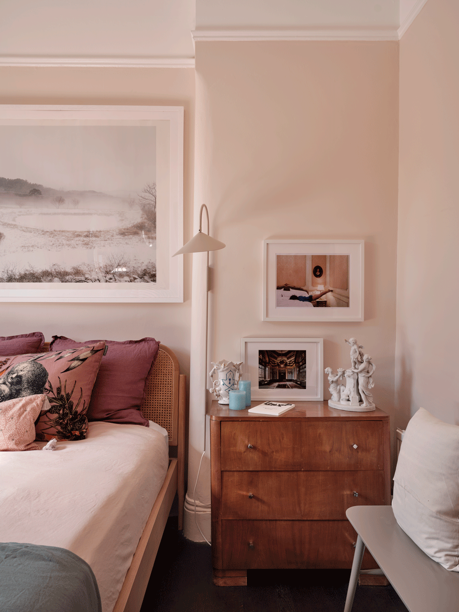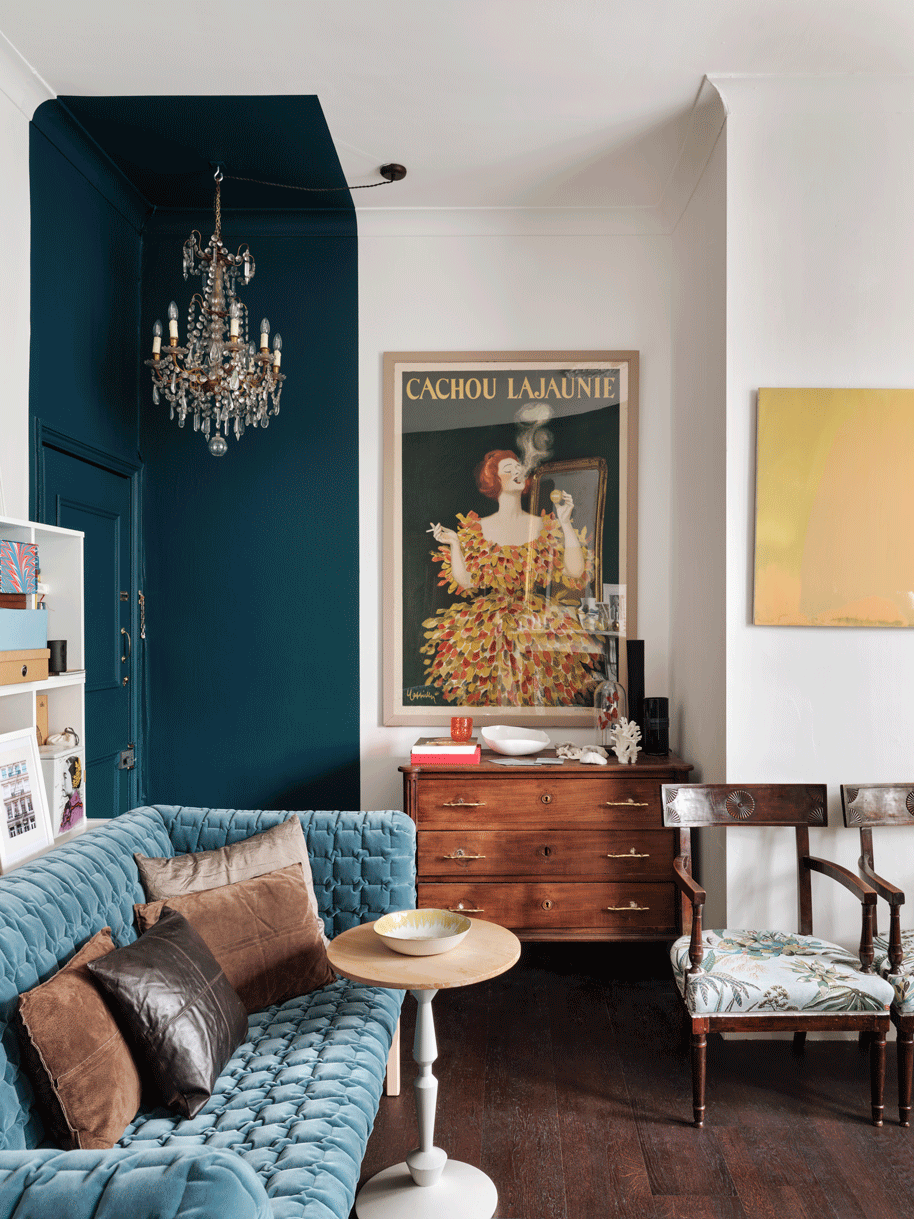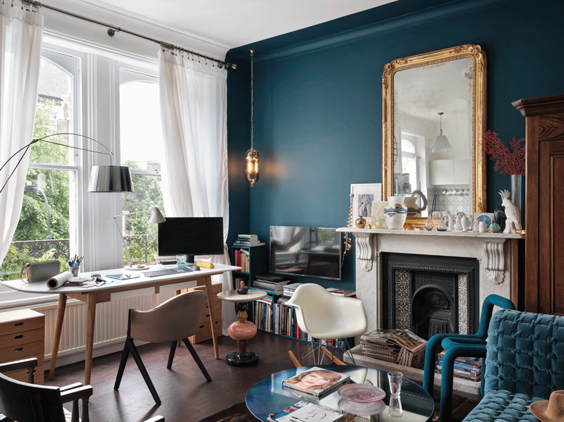 This typical Edwardian house shelters the gorgeous flat of an art amateur with all her objects & book collections. Each space it precisely decorated, a bold teal blue for the living area, and defining the entrance door and a natural and comfortable nude for the bedroom. Each space is overflown by light and sun and the balconies have been also renovated for the perfect break. Indeed, it's a work from home space so the dining table transforms it-shelf in a large desk overviewing the street.