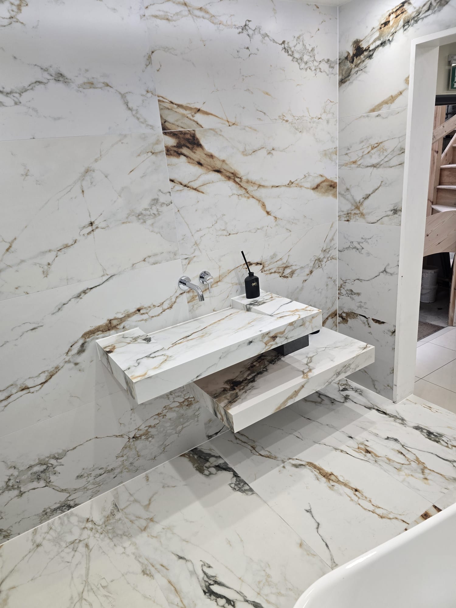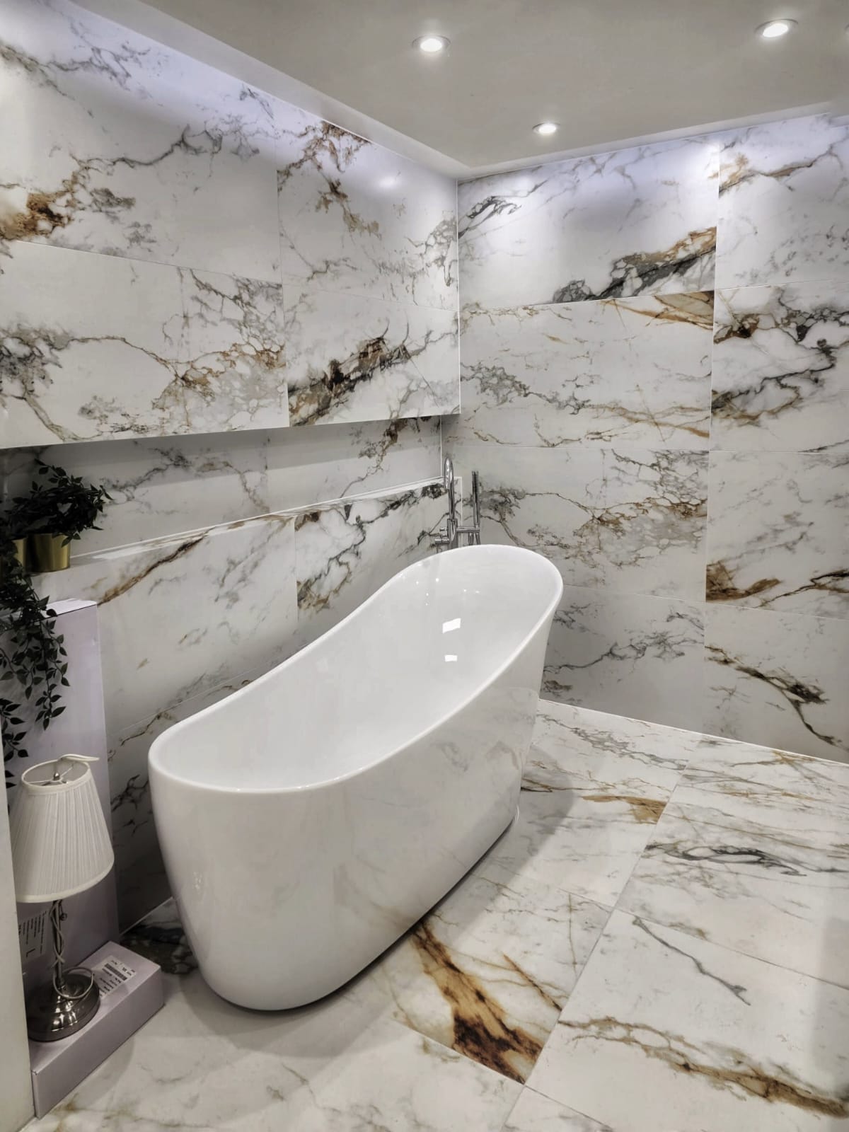 Transform your home or workspace into a masterpiece of elegance with Catania, the ultimate symbol of sophistication and timeless beauty. Featuring stunning white marble tones accented with striking golden veining, these tiles bring opulence and charm to every setting. We like this tile so much we have committed a large display in our showroom including stunning fabricated sink, shelf and niche.