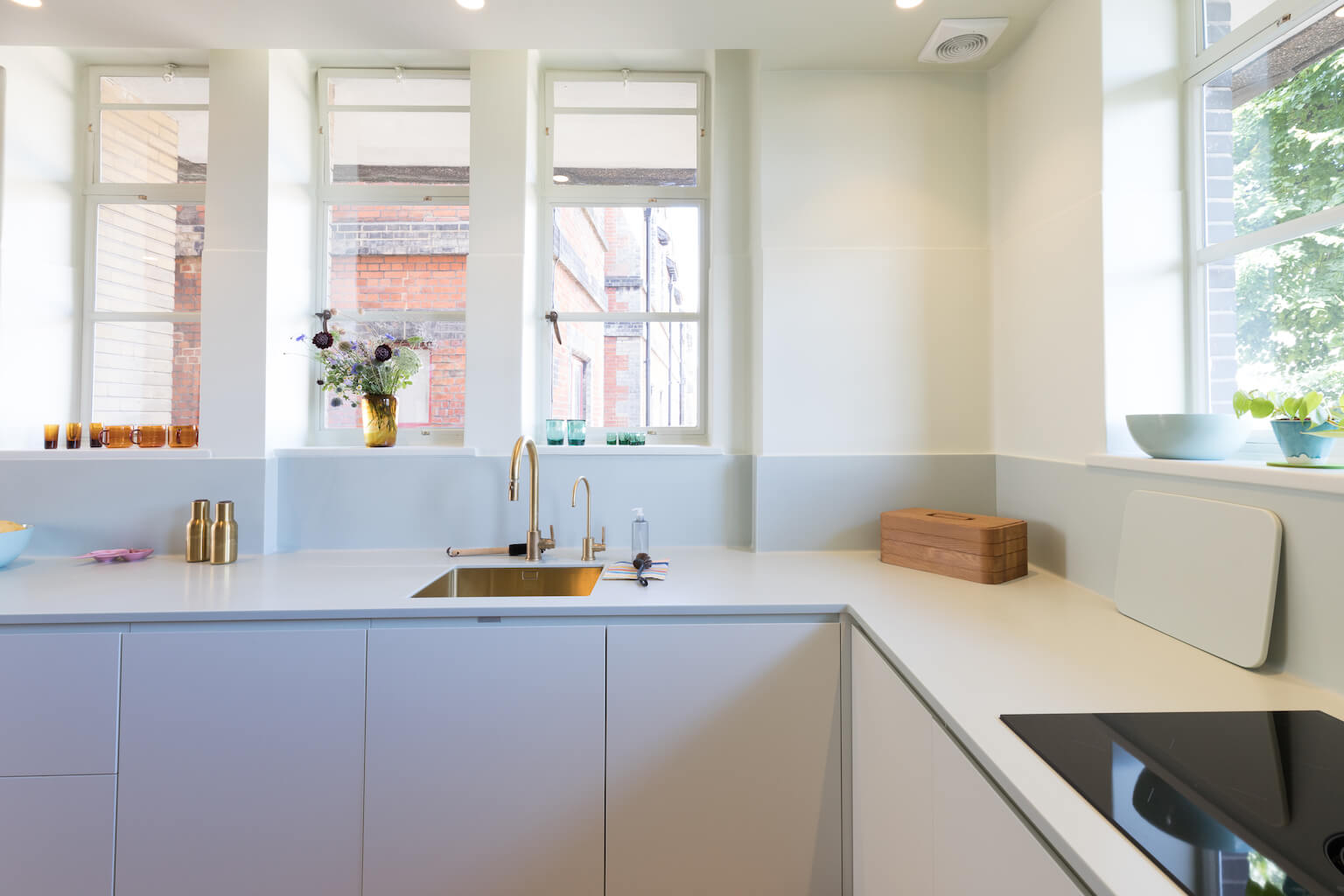 A stunning bespoke two-tone kitchen was fitted to a high standard, featuring marble and Corian worktops to work with the different cabinetry colours. Brass fittings, tapware and a sink were chosen to tie in perfectly with kitchen finishes, while also being used throughout the rest of the flat.