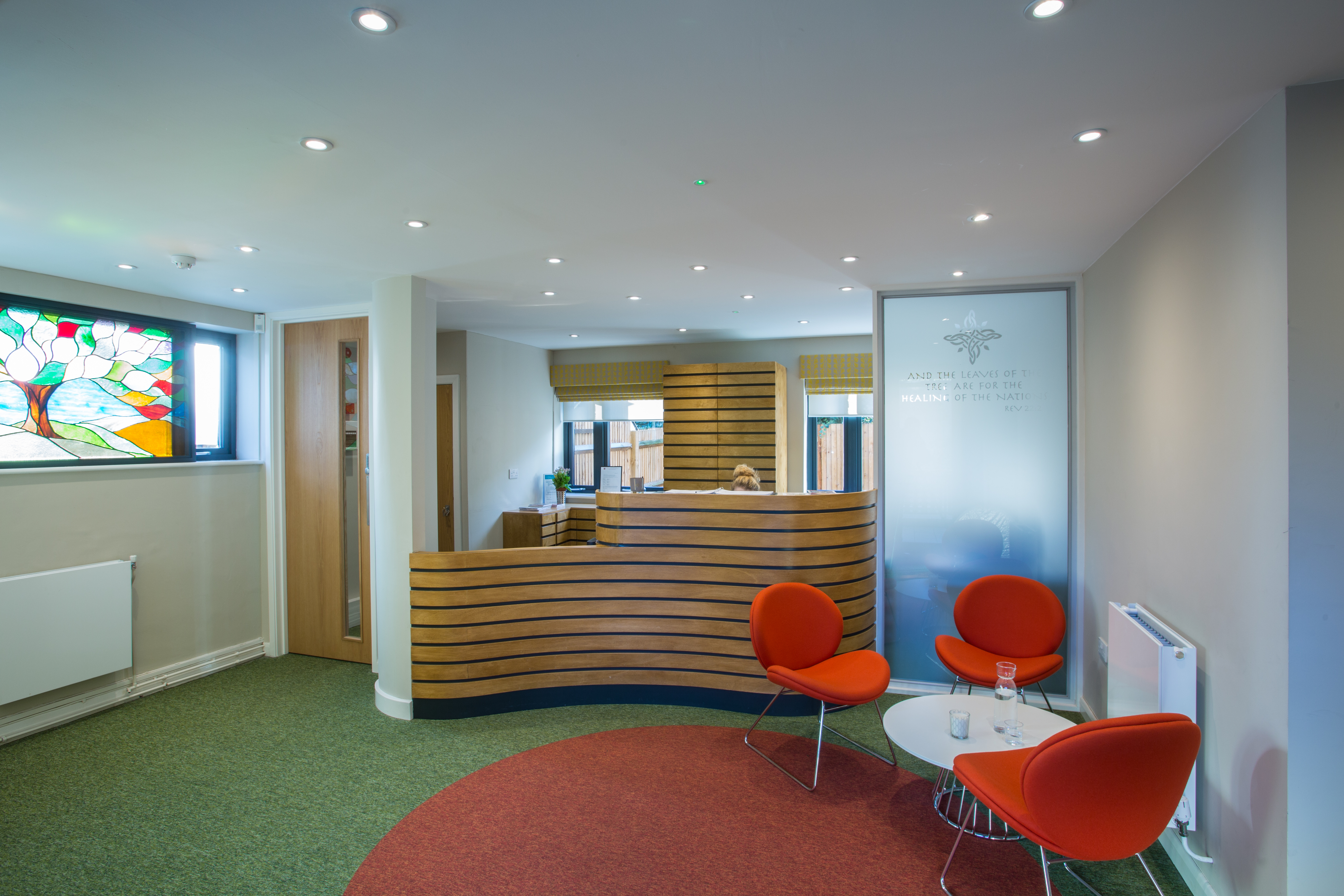 The priority was to open up the main reception area to create a welcoming open plan space; we achieved this through the use of curves, circles, warm colours and materials.
