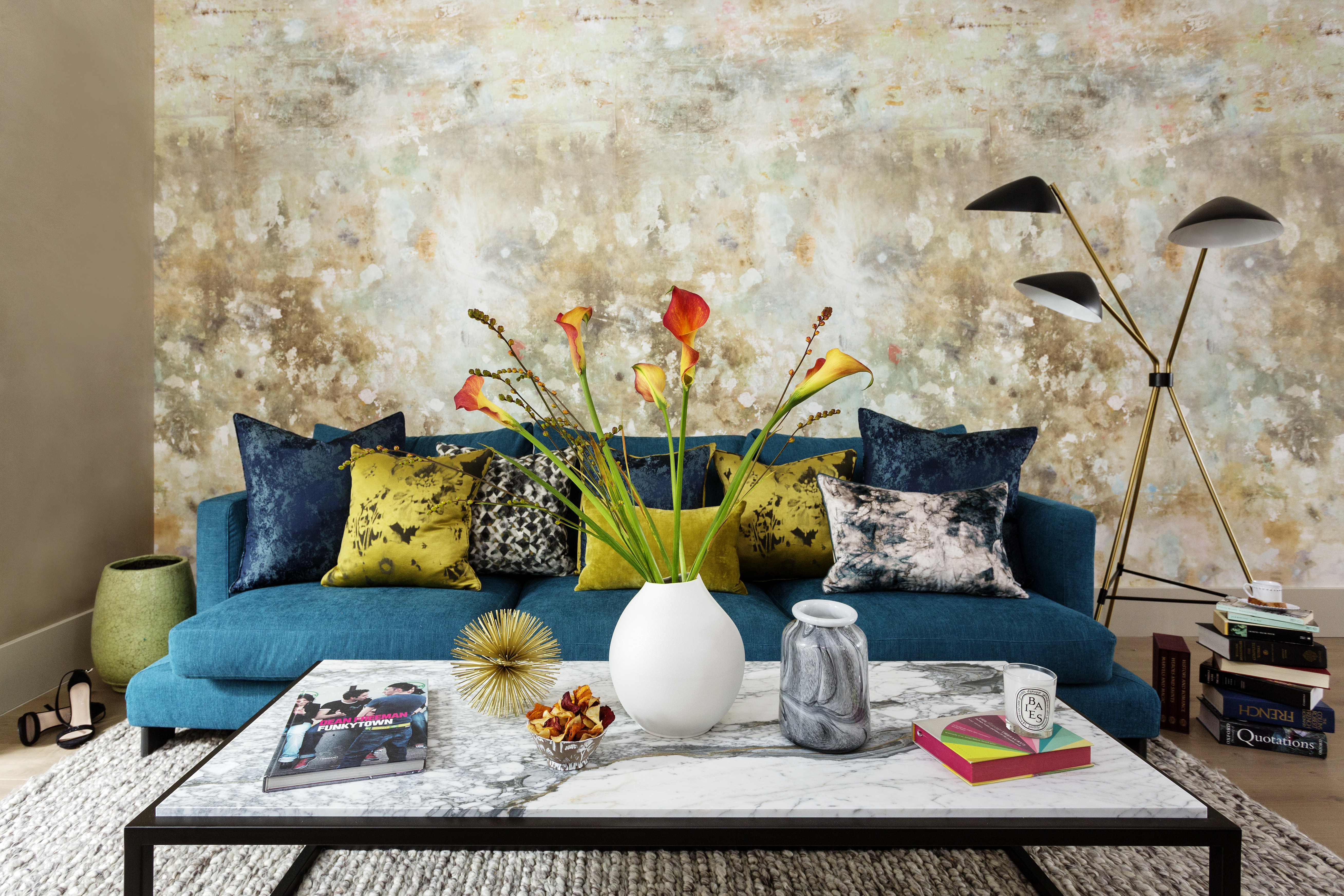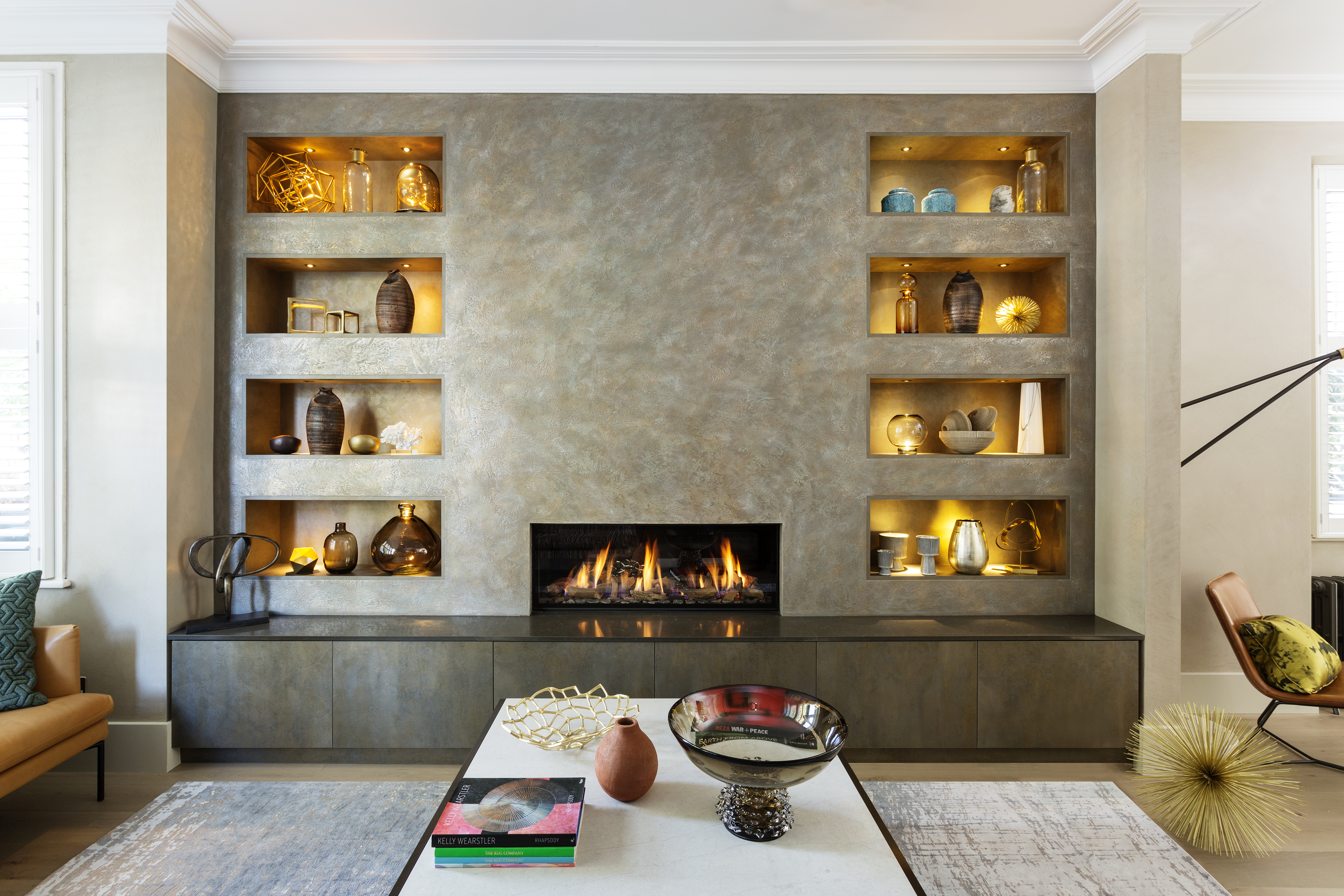 The design-savvy owners of a fashionable London shoe boutique, wanted to inject warmth into their Victorian family house whilst adding character and trendy Scandinavian style. Floor-to-ceiling Crittal doors open onto a formal sitting room to the side, with the dark, graphic lines of the frame echoed through a statement steel and glass quad pendant and simple black linear furniture and accessories. A stunning butterscotch polished plaster wall with an inset fireplace, symmetrical backlit shelves and dropped down low cabinetry designed by HUX London sets a striking tone. Colourful, contemporary furniture, stylish lighting and interesting art, accessories and objet complement the eye-catching backdrop. A vibrant teal sofa sits against an abstract wallcovering contrasting with the space around it. The room is filled with iconic design pieces and modern furniture defined by simplicity, subtle sophistication and clean lines. A polished concrete floor, white walls and an exposed brick feature wall combine to create a stylish setting for the sleek matt charcoal kitchen cabinets, which are topped with white marble worktops. A chic mustard-coloured sofa and simple, black-framed furniture and lighting create a cosy and cohesive scheme. The result is a contemporary yet relaxed entertaining space and the warm tones of the timber balancing beautifully with the exposed brick opposite.