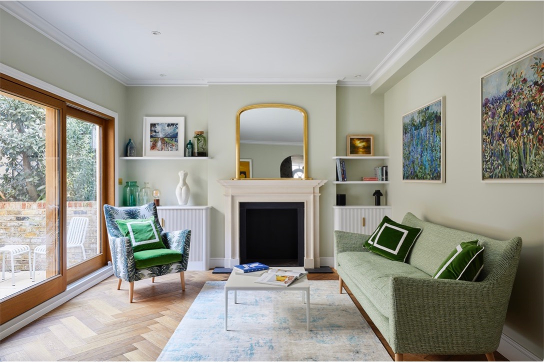 Hardwood floors in a herringbone pattern run throughout the entire ground floor. The existing fireplace surround was removed and a classic limestone mantle from Chesney's was sourced to act as a feature and focal point in the room. The tired and draughty French doors at the rear were also replaced with a contemporary sliding system, finished in Oak which was paired well with the flooring.