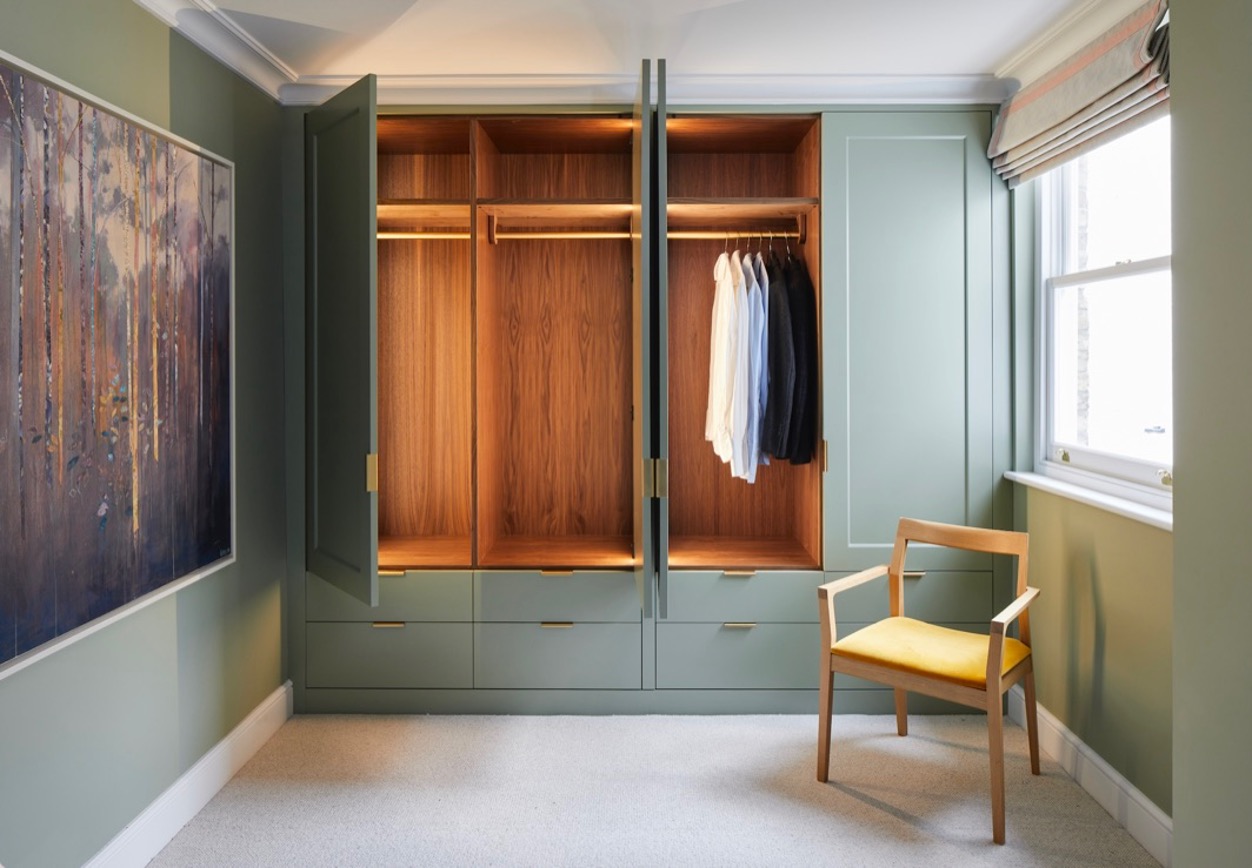 Bespoke joinery was designed and built throughout, including the kitchen. This was handmade in our workshop and was constructed of Ash door fronts, with the inside of the cabinetry finished in Walnut. A rich Calacatta marble was sourced for the worktop, with the subtle hints of gold and green in the stone being reflected by the brass handles and green of the overall scheme.