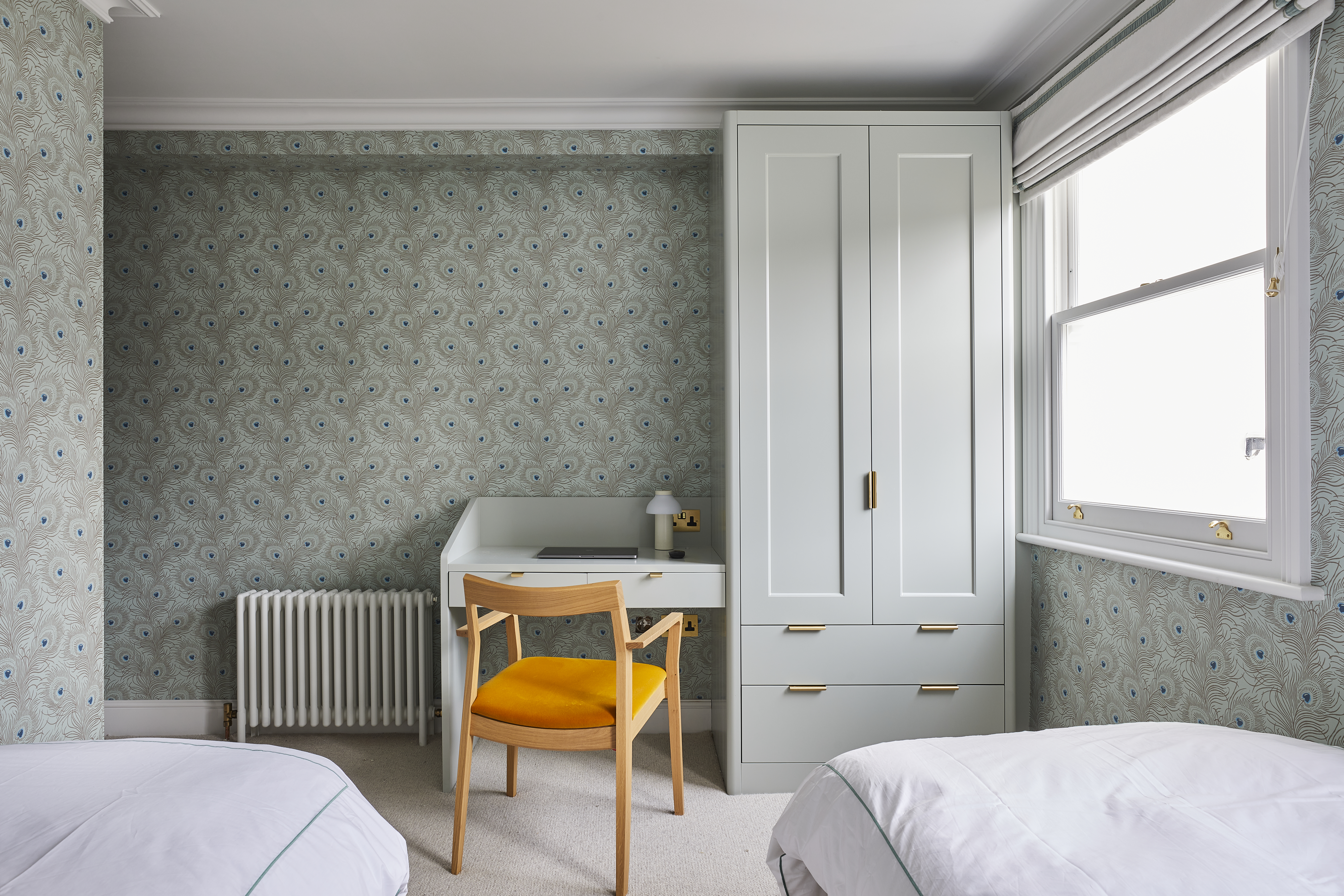 Some alterations were made to the layout, reconfiguring bathrooms and creating a new utility / WC area on the ground floor. Structurally, a new staircase was also designed and installed. The previous stair incarnation had dated, mock Victorian spindles. Huntsmore proposed contemporary black steel spindles with a slimline oak bannister running top to bottom. These black spindles were complemented with a green and black Roger Oates stair-runner and an off-black 'Fern' wallpaper from Little Greene.