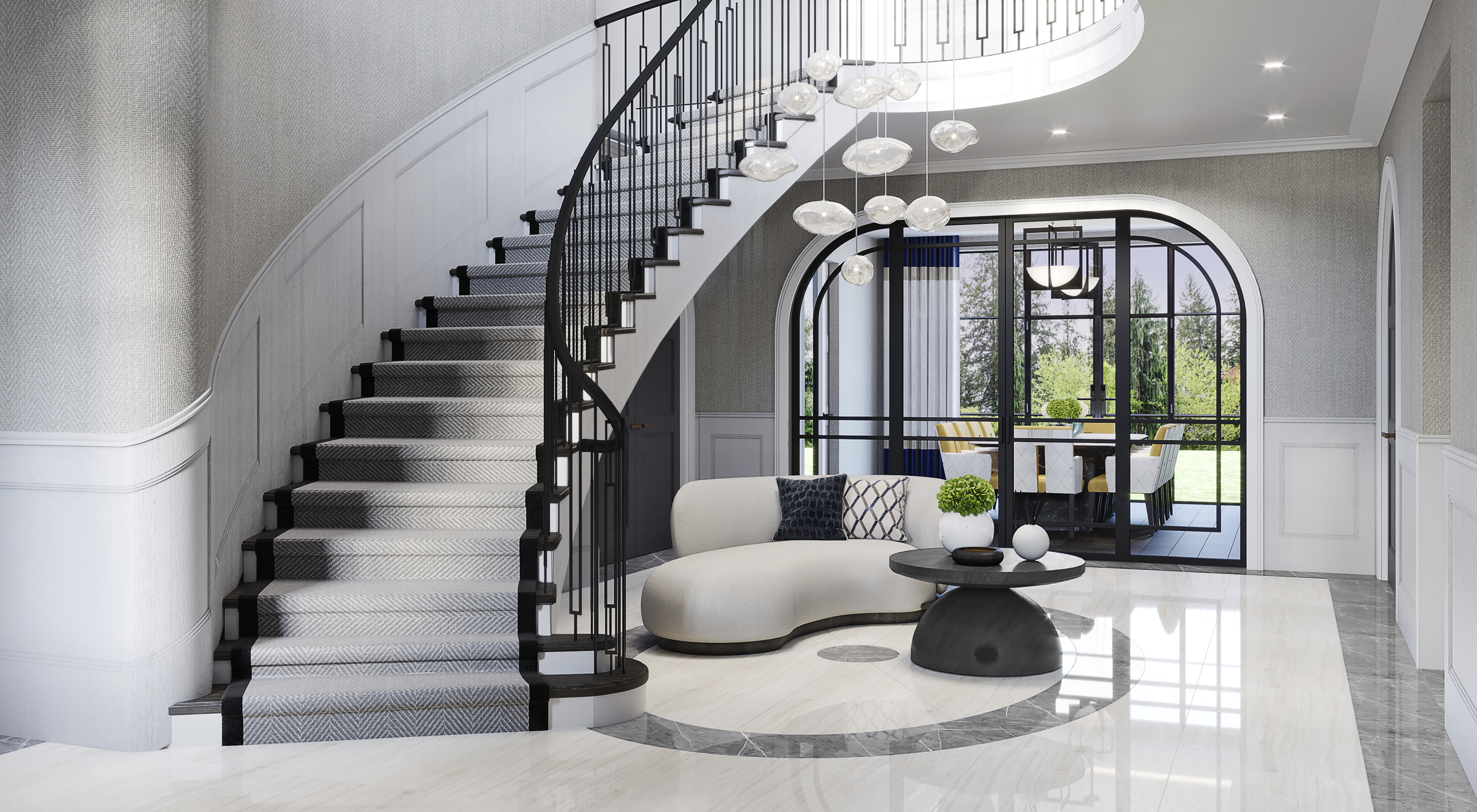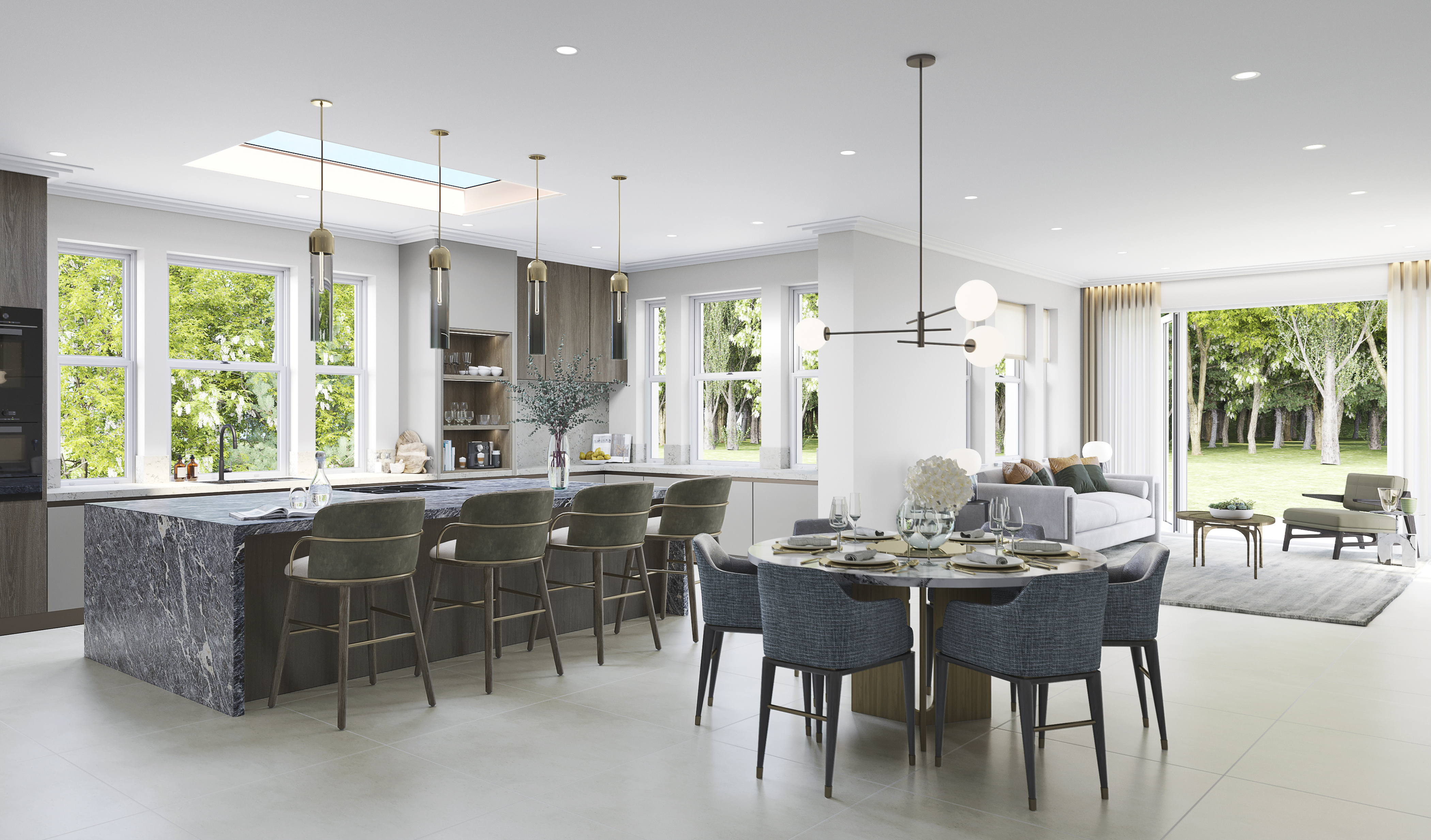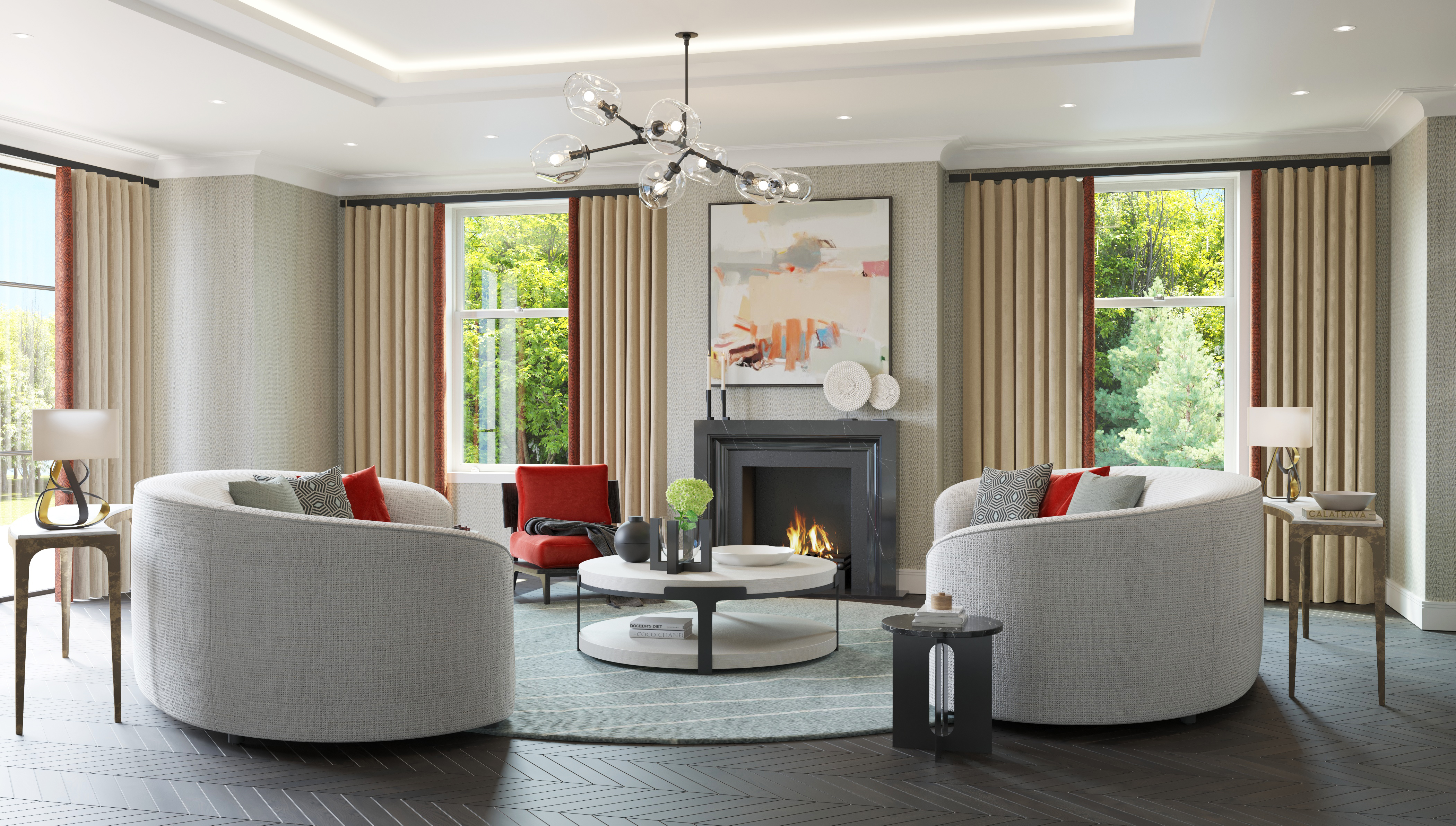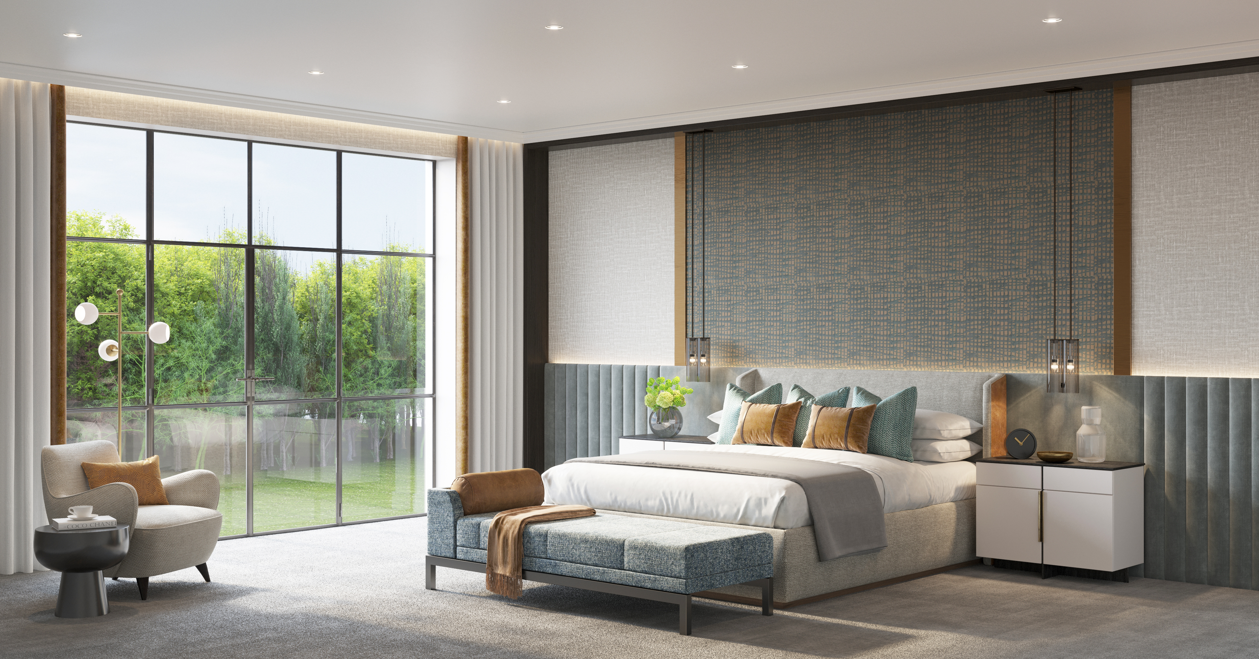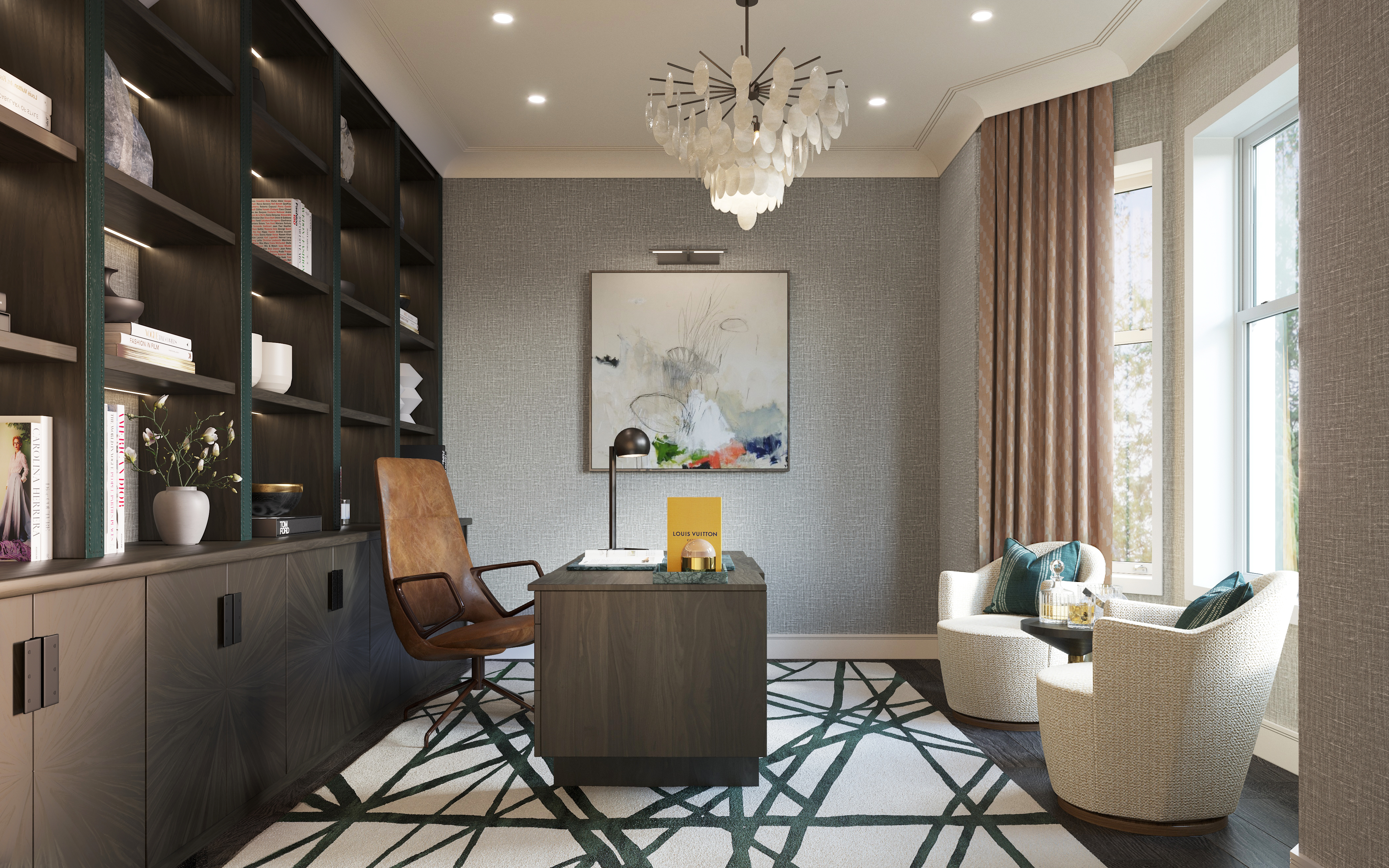 You are here: Q Design House project Contemporary Home in Surrey See Q Design House profile This spacious and contemporary home is dramatic design using texture, colour and simplicity to create a striking scheme. Gallery Beautiful and bright en-suite with separate shower area, bathtub and twin sinks Master bedroom filled with bespoke materials and unique pieces Modern living area pairs curved sofas with circular rugs and coffee tables, to create an inviting and sociable seating space This study, with beautiful wood joinery and green leather details, matches contemporary styling with striking design Modern kitchen with symmetrical layout, low level lighting and lots of timber details to soften the space Light and spacious hallway contrasts light with darker colours to give a sophisticated space