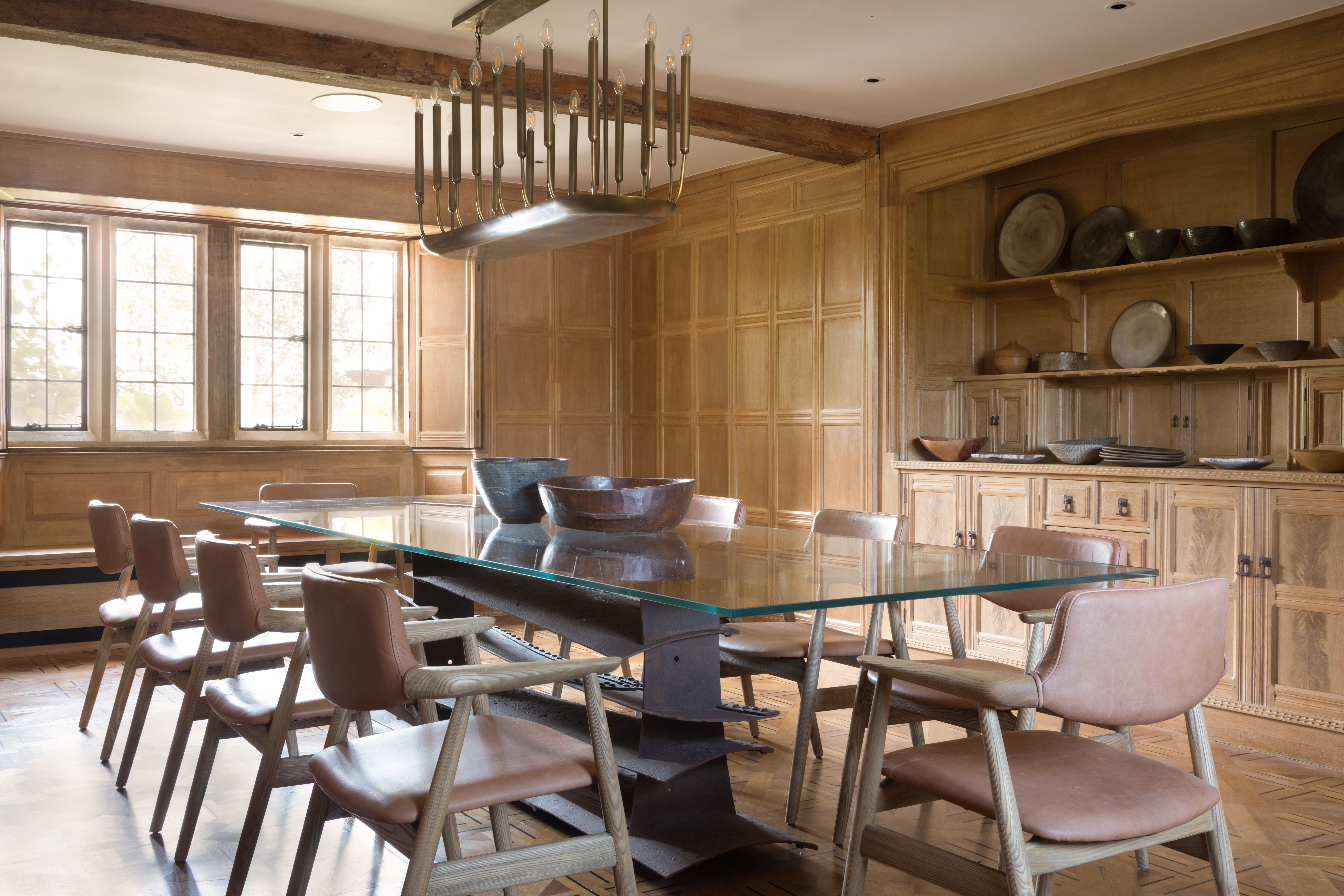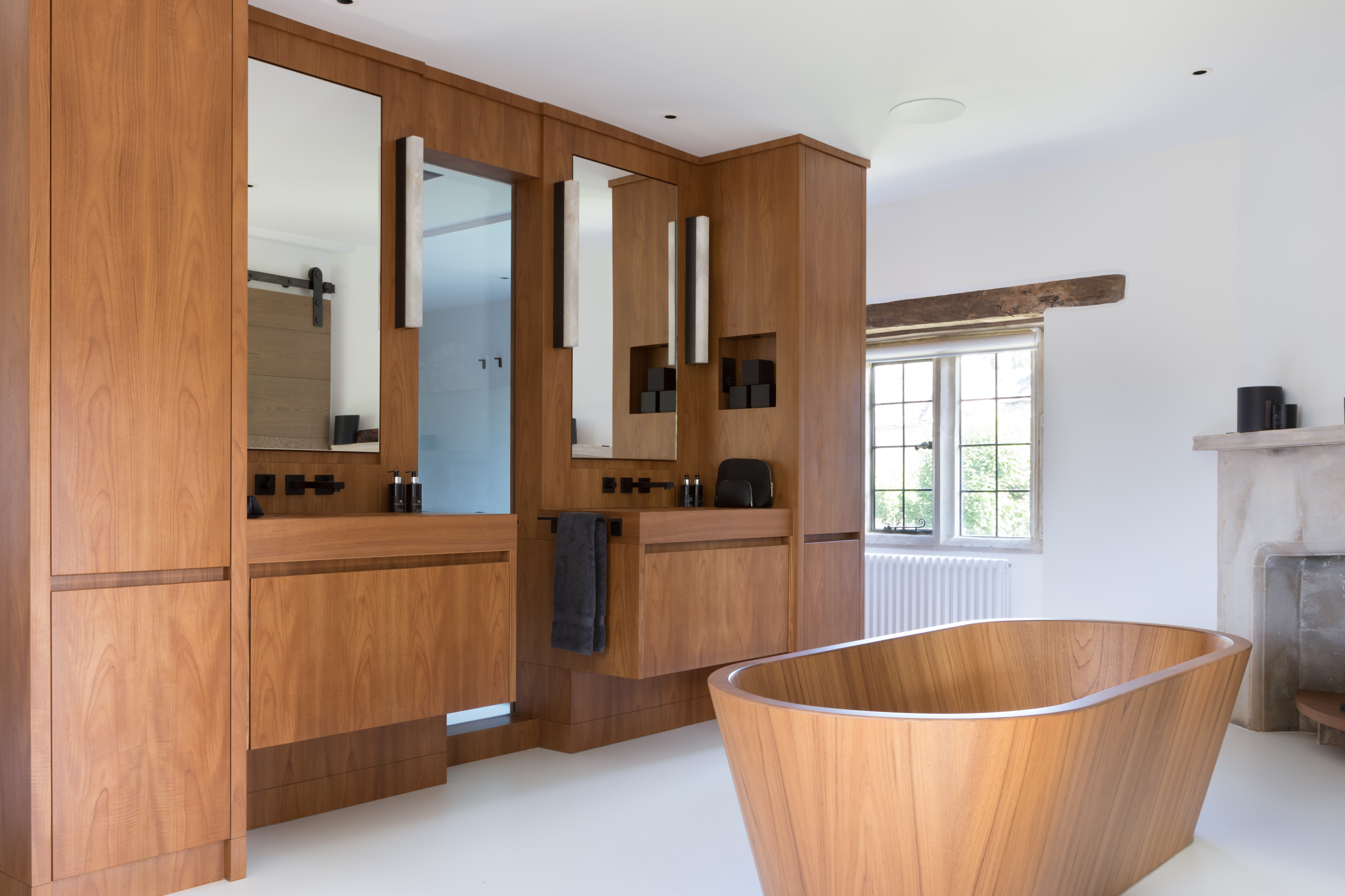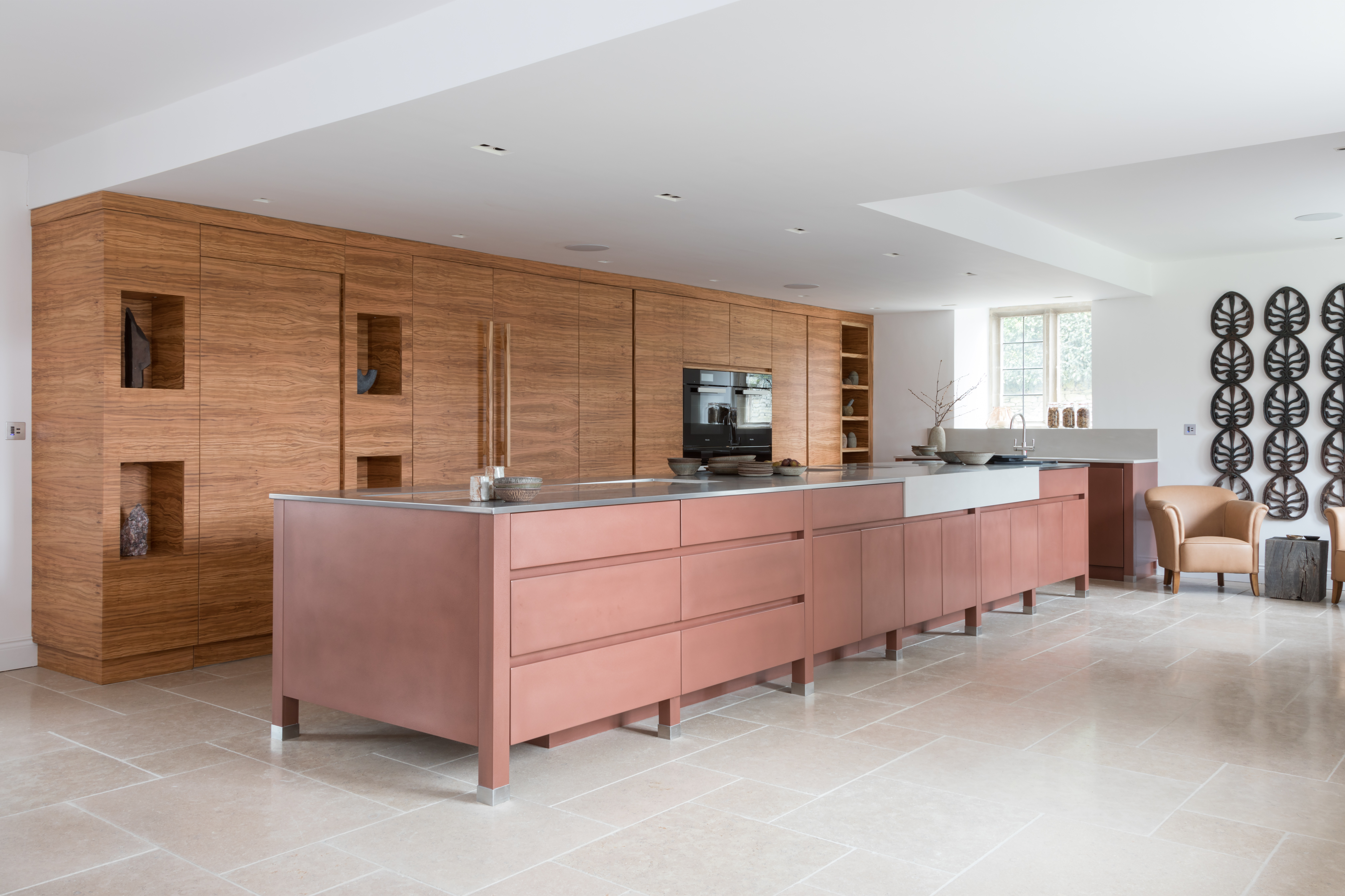 The design concept fuses contemporary and traditional materials whilst exposing and enhancing the traditional fabric of the building. Particuler areas included creation of a bespoke kitchen incorprating dining and sitting areas, creating a double height master suite by removing an upper floor bedroom and converting an old indoor pool house into an industrial-style gym. Textural layers and a softly neutral palette throughout provide a background against which the owners' collection of contemporary sculpture and eclectic artefacts are beautifuly displayed.