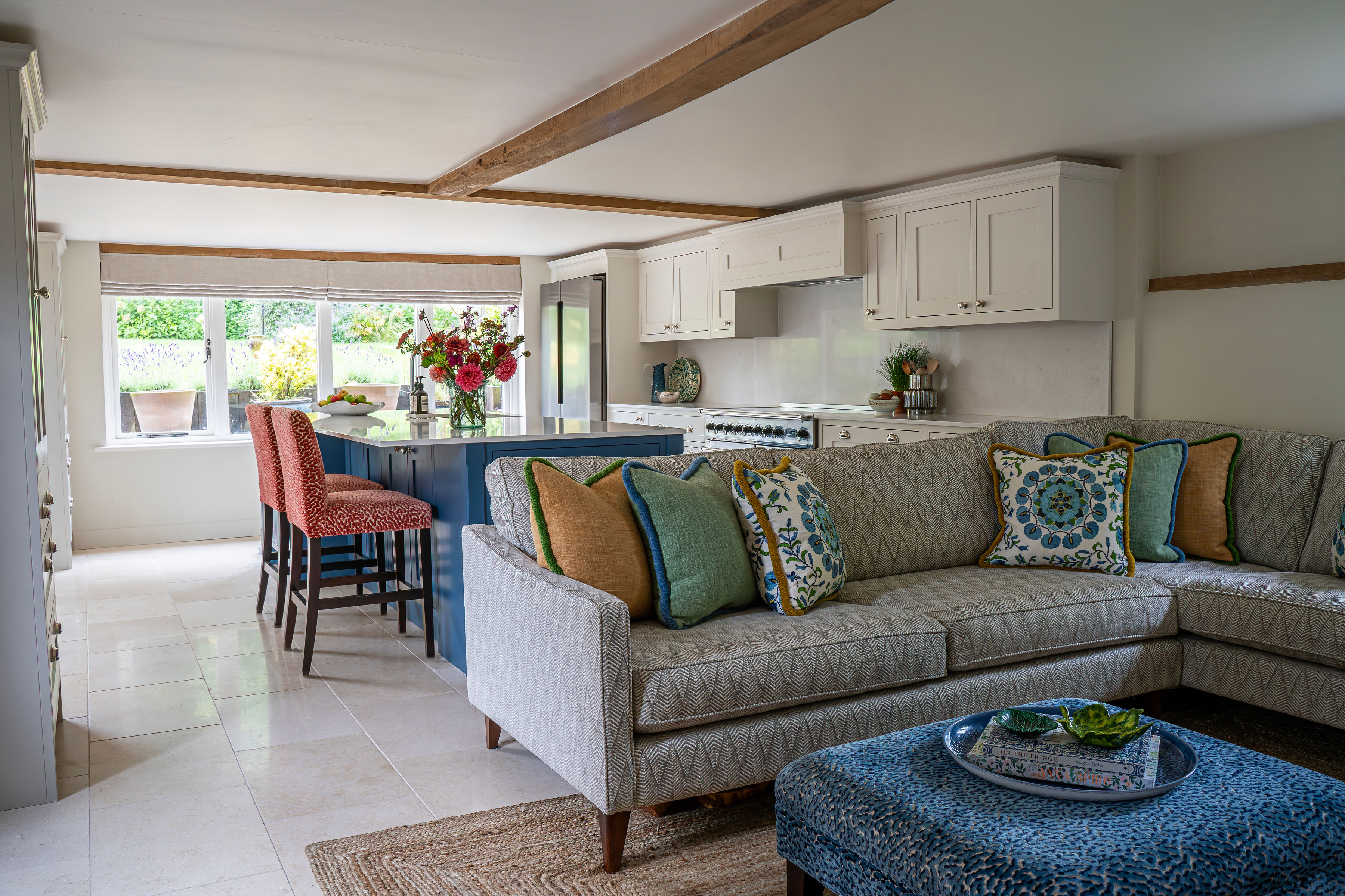 For the full refurbishment of this 19th century barn we delivered turn-key decoration in collaboration with local craftspeople. Taking into account the original architecture, soft country colours were paired with warm, inviting fabrics and trimmings to reflect the harmony of the setting. A second barn was built attaching both properties with a contemporary glass link, adding a layer of modernity to the design.