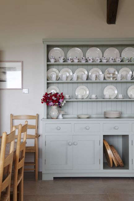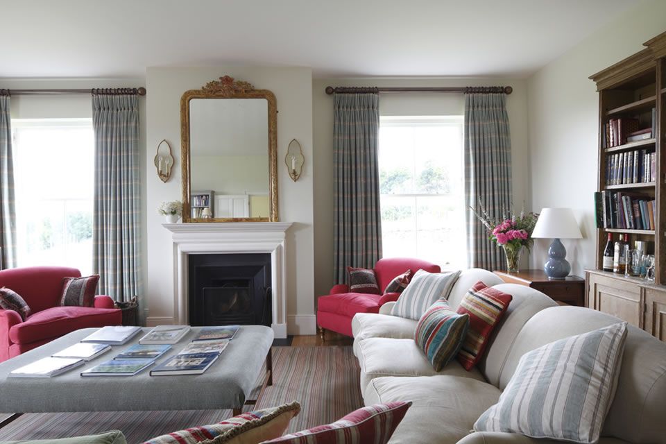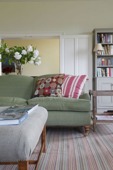 The palette of colours are pale greens, pale blues and greys – these colours reflect the light from the sea, and are counterbalanced with splashes of red and terracotta. The decoration has been kept simple – plains, stripes and checks have been used. Interesting pottery – some of which was bought at an Antiques fair in Bath - prints found in Dublin, and other works of art add warmth and interest to the neutral background colours.