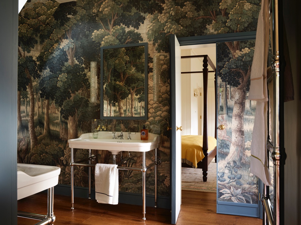 The Master Bathroom was a walk-through space between the Master Bedroom and Dressing Room and so needed some personality in order to hold it's own. This was done successfully with some printed tapestries which also cleverly hid the angles of the room in the tree design.