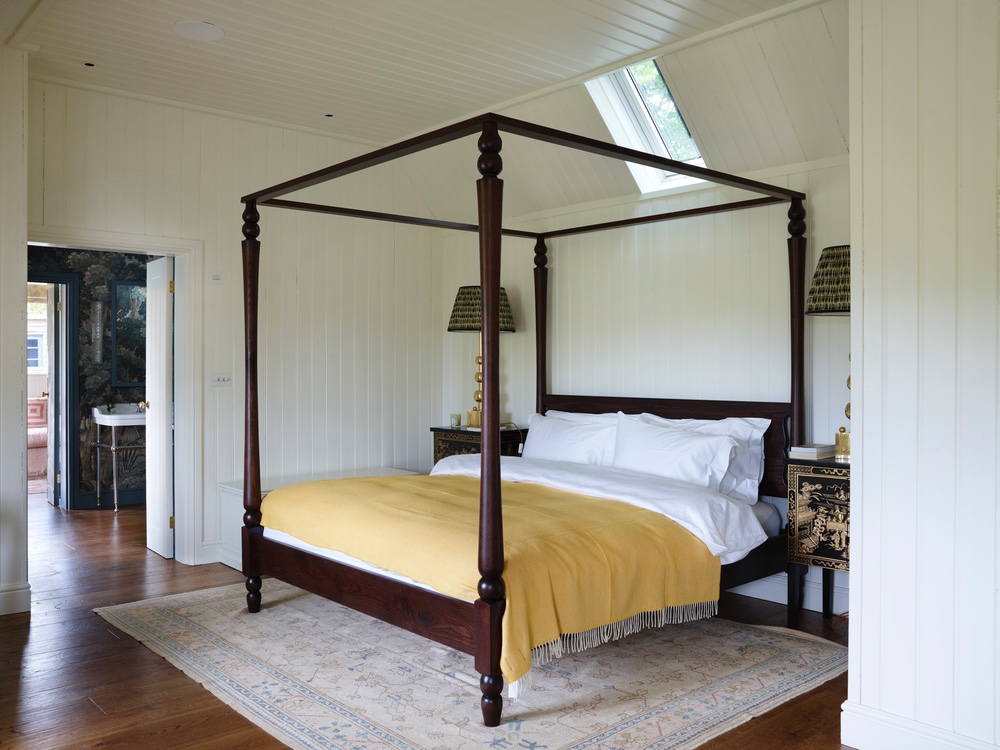 Some antique panelling was installed to create a gentleman's club-style dining room and we commissioned some very lovely bespoke sofas too. The guest bedrooms needed some extra pattern and warmth and so we sourced a pair of antique Moroccan pediments and created a pair of half testers which Soane fabrics.