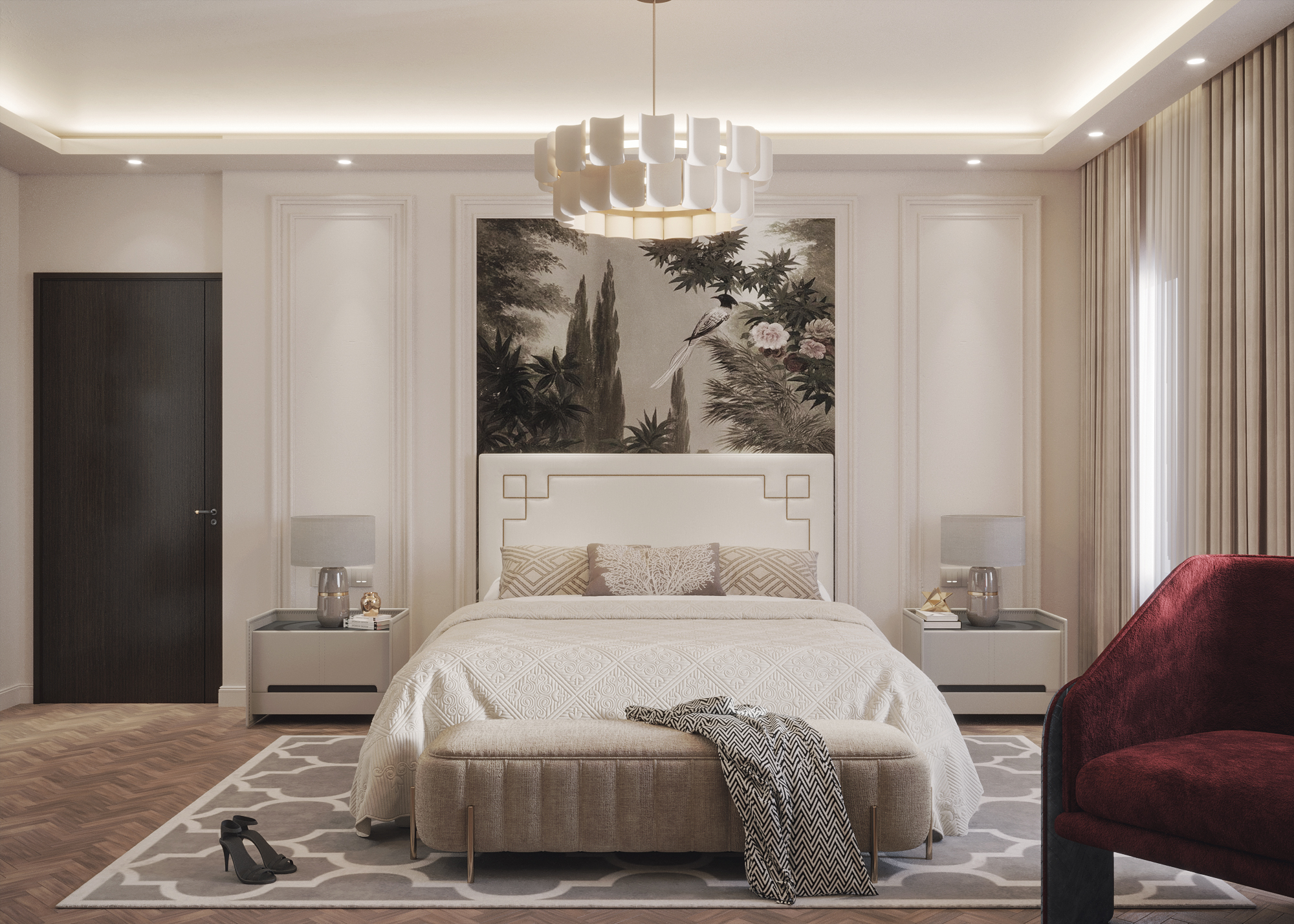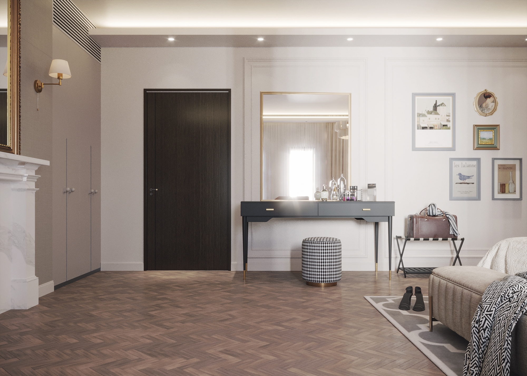 Our team had the opportunity to create a sample room design mock-up for the Courthouse Hotel, situated in the heart of London. This project presented a unique challenge as we needed to honor and preserve the protected elements of the space, such as the original flooring and signature fireplace. To achieve a harmonious fusion of tradition and contemporary aesthetics that befit the grandeur of this establishment, we incorporated paneling to the walls. This design approach resulted in a timeless and sophisticated look that reflects the character of a building of this caliber.