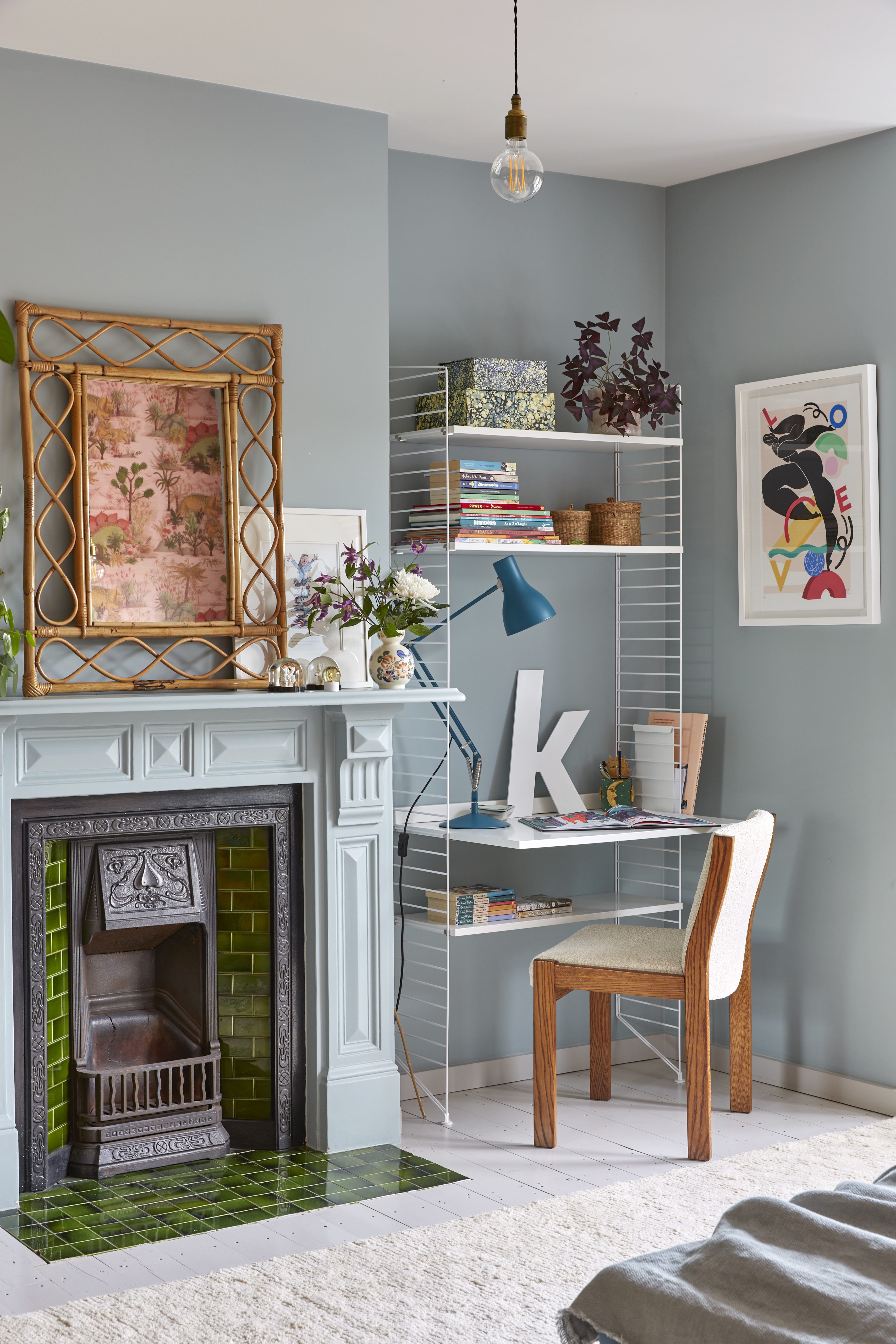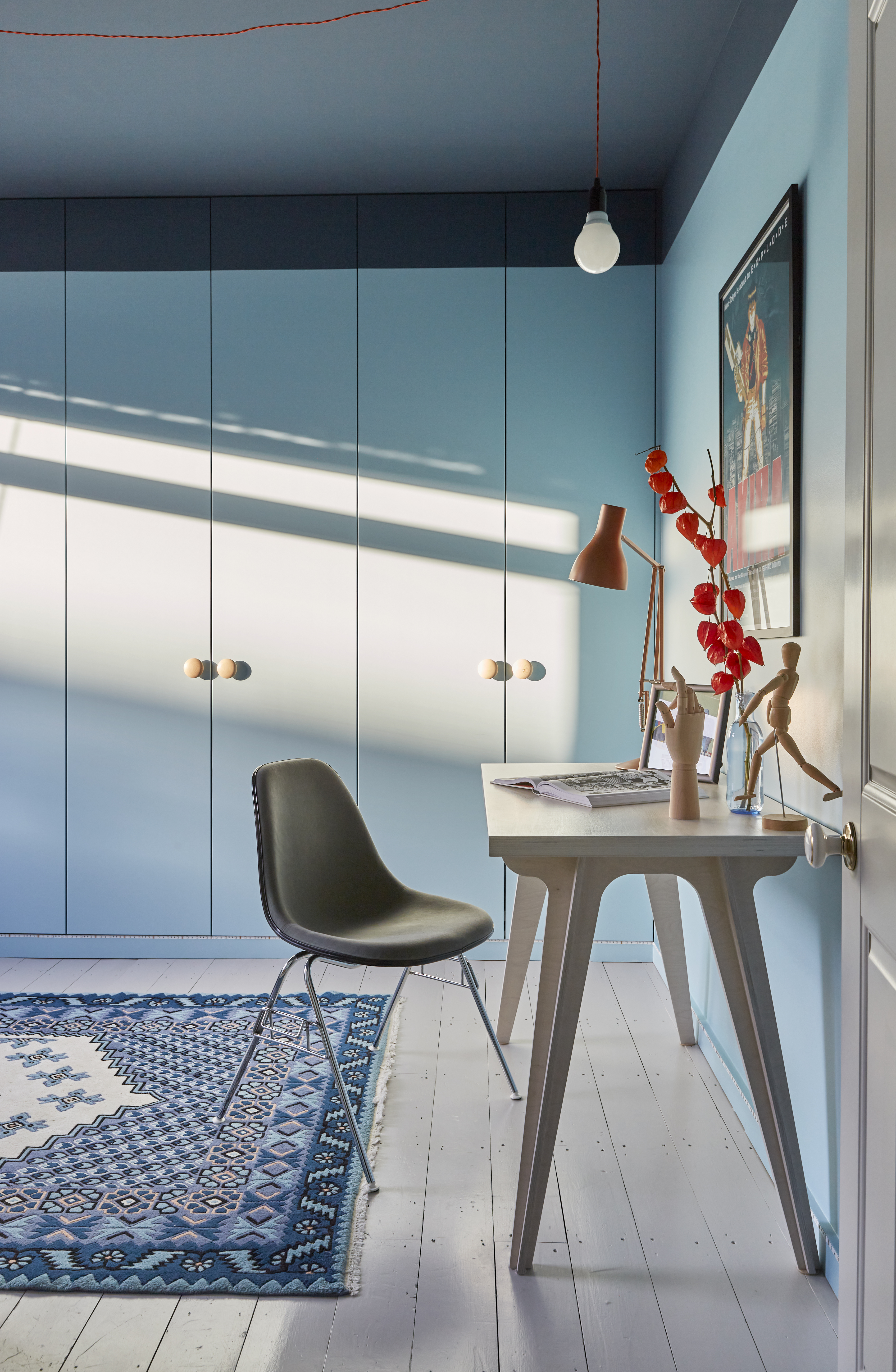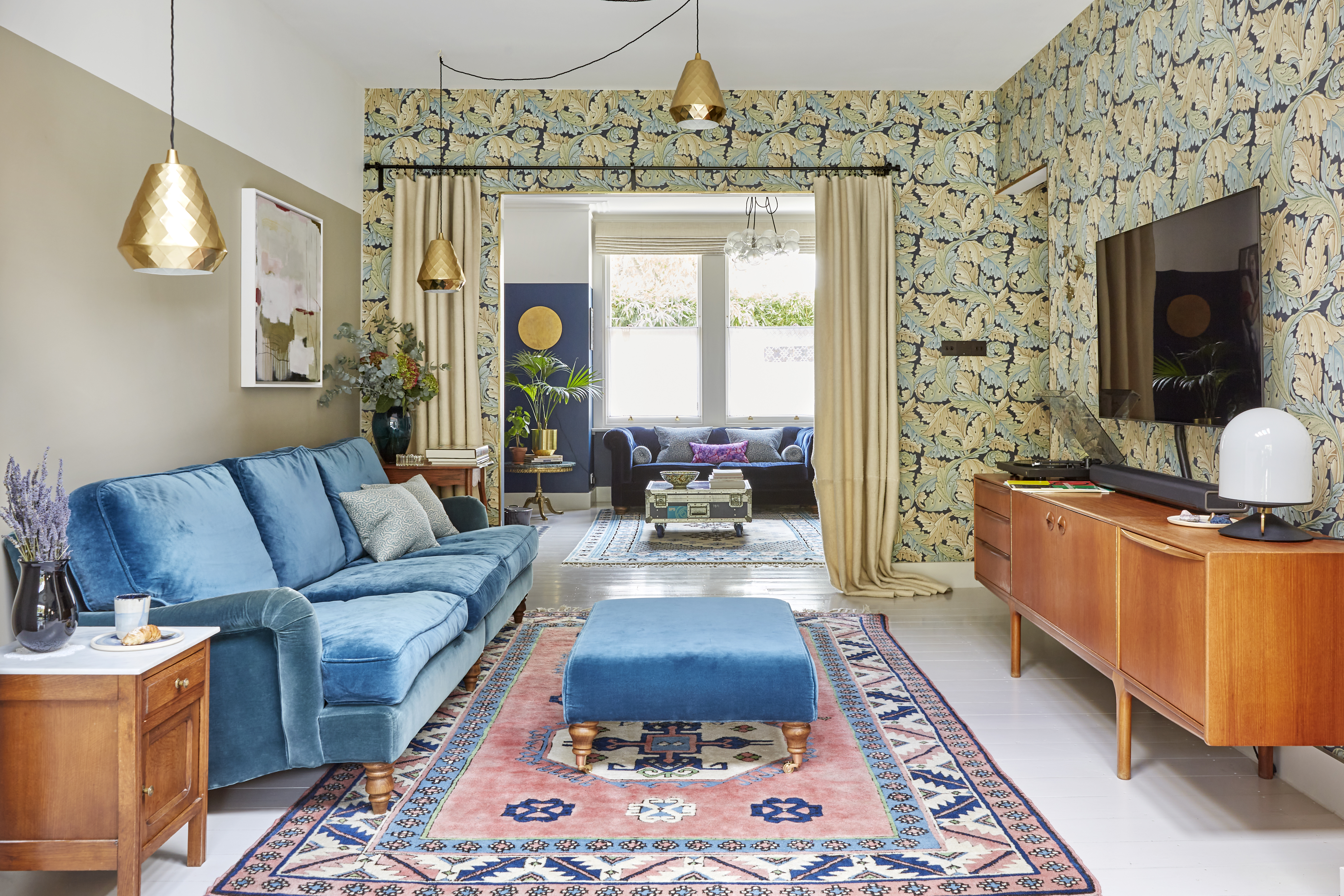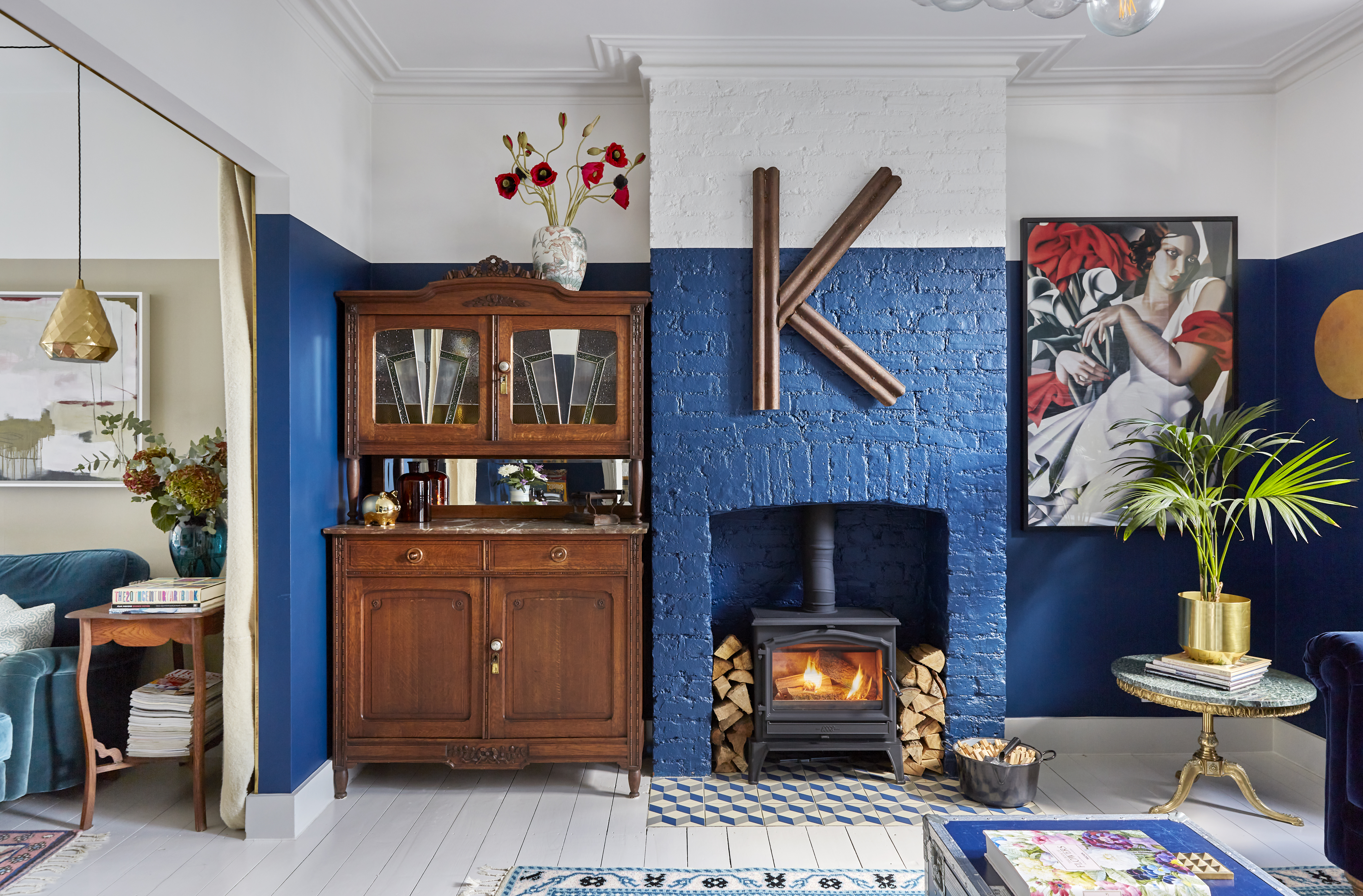 A complete overhaul of an Edwardian home that hadn’t been touched since the 1950s, requiring renewed plumbing, electrics, ceilings and walls, as well as an extension and loft conversion. A palette of blues underpins a blend of vintage finds, graphic shapes and quirky design motifs. Exposed brick detailing nods to the architectural roots of this home, whose ground floor has been extended to house a kitchen-diner suitable for family living, while two living areas have been opened up to one another. We also reworked the original kitchen into a separate downstairs cloakroom and a discreet laundry. Texture plays a key part in this renovation, from micro cement and aged brass finishes, to a modern take on classic encaustic tiling via a contemporary graphic geometric for the hallway flooring.