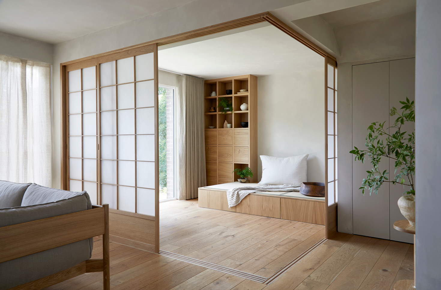 Set in a quiet neighbourhood in Ealing, a couple from Hong Kong approached us with the blank canvas 1960s house to start the new chapter of their life in the UK. Tailored to appreciators of Japanese aesthetics, a blanket of oak and lime wash creates a minimal yet tactile background while shoji screens and Tatami mattresses remind them of their favourite holiday destination.