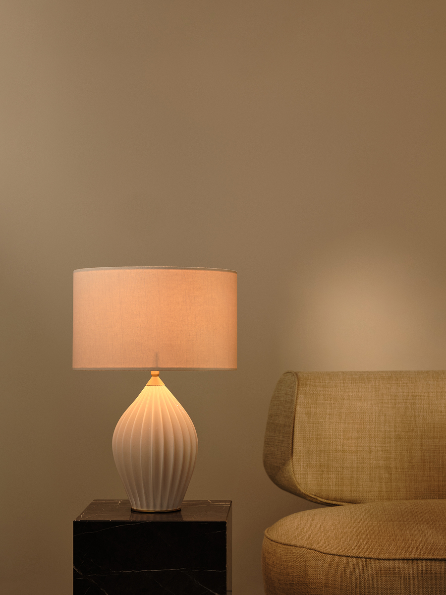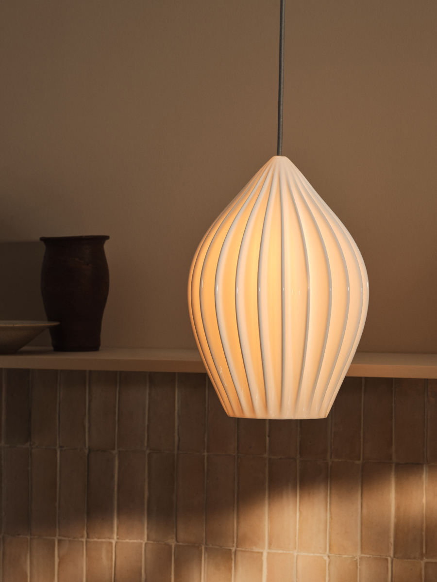 Deceptively simple when switched off and beautifully intricate when on, the Fin collection is a celebration of one of nature’s finest and most versatile materials – bone china. Hand slip-cast in Stoke-on-Trent, the Fin is created using a complex eight-piece mould. Liquid clay, or slip, is poured into the mould and allowed to set, then each segment is painstakingly peeled away to reveal the ribbed form, ready for firing.