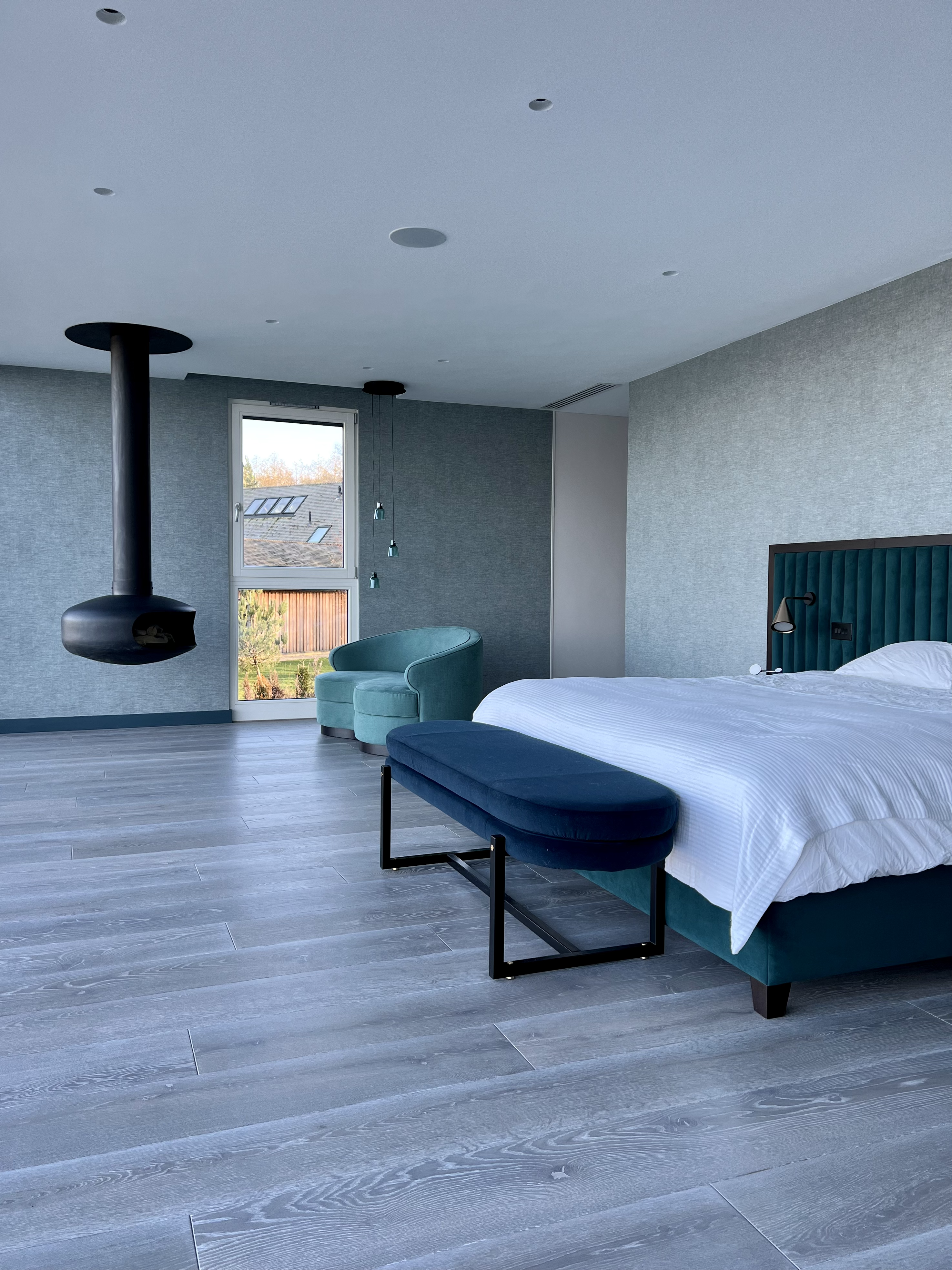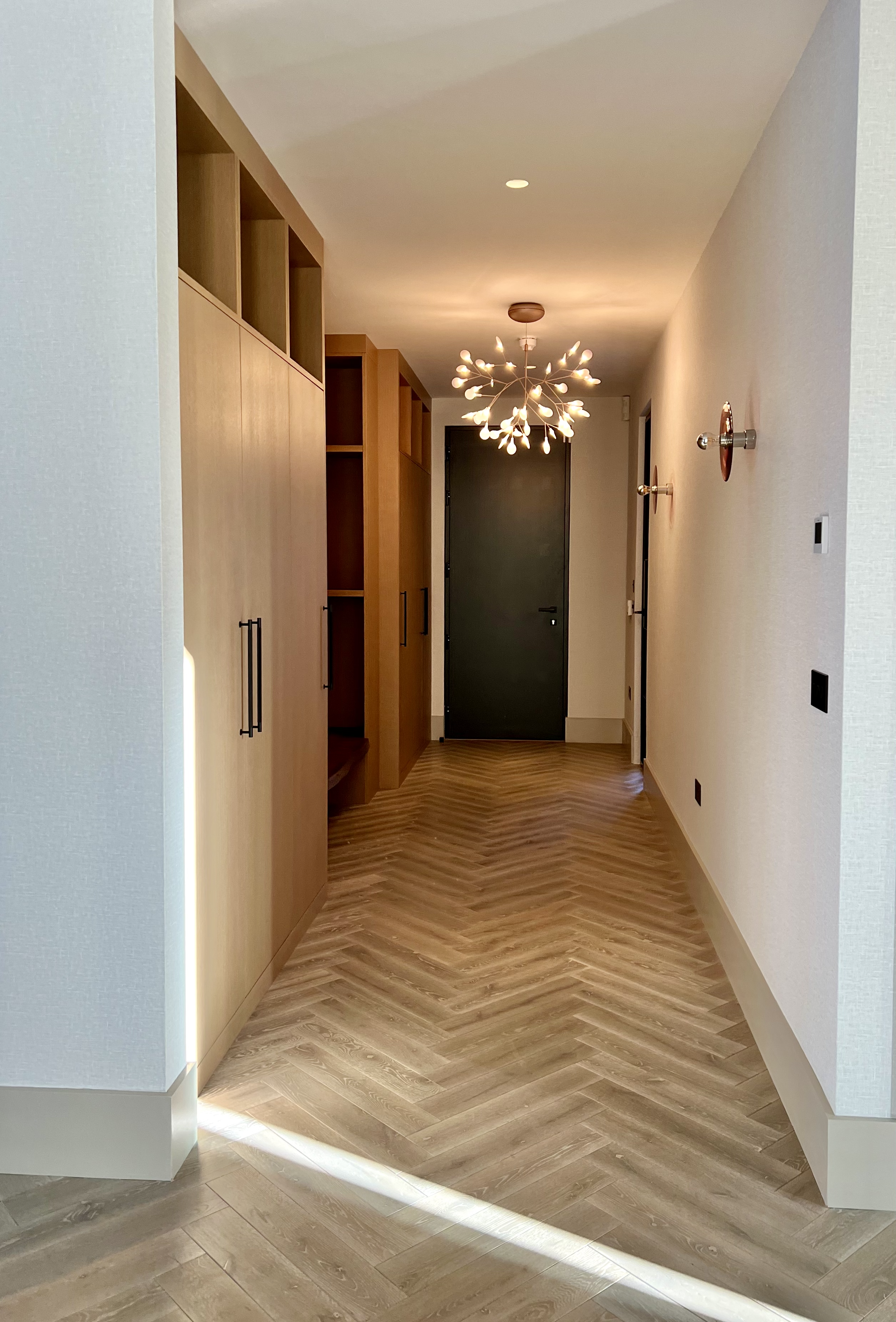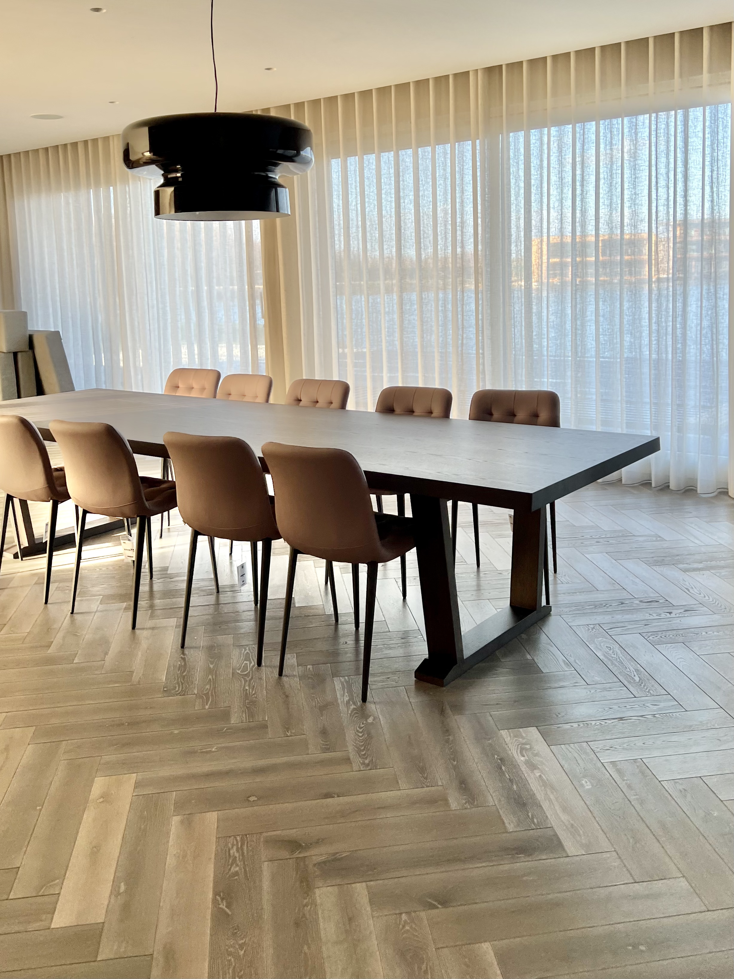 The interior of this second home, the lake house project, was created by Hamilford Design. Throughout the house, Ecohardwood Contractors installed herringbone parquet and planks using double oak engineered wood flooring that was tailor-made at Ecohardwood's state-of-the-art factory in Ocean Breezecolour.