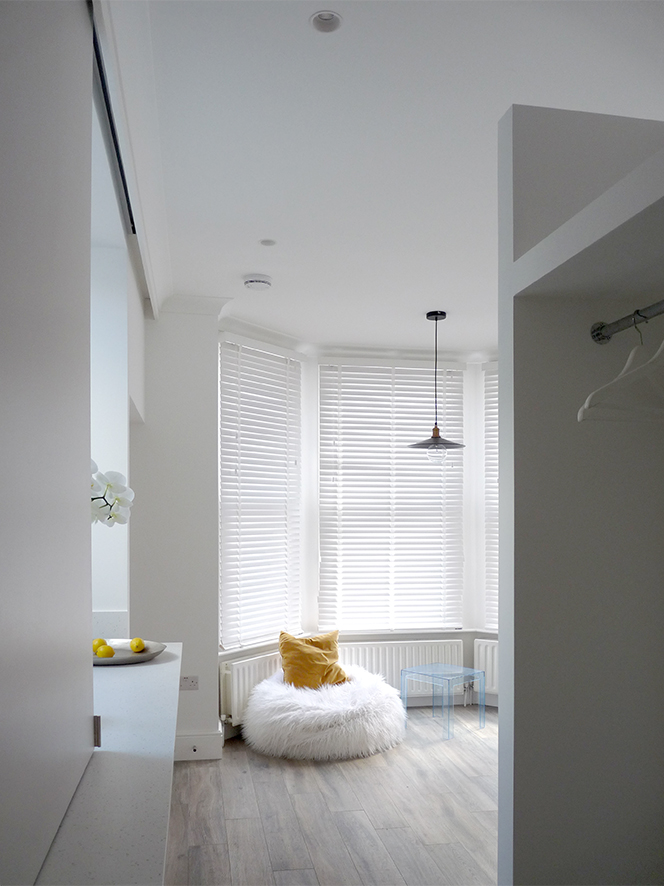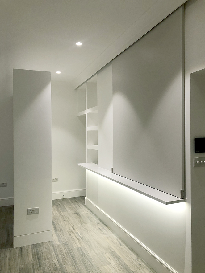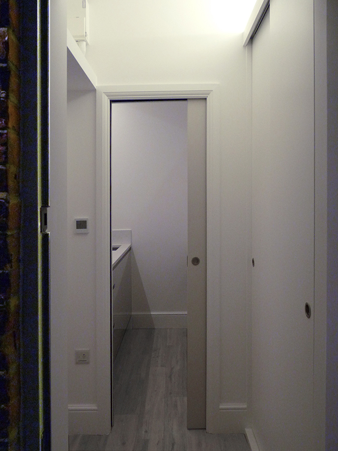 You are here: Spacetime project Garden flat - Clapham Common See Spacetime profile Gallery Open plan living and kitchen area View from hallway to living room Entrance hall Living room Sliding screen over breakfast bar
