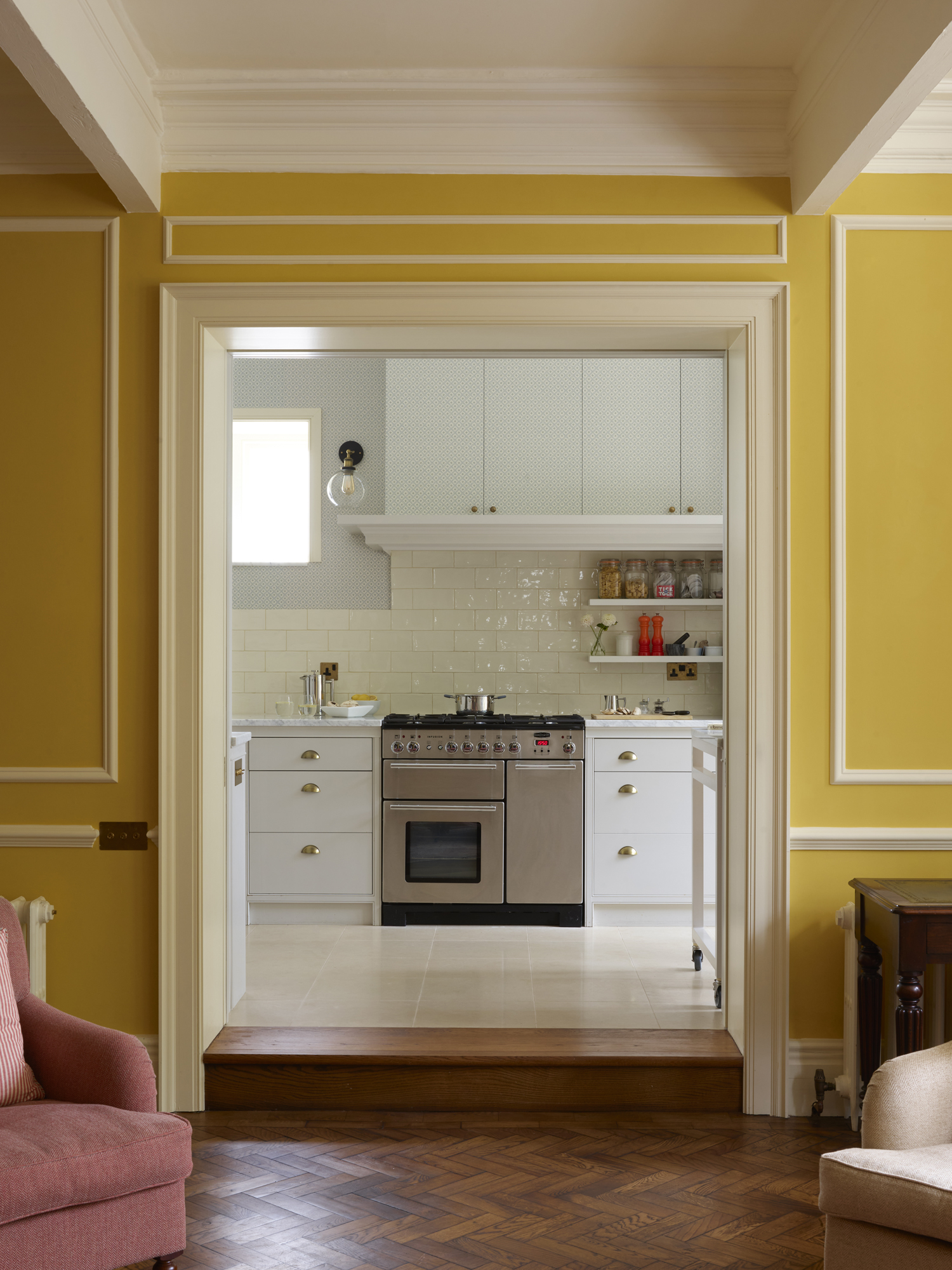 The main drawing room was painted a wonderful, red/yellow: Farrow & Ball's Babouche. It needed cornicing and carefully planned mouldings to refine the walls. We commissioned a Chinoiserie wall with hand painted butterflies and flourishes to allow it to stand alone as a piece of art. The hot yellow contrasts beautifully with the cool blue of the kitchen and the Soane wallpaper. It remains fresh and bright and lets the floor to ceiling views of the garden take hold.