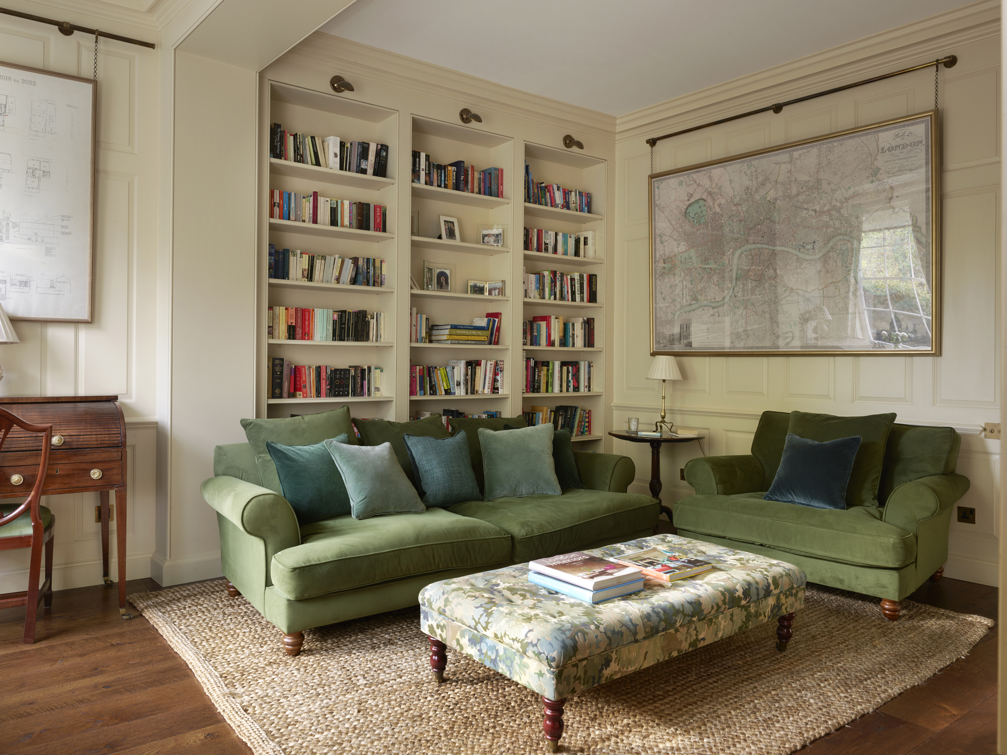 Also on the ground floor is the panelled sitting room: here we commissioned antique brass picture rails and chains and a large map of London. Picture rails are fantastically practical and with the detail sitting just beneath the ceiling, they draw the eye to the full height of the room. The deep green velvet sofas, natural woven rug and soft furnishings give it a country house feel.