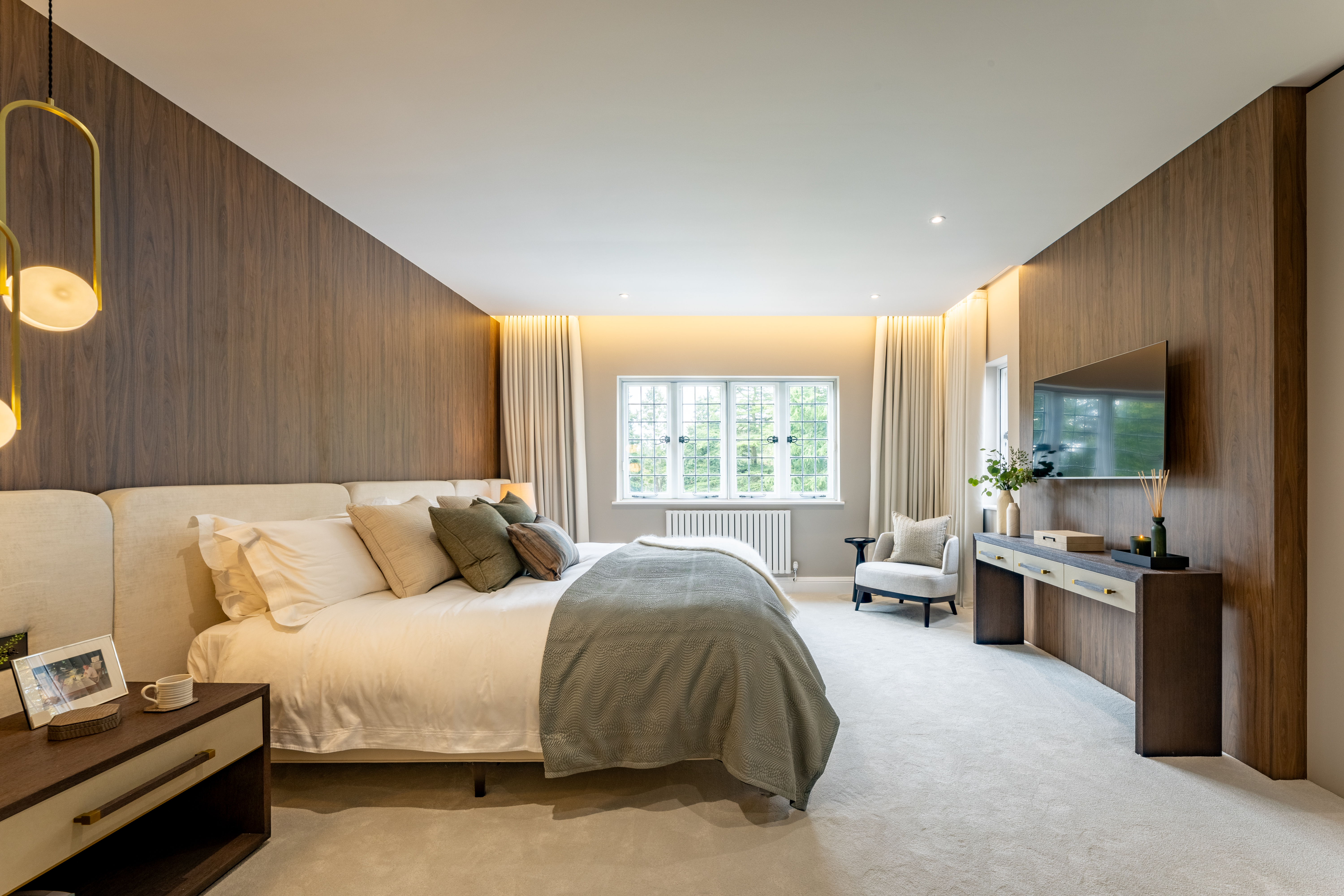 Our latest project transforms a space by removing an existing staircase and two bathrooms to create a stunning master bedroom with two ensuite bathrooms and walk-in closets. The room features an elegant upholstered headboard against rich wooden finishes, enhanced by soft, indirect lighting for a warm atmosphere. Hidden doors lead to the walk-in closets and ensuites, keeping the design sleek and clutter-free.