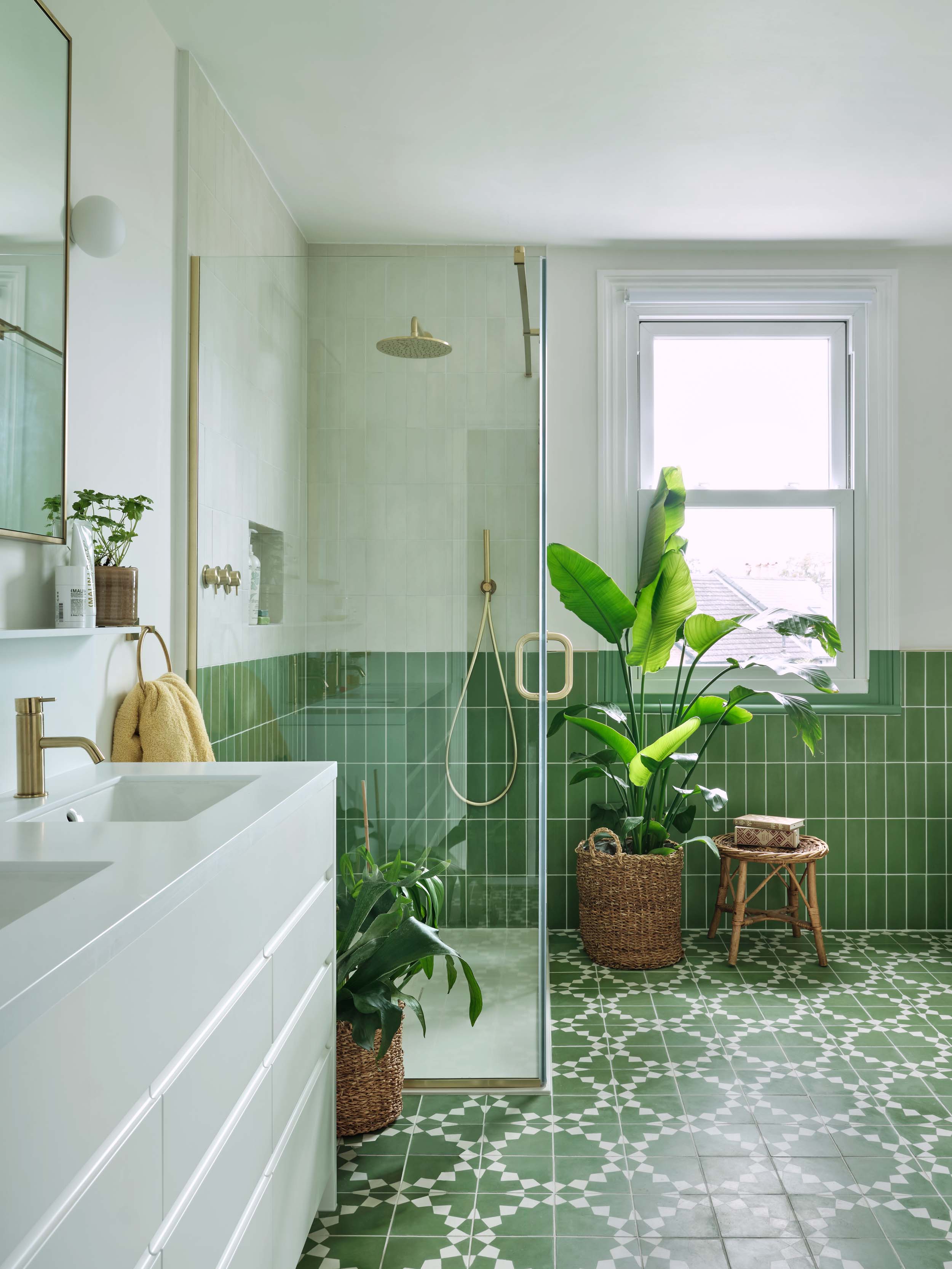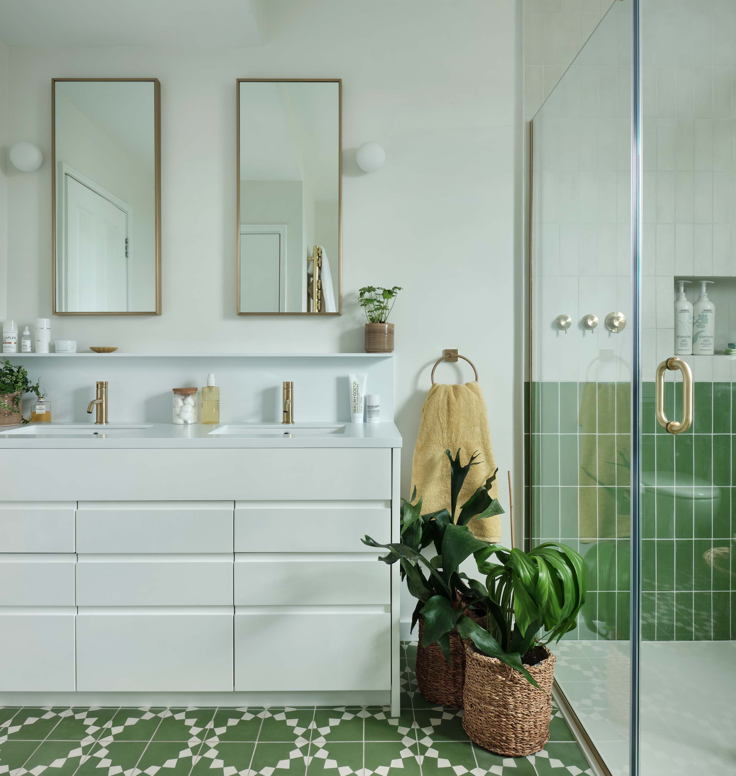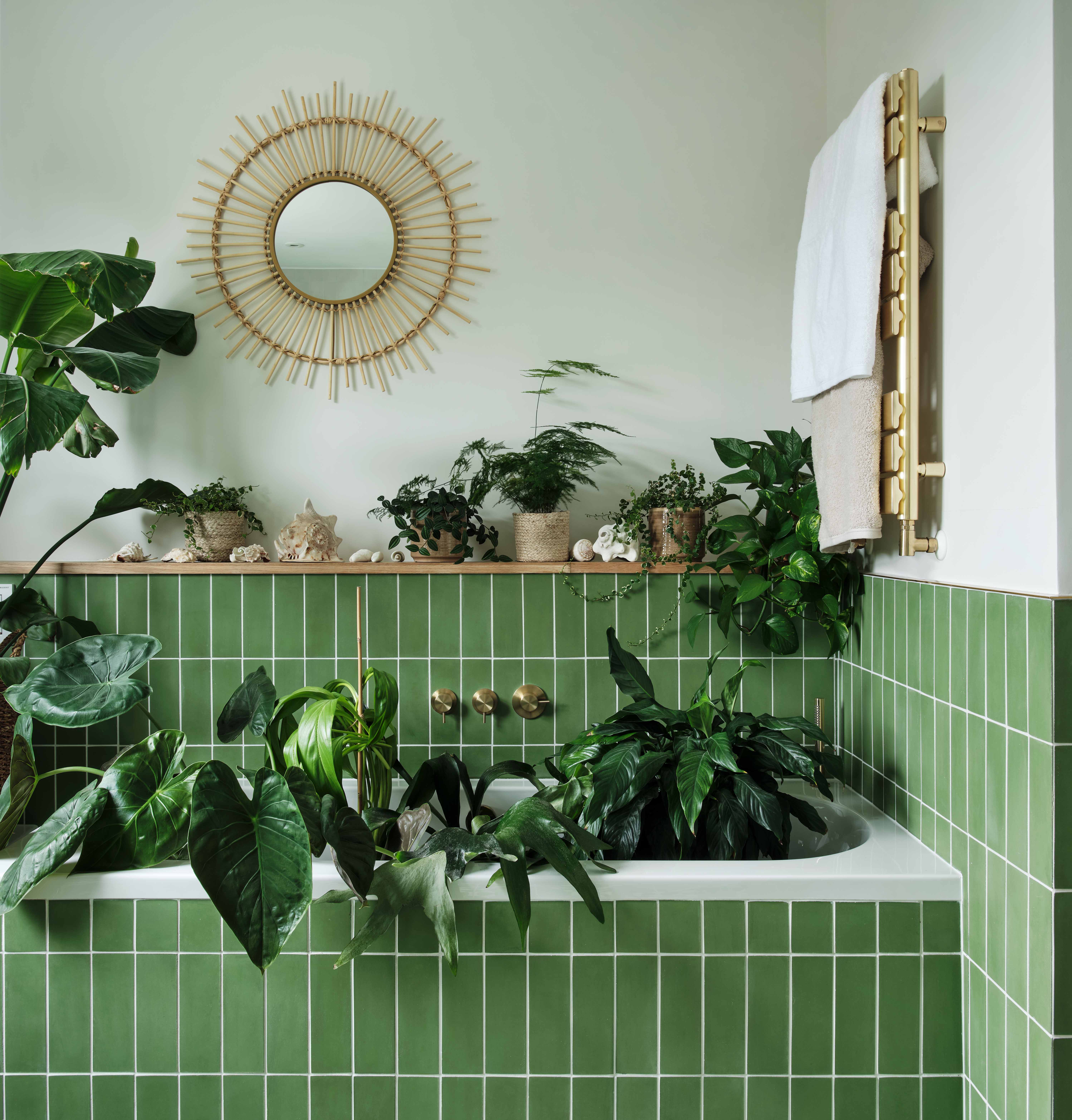 Forest Green tiles wrap around the lower half of the walls in the larger bathroom, adding that splash of colour. We designed a two-tone look in the shower to mirror the adjacent walls. The made to order Bert and May floor tiles brings the space to life and what could be more lovely than a bath filled with plants.