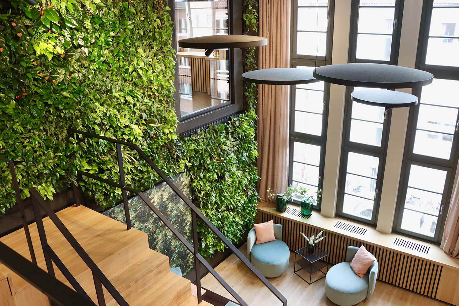 The visual highlight of the lounge area is the plant wall. “We were delighted to be part of this unique project. The integration of plants in the design is something special. We chose the plant wall in the lounge area for its attractive appearance, but also for its positive impact on room acoustics and indoor air quality. The space is open, allowing the fresh air to circulate throughout the building,” says Max Gregg of Gärtner Gregg, who was responsible for the project’s execution. Click here to read more about this project.