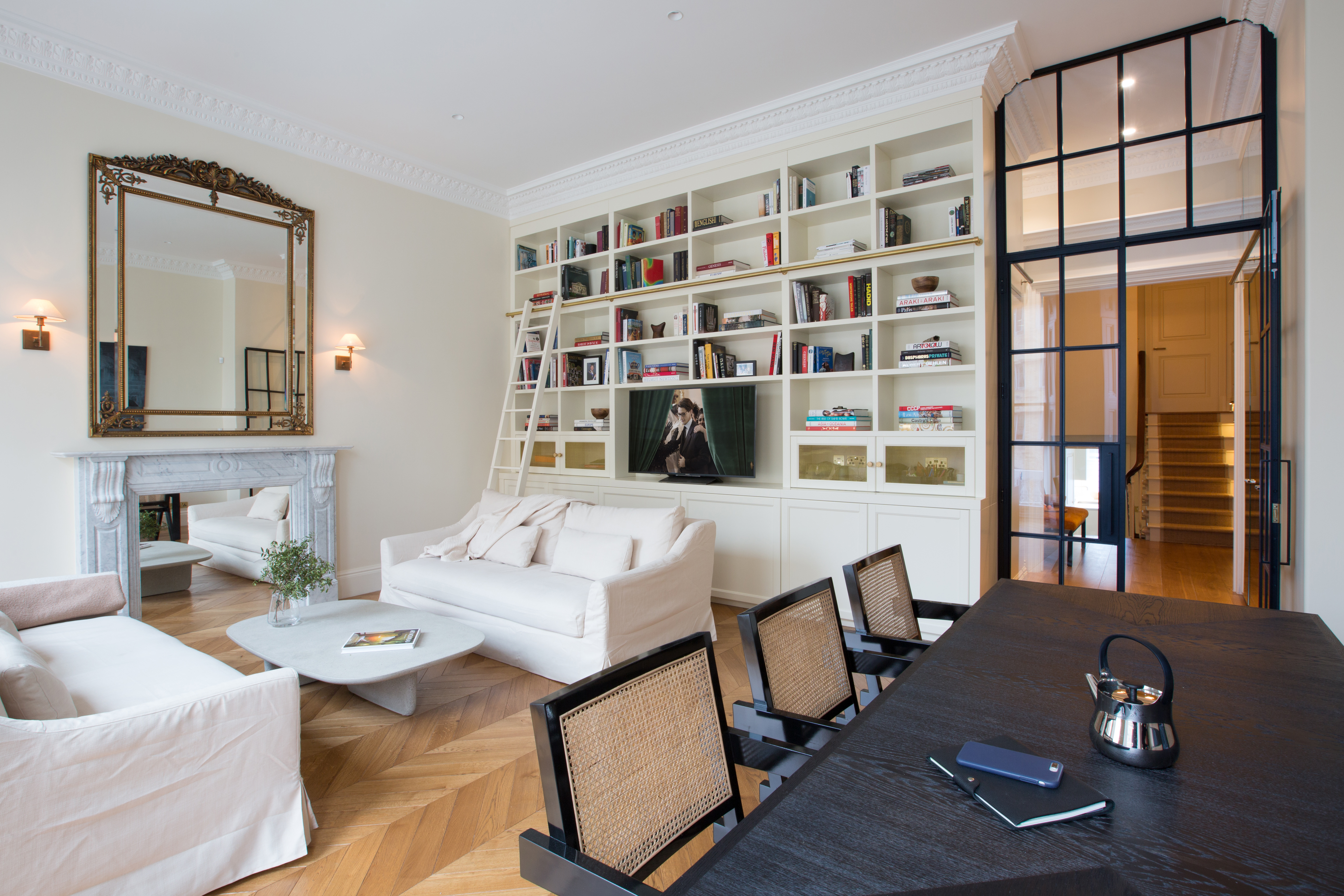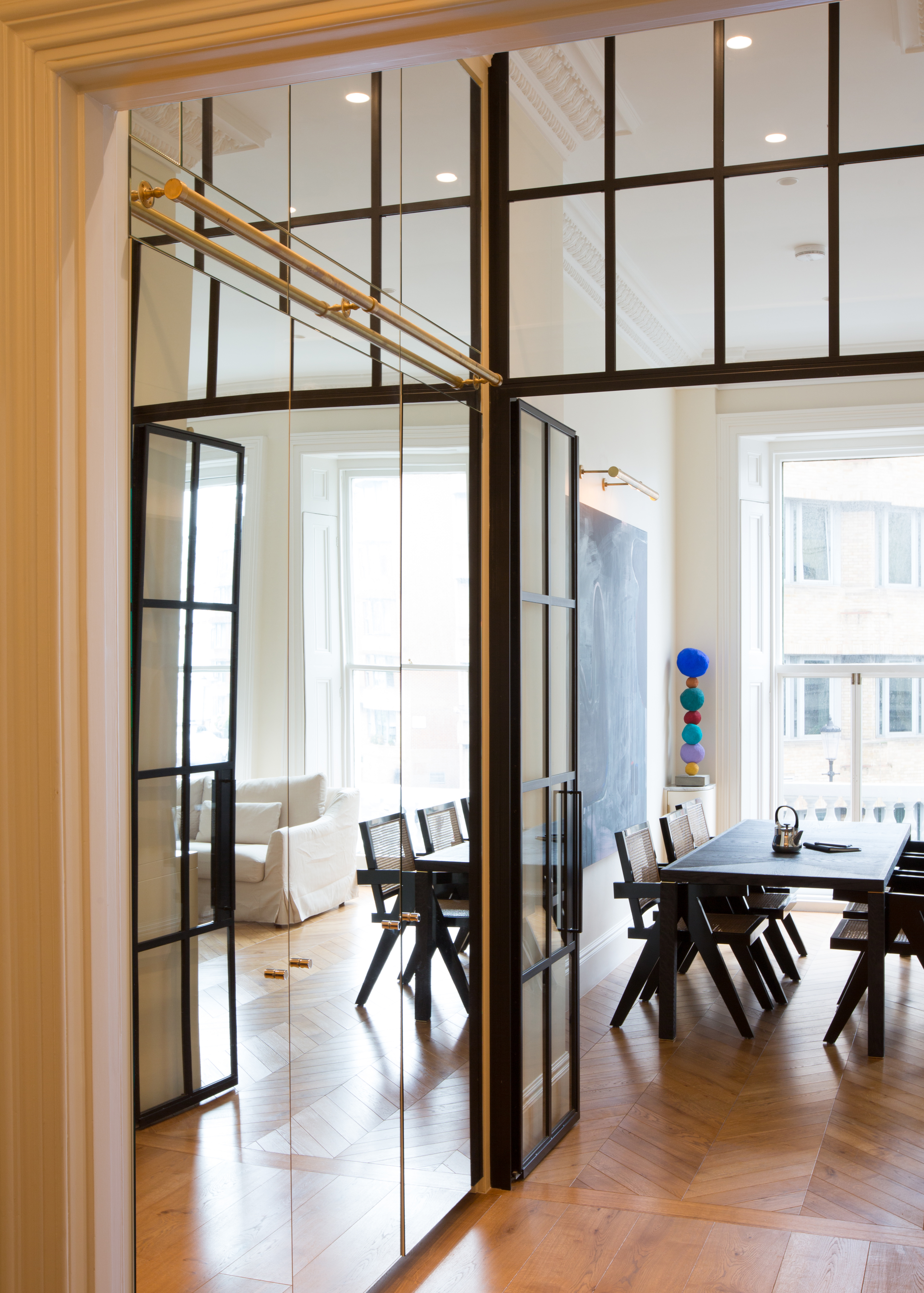 A lateral apartment in he RBKC Cornwall Conservation Area provided a wonderful opportunity to completely remodel this artists home in SW7. Original features and details were carefully restored before interior designs looked to complement and contrast. Specific areas were dedicated to the display of art and sculpture.