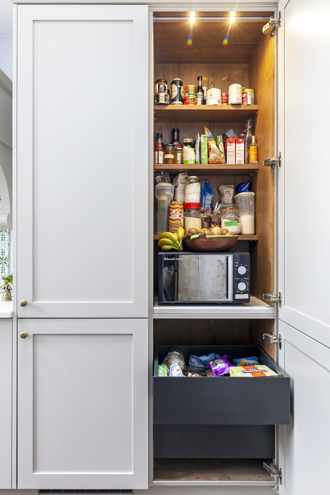 The bespoke nature of our service included detailing such as the bespoke extractor hood with corbels to match the cabinetry, and drawers on the dining side of the island for crockery and cutlery storage, so the client’s children can set and clear the table with ease.