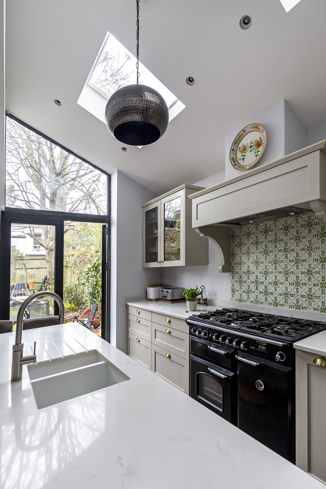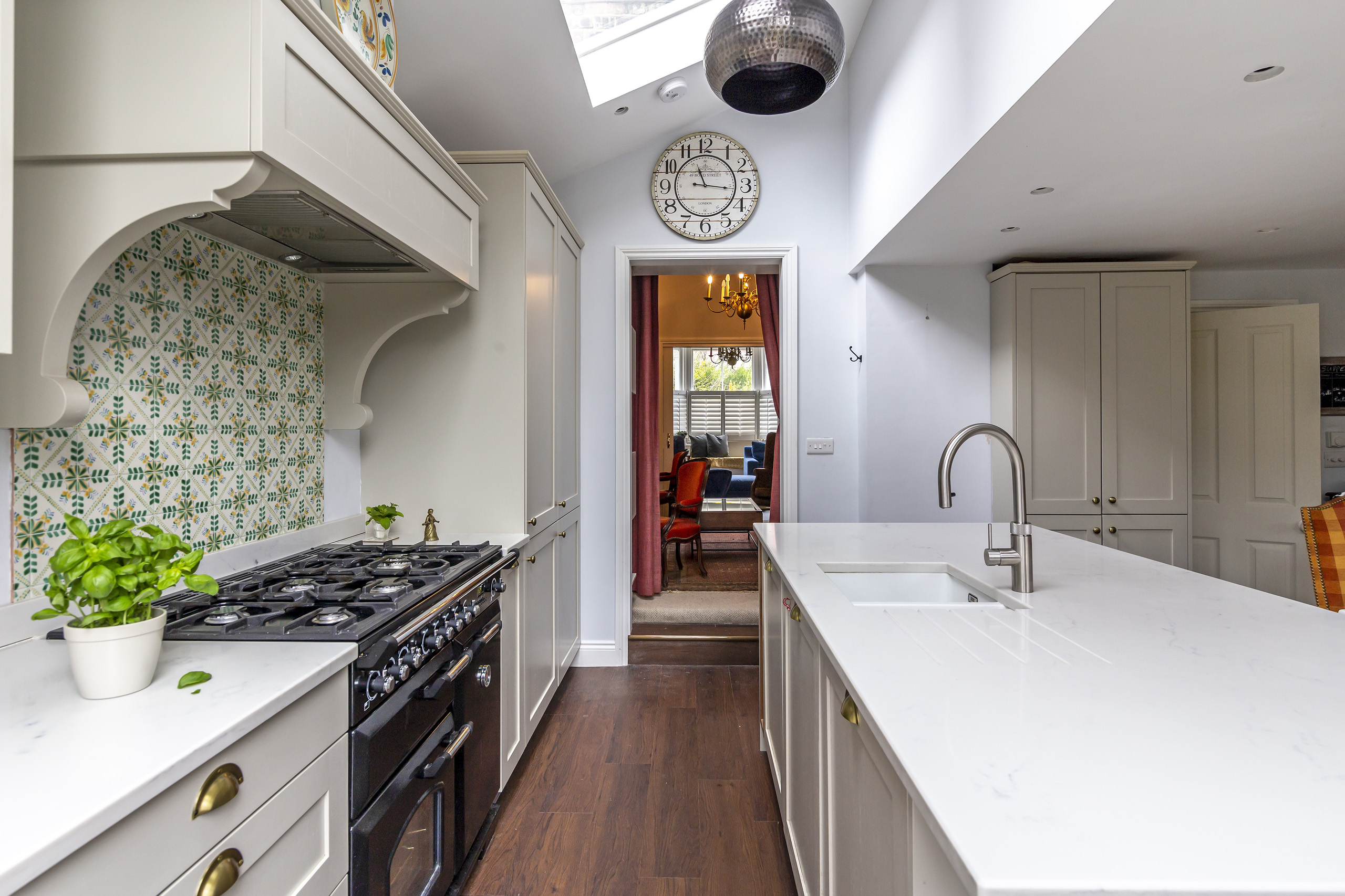 We advised on the space planning and layout of the new kitchen-dining space to maximise the natural light, colour scheme, kitchen style, lighting, materials and finishes.