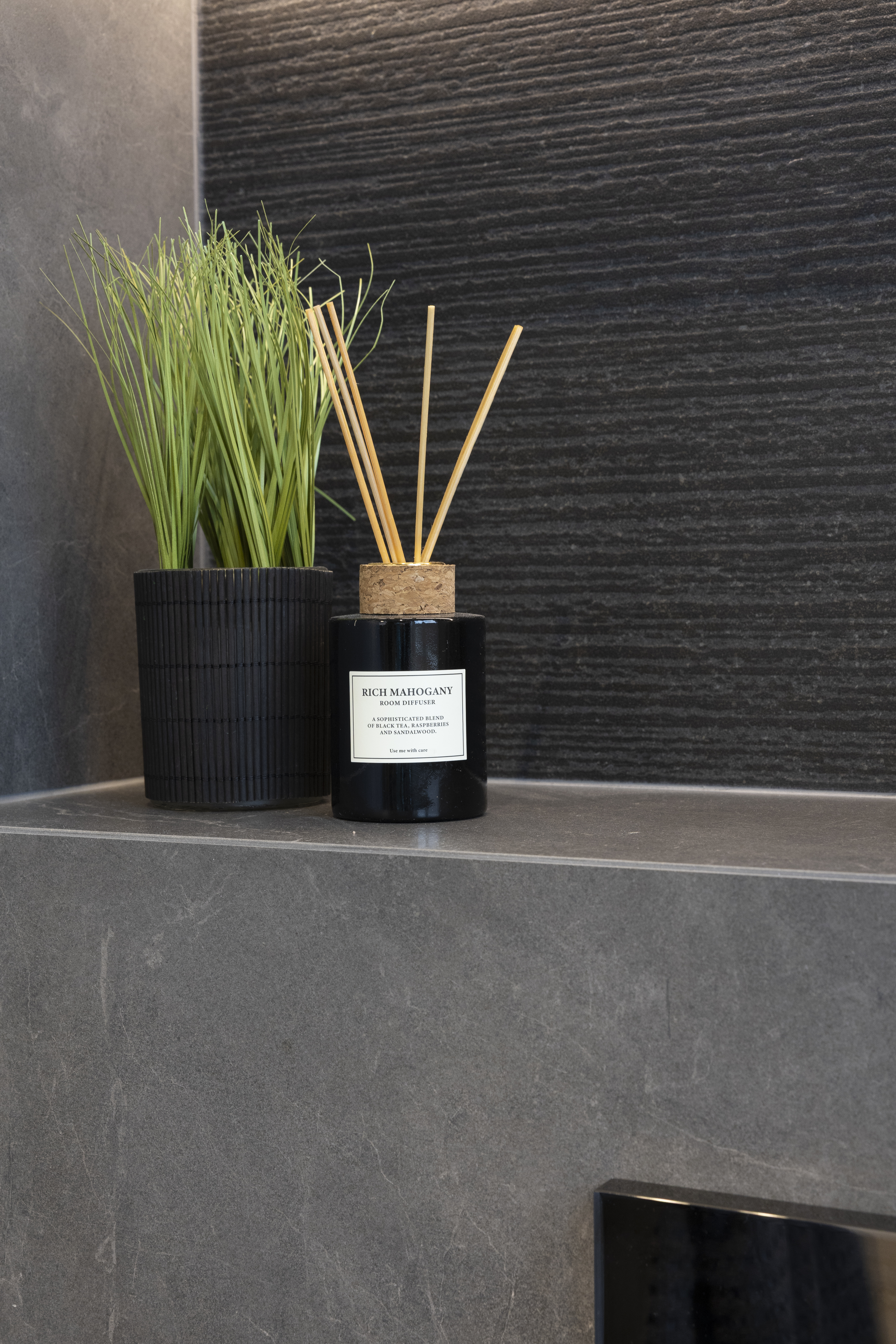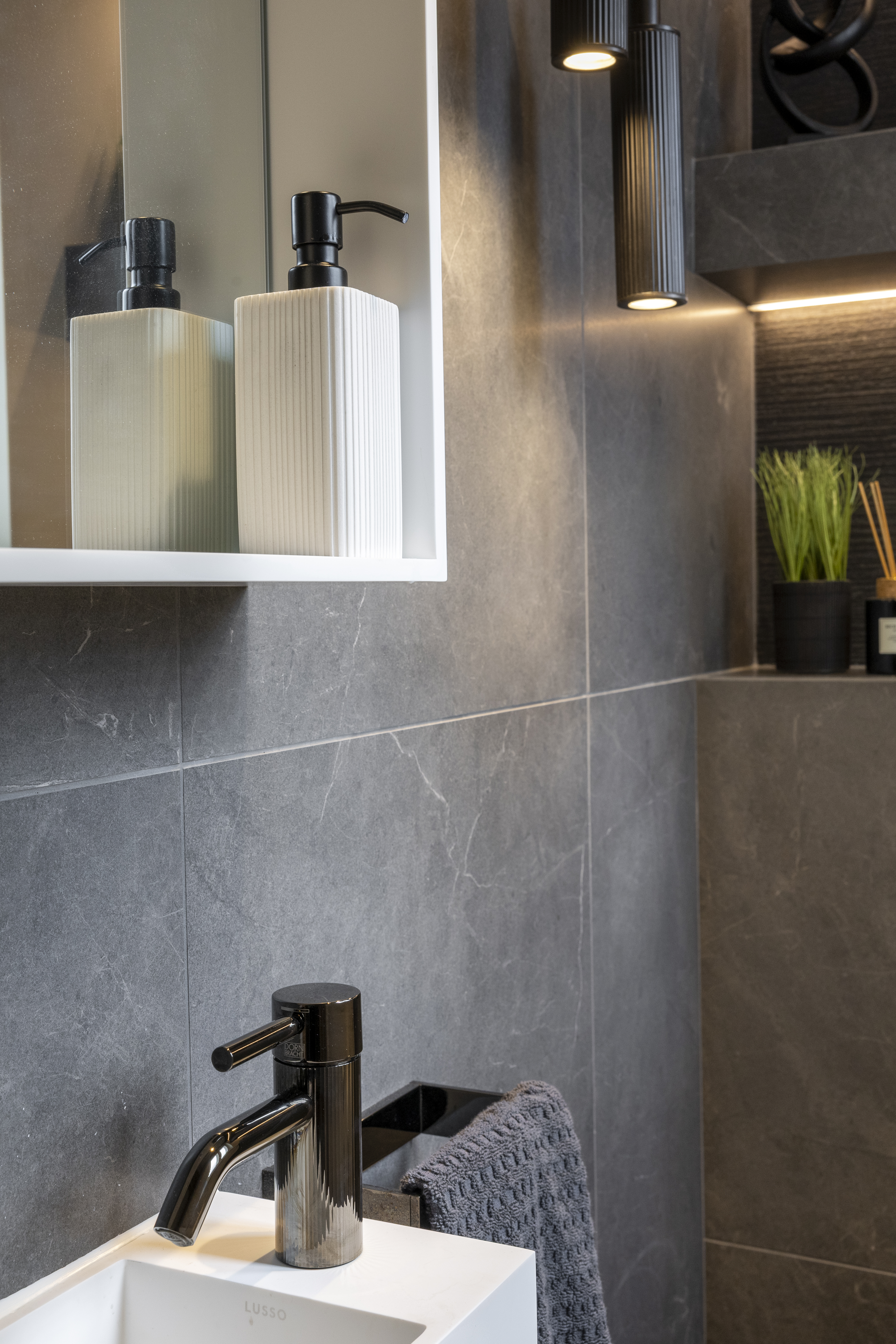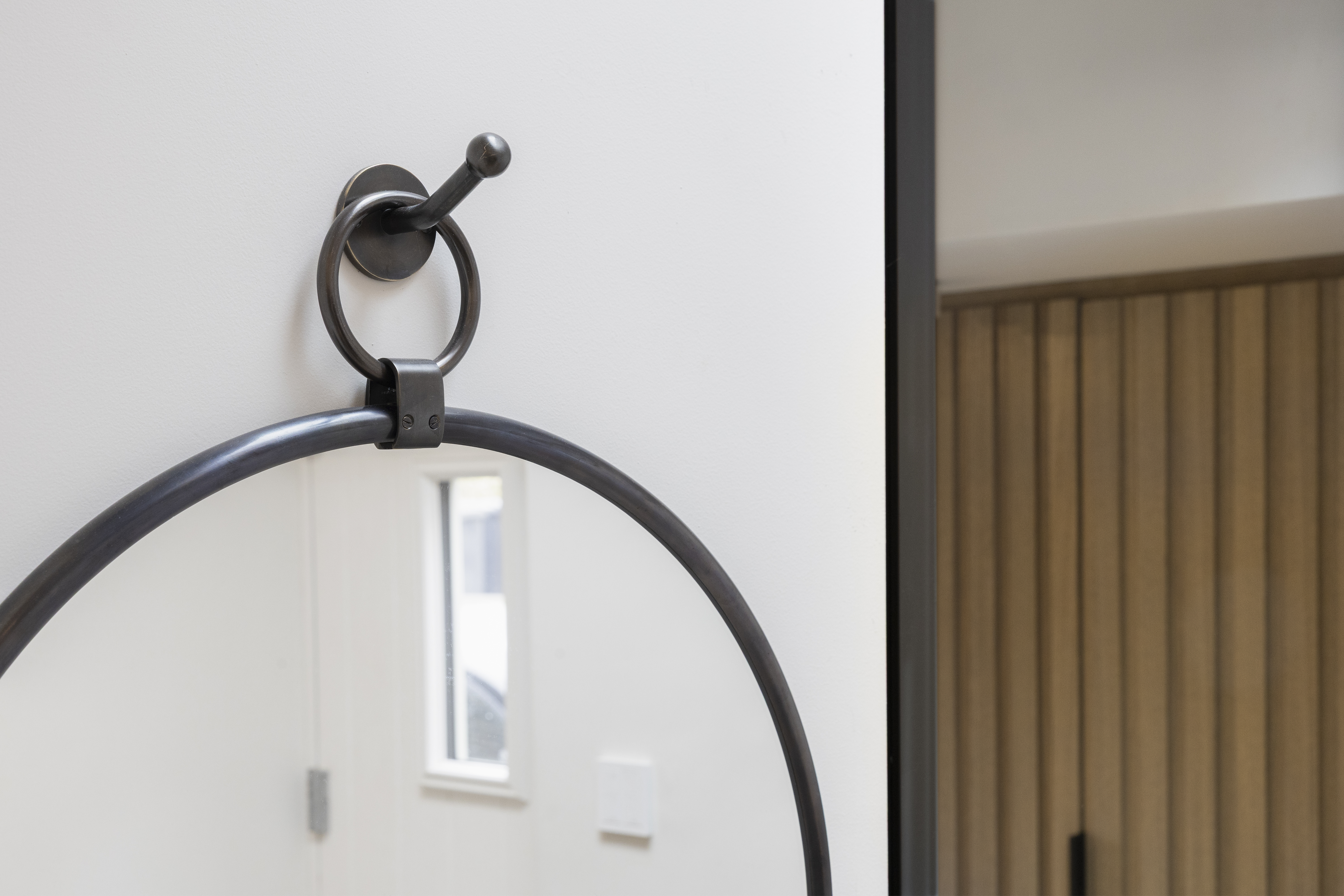 The brief for this project was to create a discreet cloakroom and wc for guests when the clients are entertaining. We introduced a new stud partition off the kitchen, with an obscured bronze glass aluminium frame door. To conceal the WC, we designed a totally bespoke wall of oak cladding with three hidden doors. Behind the first door, the small but stunning WC space was meticulously designed with mitred tiling and carefully curated textures, and layered lighting to achieve a space which was not just functional but dramatic.