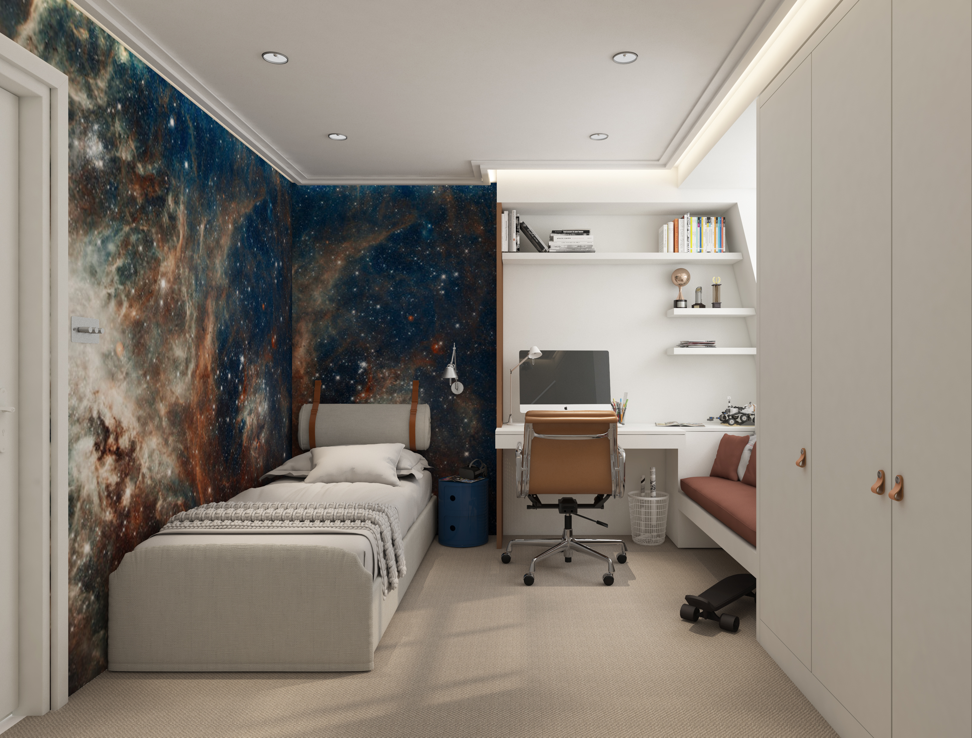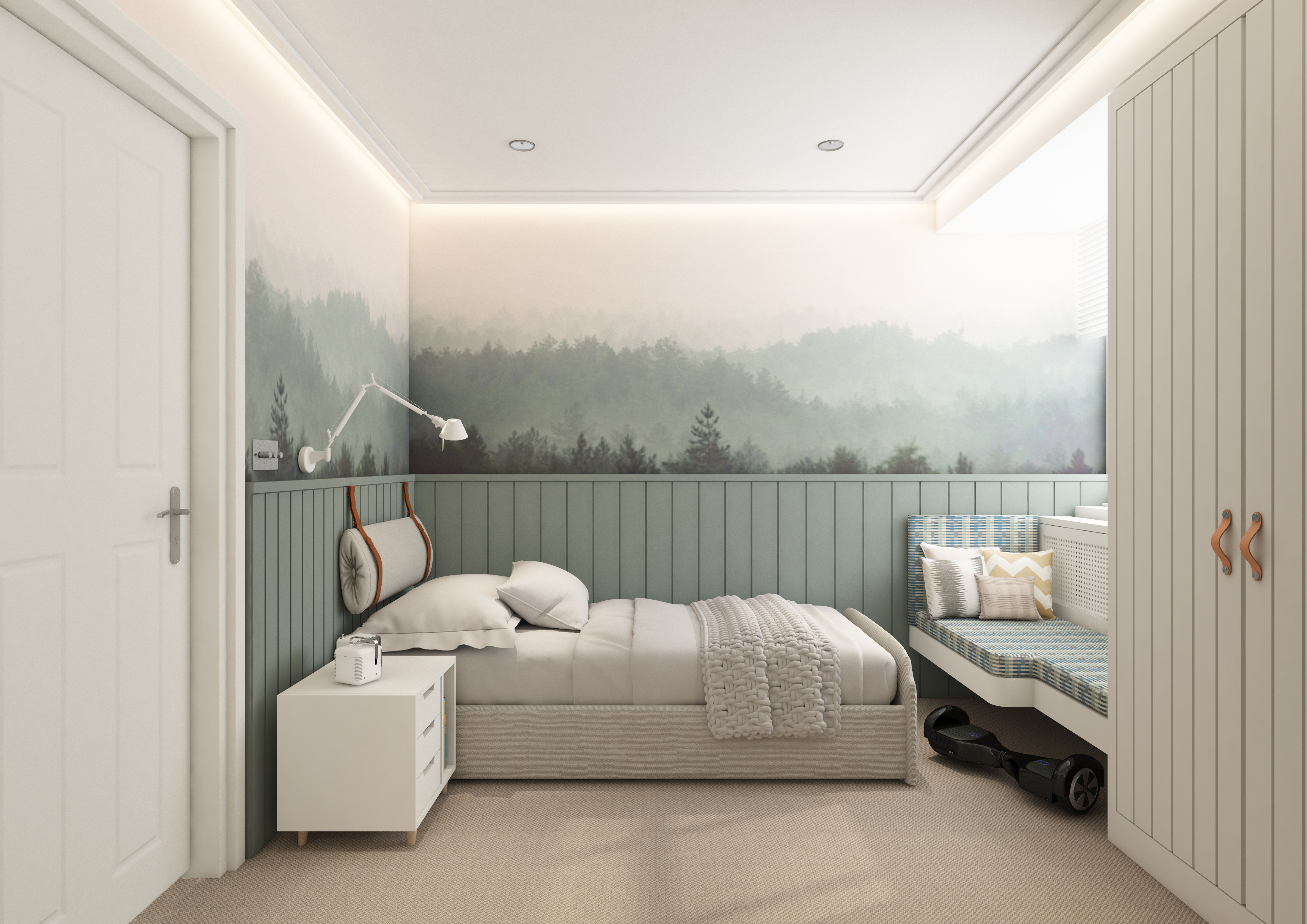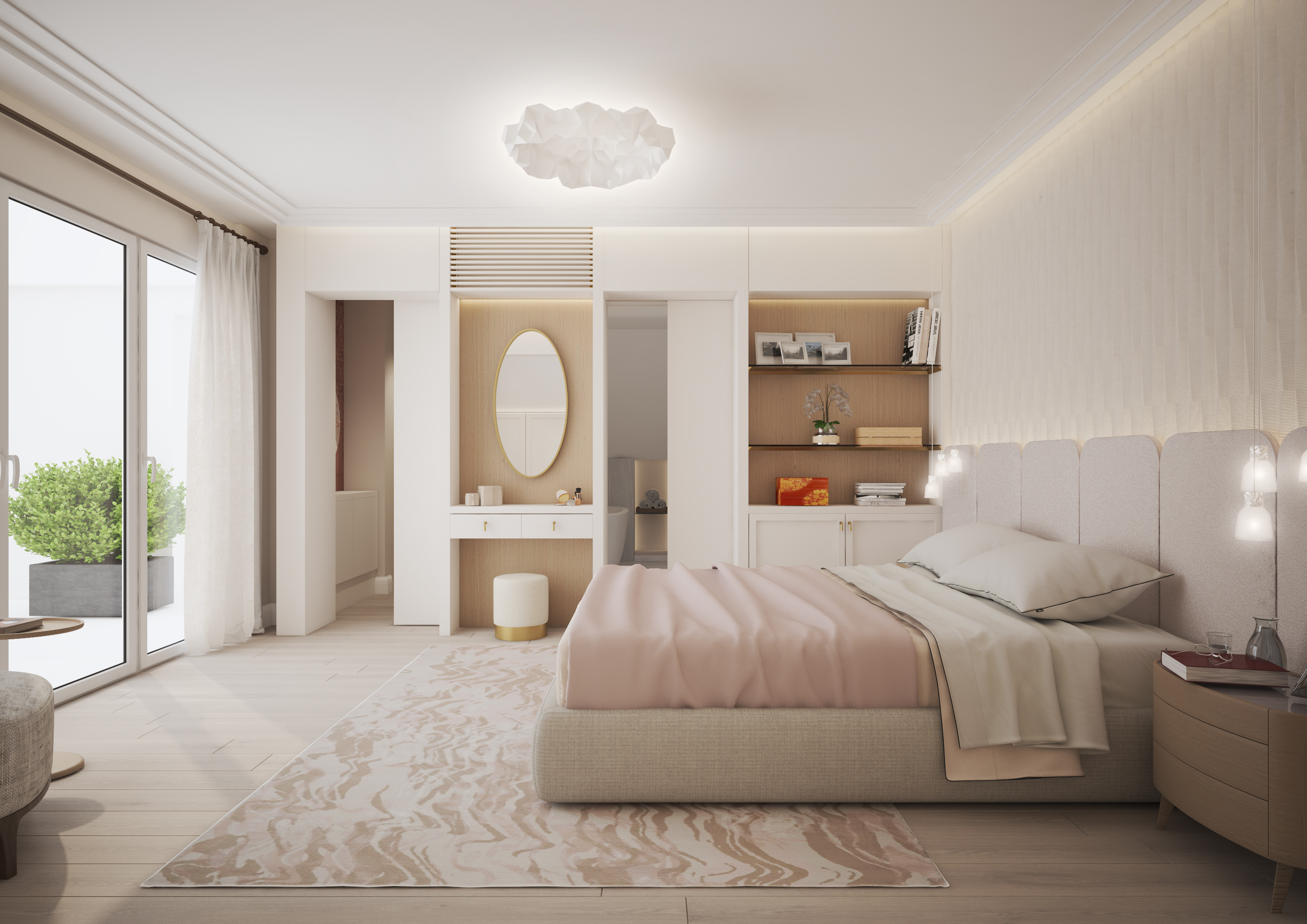 Master bedroom with a nude colour palette, soft and round materials. Well hidden sliding door leading to the en-suite bathroom. Private balcony letting in natural light, ceiling with cornice.