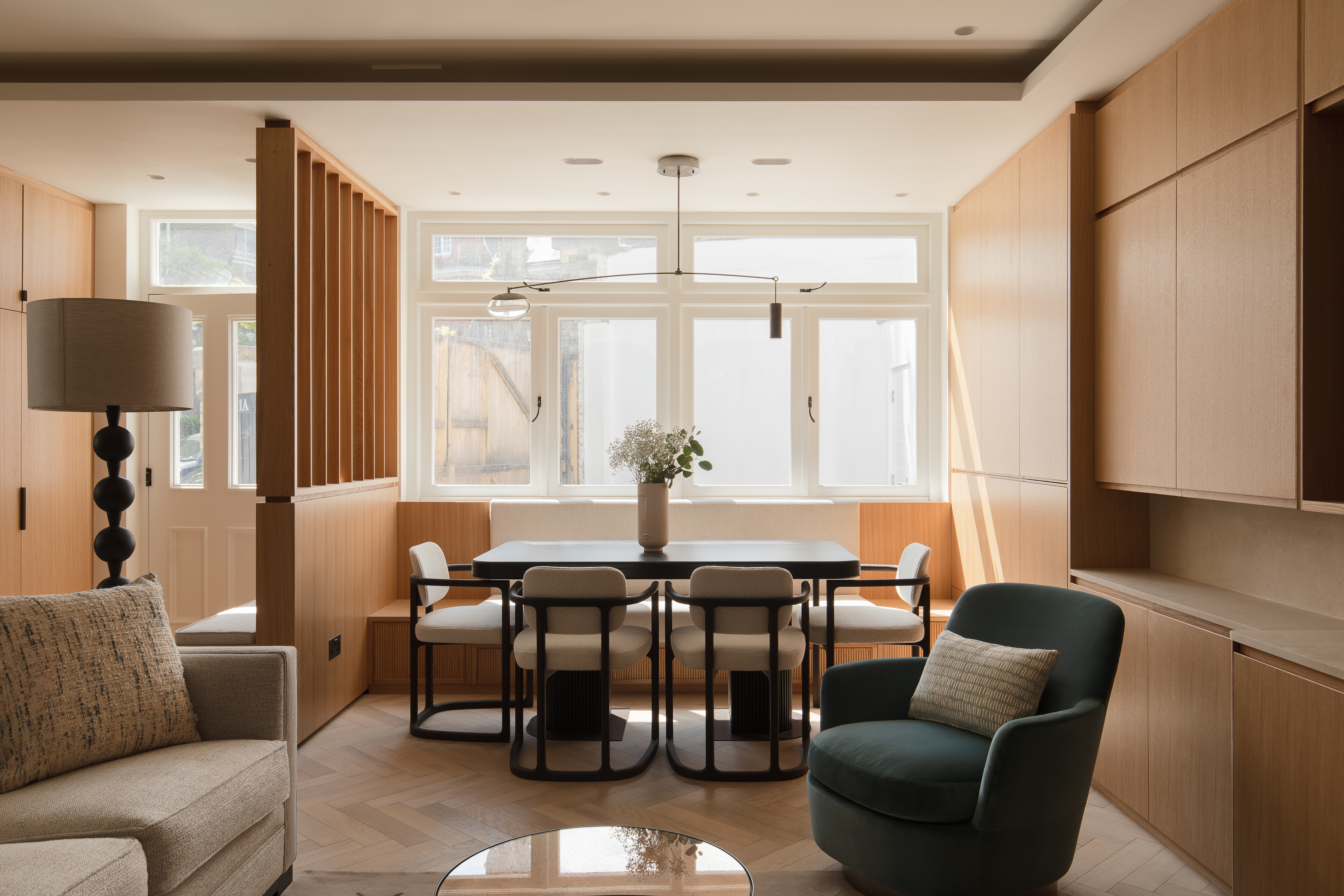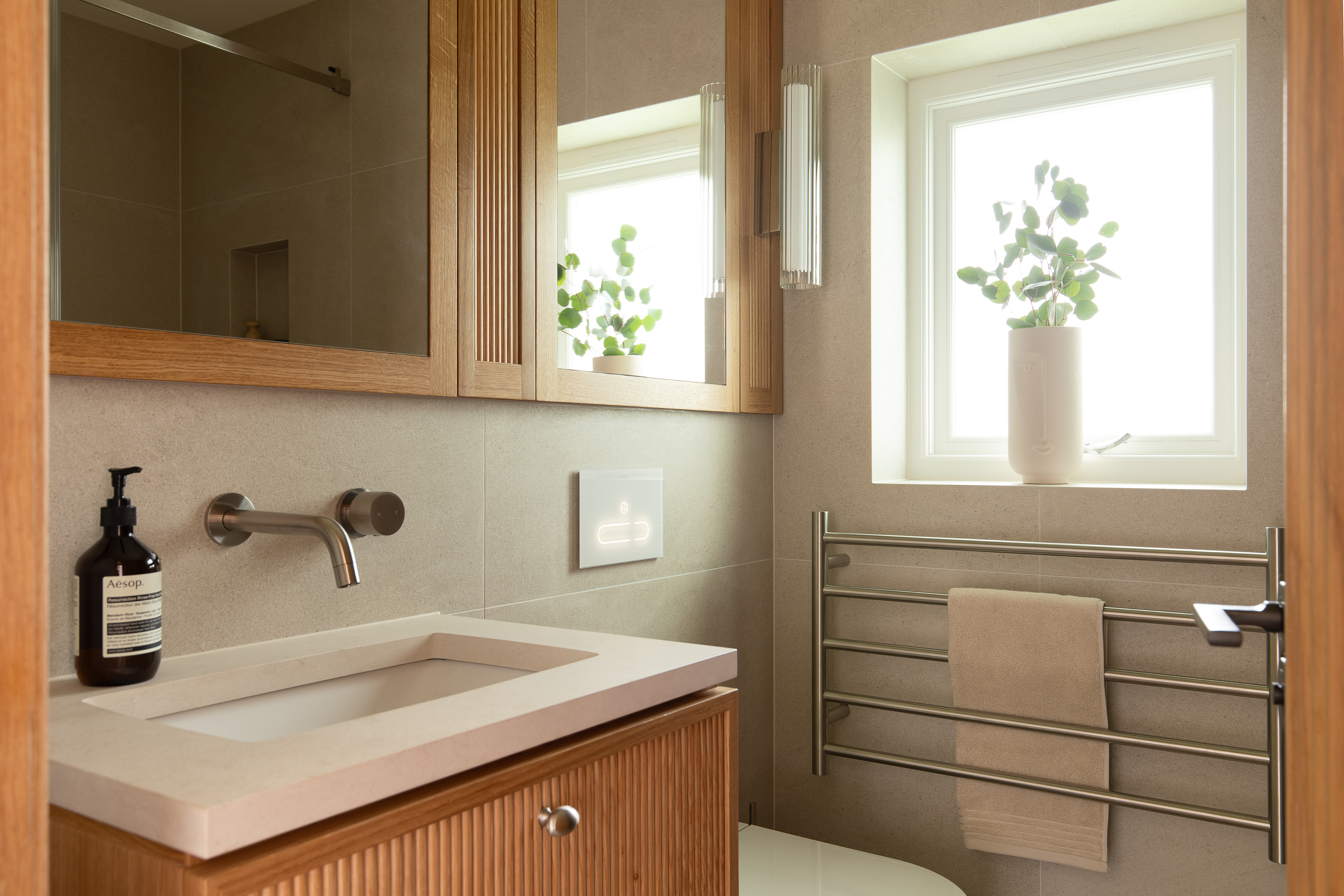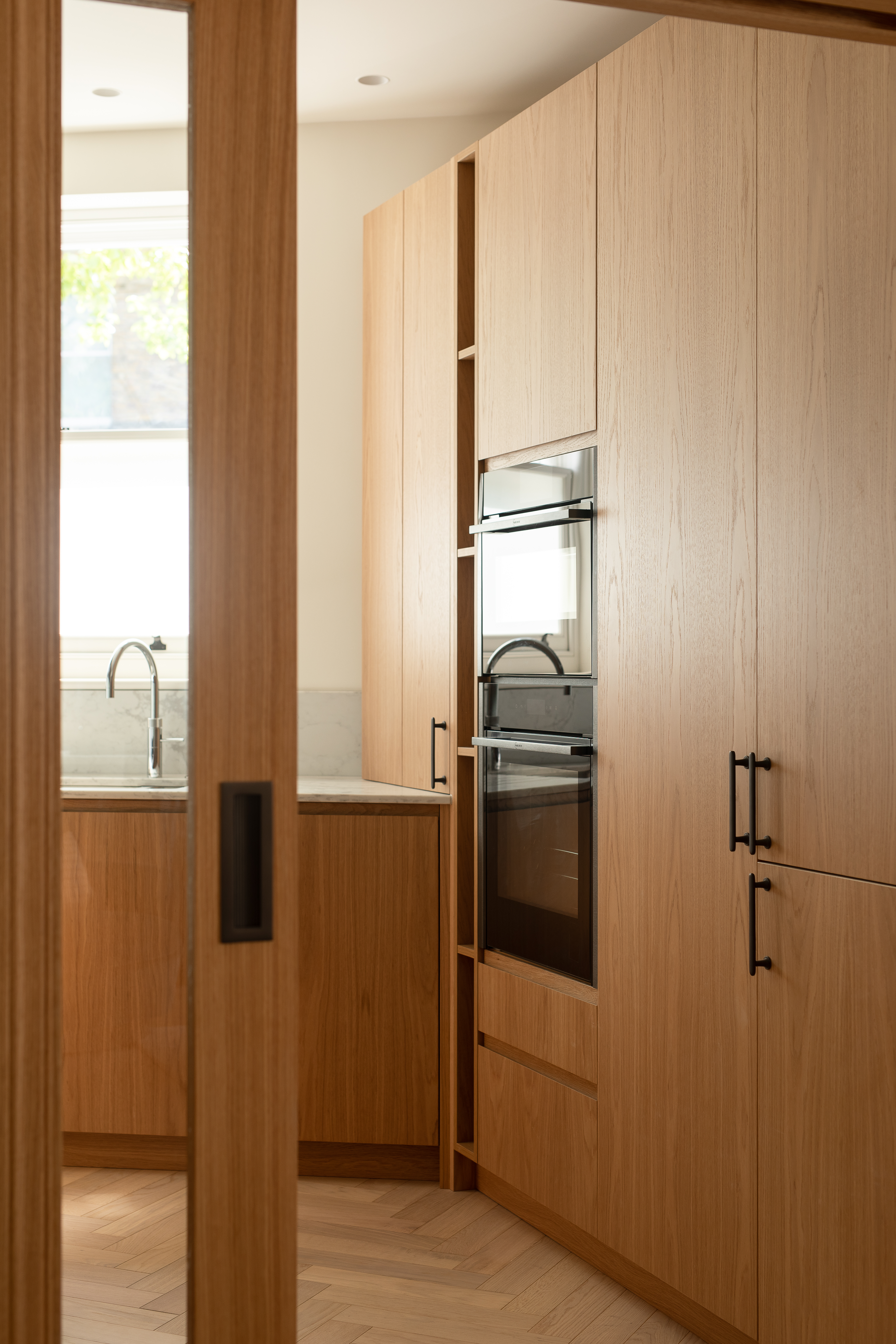 The complete refurbishment of a 1,250 sqft Mews House in Hampstead. The project required a full reconfiguration of the layout to maximise storage whilst creating a calm, serene environment for the client.