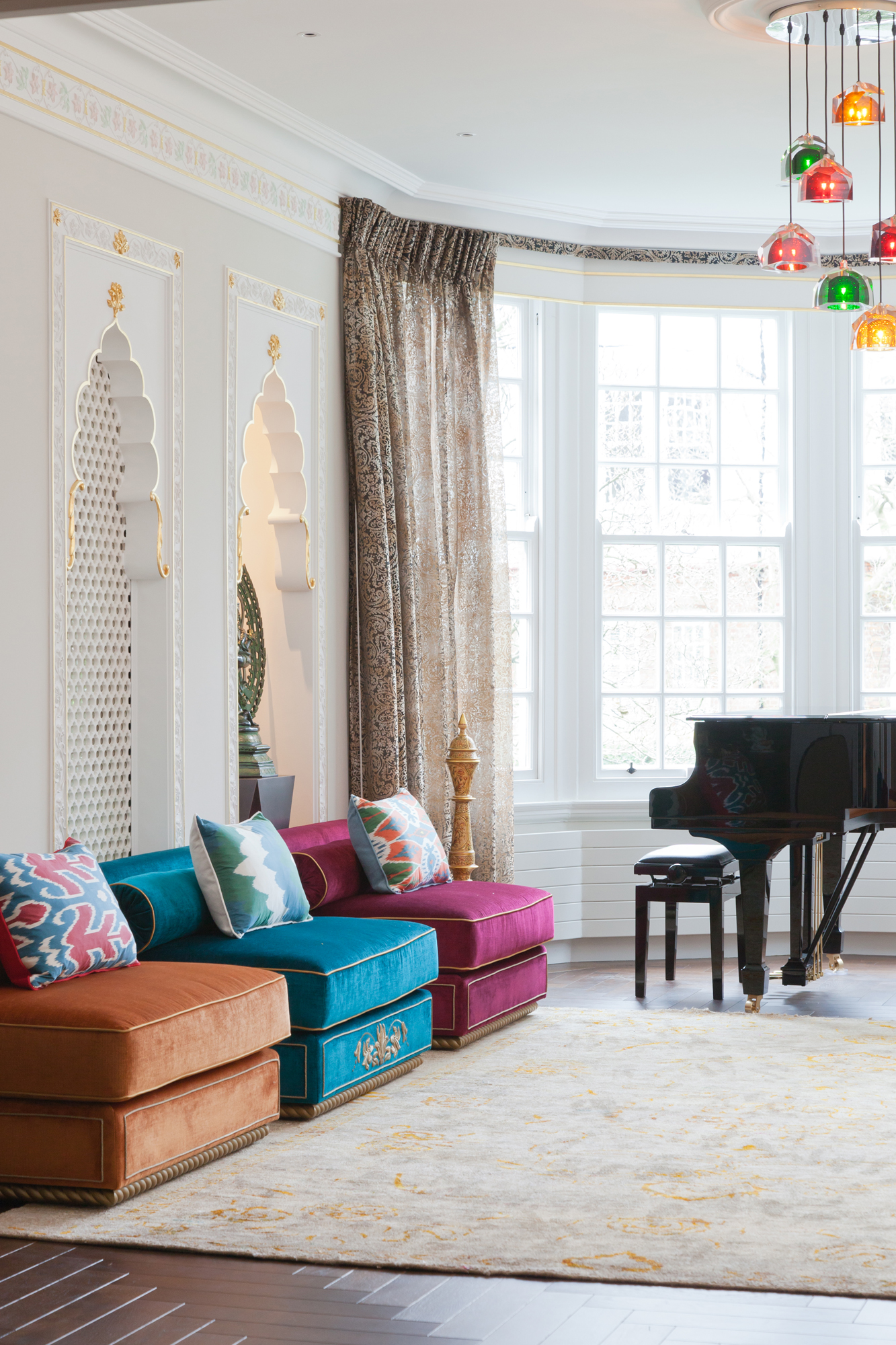 In London’s leafy suburb of Hampstead, we were tasked with weaving a touch of Indian heritage into a grade II listed home, built during the Arts and Crafts movement of the early 20th century. The project involved the complete remodelling of the three-storey property to create a stunning contemporary family home. Murals and mosaics were incorporated into the design and alcoves created to make use of state of the art lighting – the result a space of great ambience and energy.