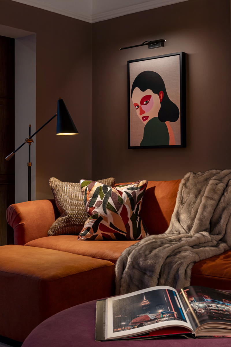 The new layout created an open kitchen and inviting snug area for family movie nights, with bespoke cabinetry for the TV and travel mementos. The orangery was transformed into a light, airy room for entertaining, featuring a large dining table with mixed seating. The formal sitting room, previously lacking natural light, was opened up with a large Crittall-style screen to the orangery, allowing light to filter through. Jewel-toned Howard-style sofas and cabinetry created a relaxing retreat.