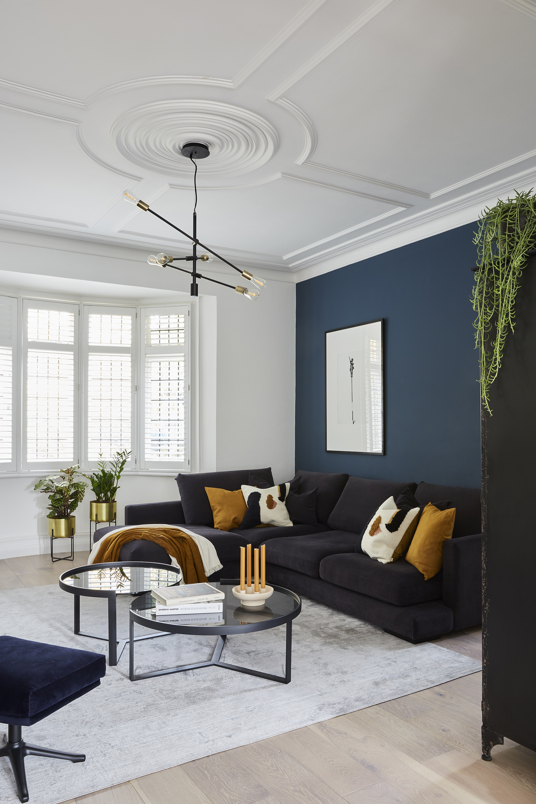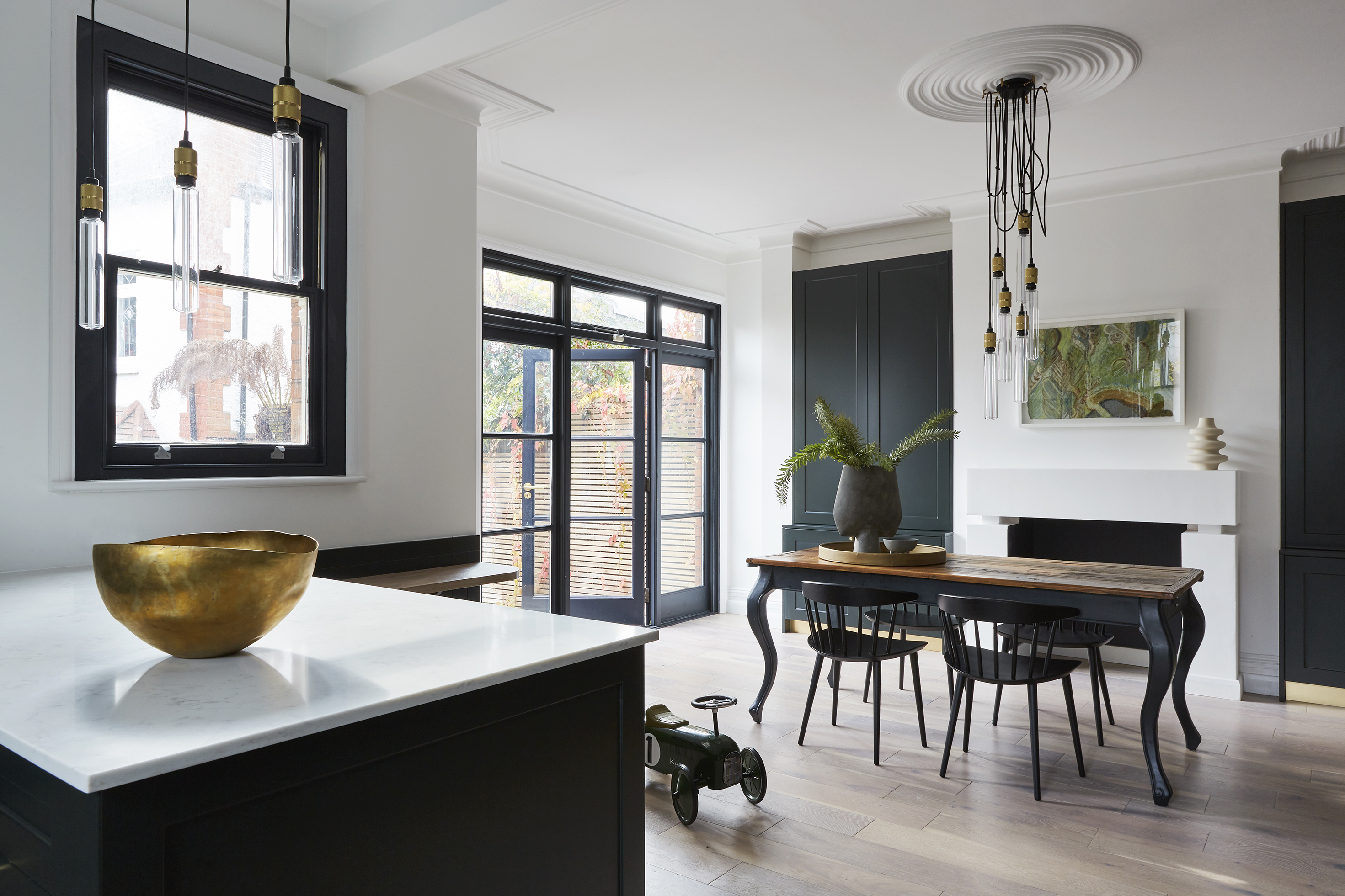 The property boasts a relaxing and stylish atmosphere with a mix of jewel heritage tones and earthy shades. The decor includes modern industrial lighting and furniture in black and brass, while chartreuse accents on the ground floor and dusty pink touches in the bedroom add a pop of color to the eclectic design.