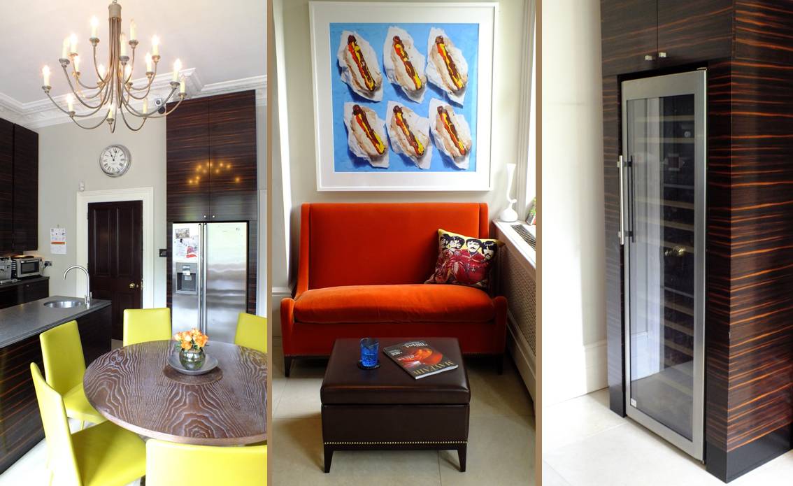A striking six storey residence with wonderful proportions and ornate, original features. The aim was to create stylish, eclectic and contemporary interiors that blended with the classic architecture and statement chandeliers and mirrors. Our international clients brought several pieces of art and furniture from previous homes which were carefully designed into the schemes. Pop Art provides an explosion of colour, picked out in other accessories. Contemporary Italian furnishings and beautiful crafted cabinetry blend with the grand Venetian pieces. In the kitchen / breakfast room there is a strong focus on the luxurious, yet family-friendly, finishes with splashes of rich colours providing the perfect counterpoint to the rich, dark Macassar Ebony cabinetry.