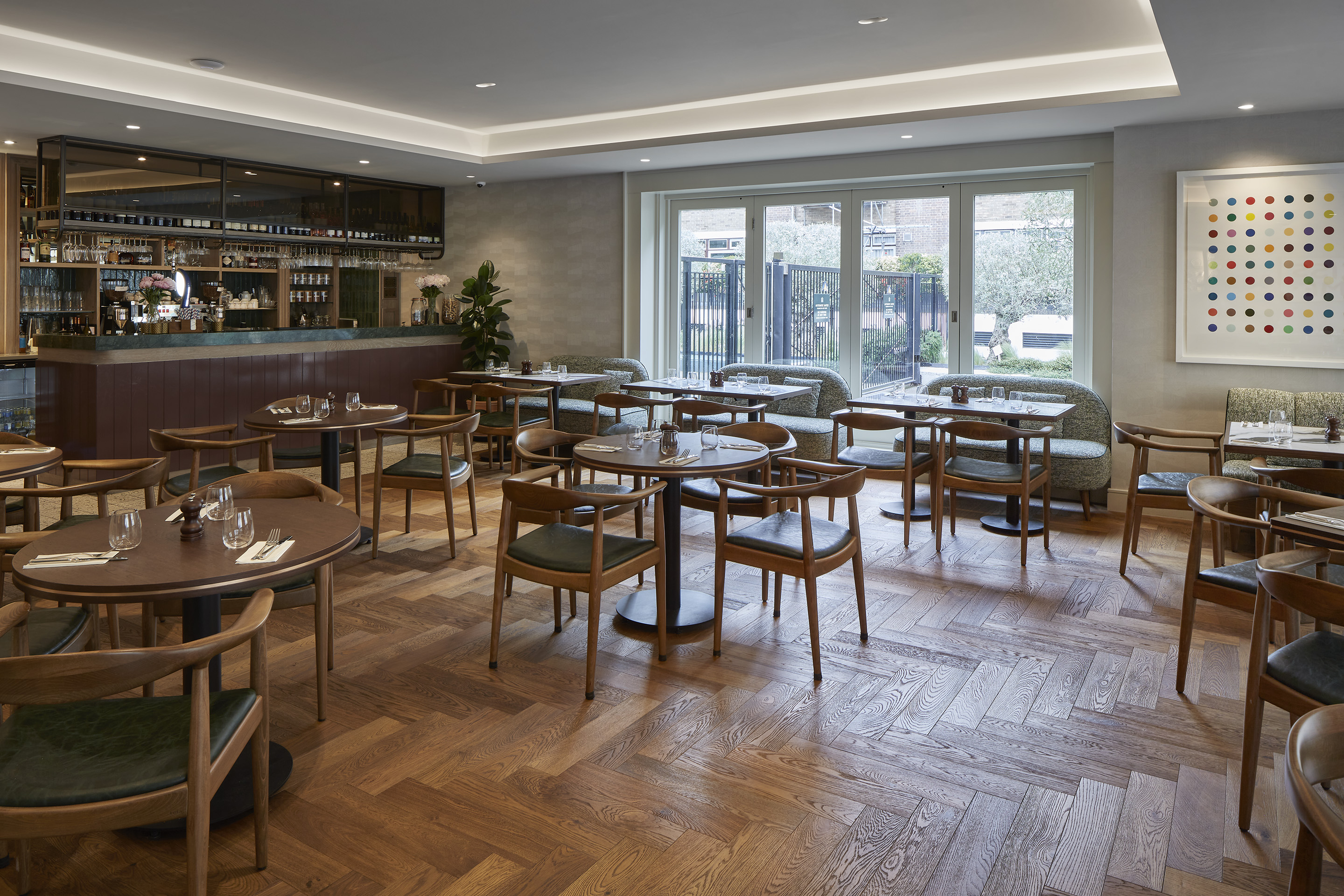 To create a natural border which helps to zone the different areas, the matching Bergen 1-strip boards have been installed as a sophisticated border alongside the herringbone which runs around the edge of the restaurant. The wood flooring has been paired with terrazzo tiles which add a welcome contrast, resulting in dedicated areas and clear walkways as part of the design.