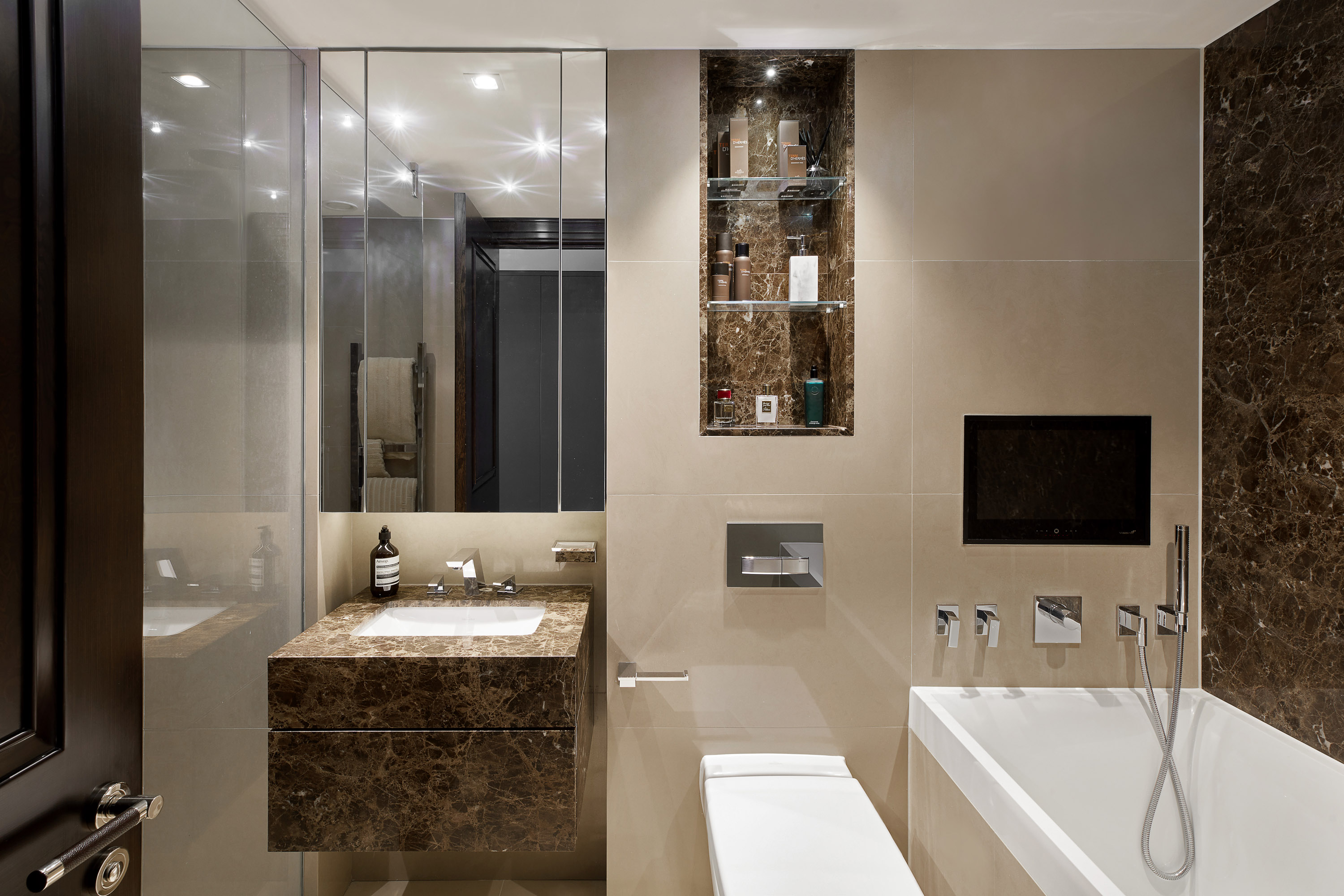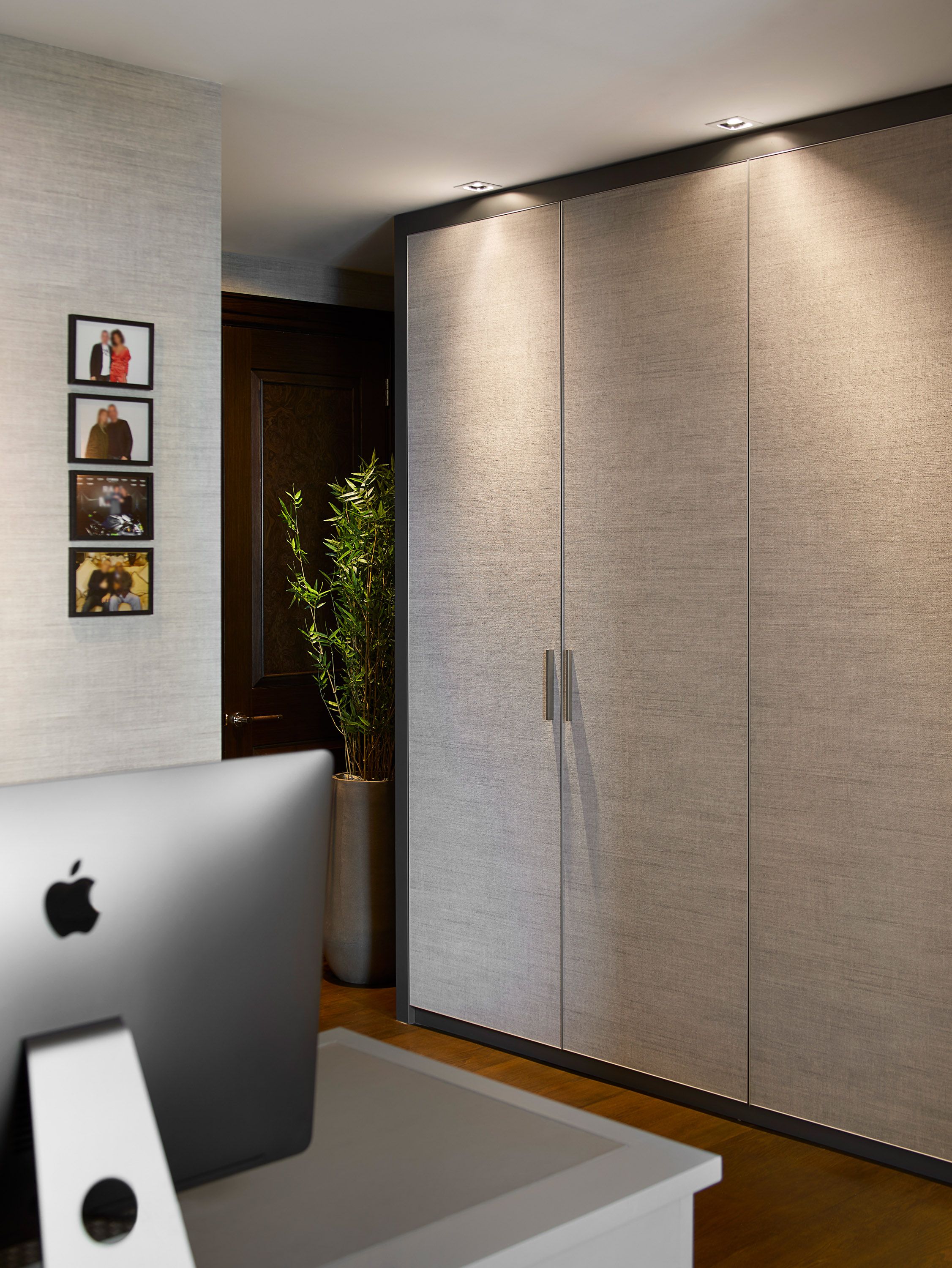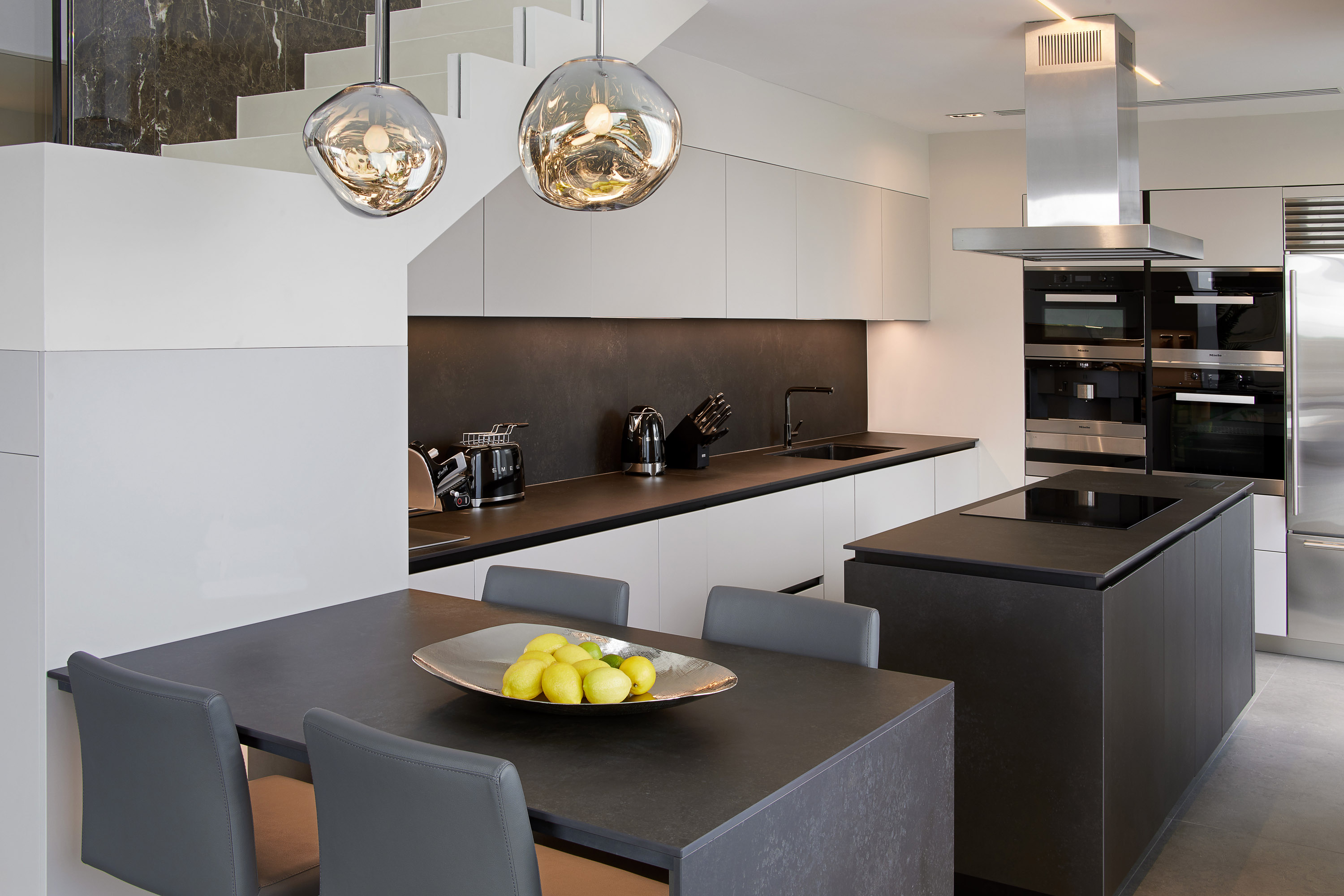 The scheme complimented the Client personality with a mostly monochromatic colour palette and adding different textures with marble, leather ceramic and wood.