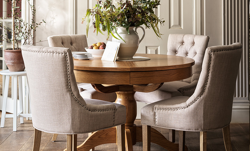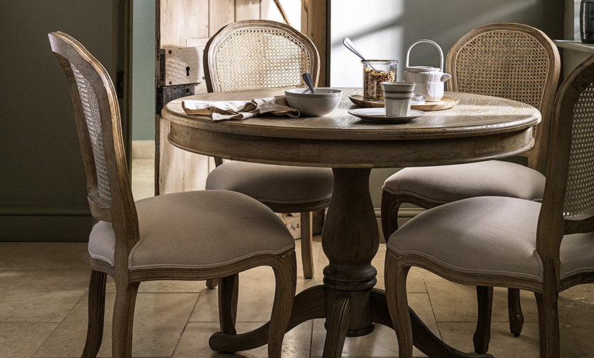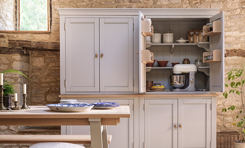 You are here: The Cotswold Company project Kitchen See The Cotswold Company profile Gallery Chester Dove Grey Kitchen Island Camille Limewash Oak Round Dining Table & Camille Limewash Oak Dining Chair Chester Dove Grey Quad Larder, Chester Dove Grey 6 -10 Seater Extending Trestle Table Oakland Rustic Oak Round 4-6 Seater Extending Dining Table & Primrose Upholstered Button Back Chair, Stone Chester Dove Grey Small Kitchen Island with Granite Top Elkstone Mellow Oak Grand Dresser