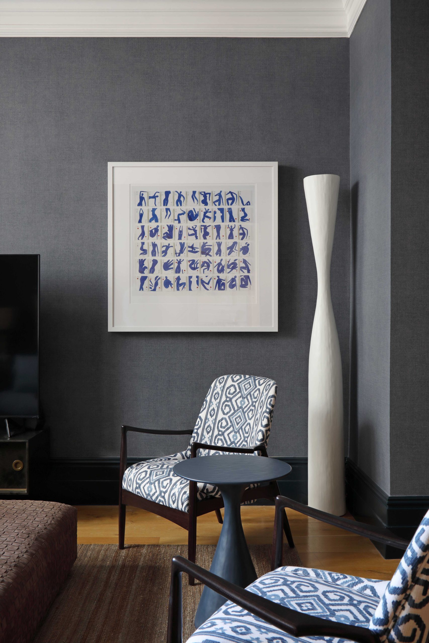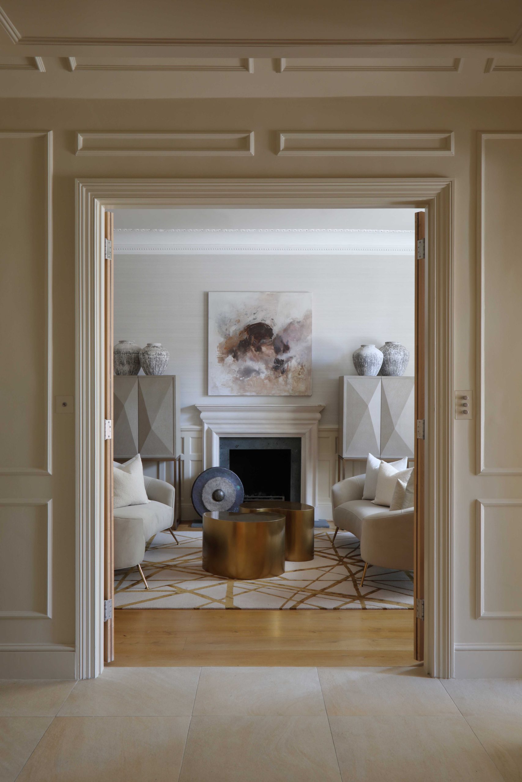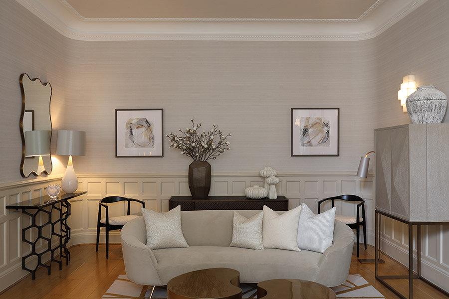 The property’s existing curved walls, panelling and high ceilings offered the perfect backdrop for our three-room scheme, which included the acquisition and placement of artworks.