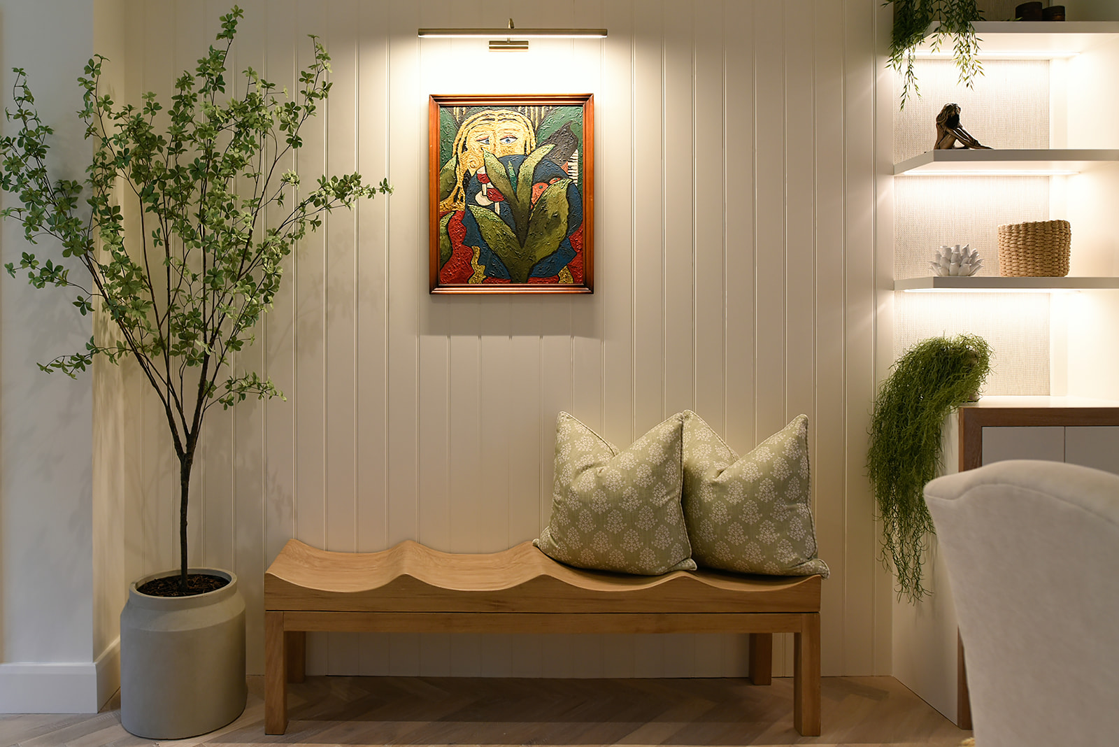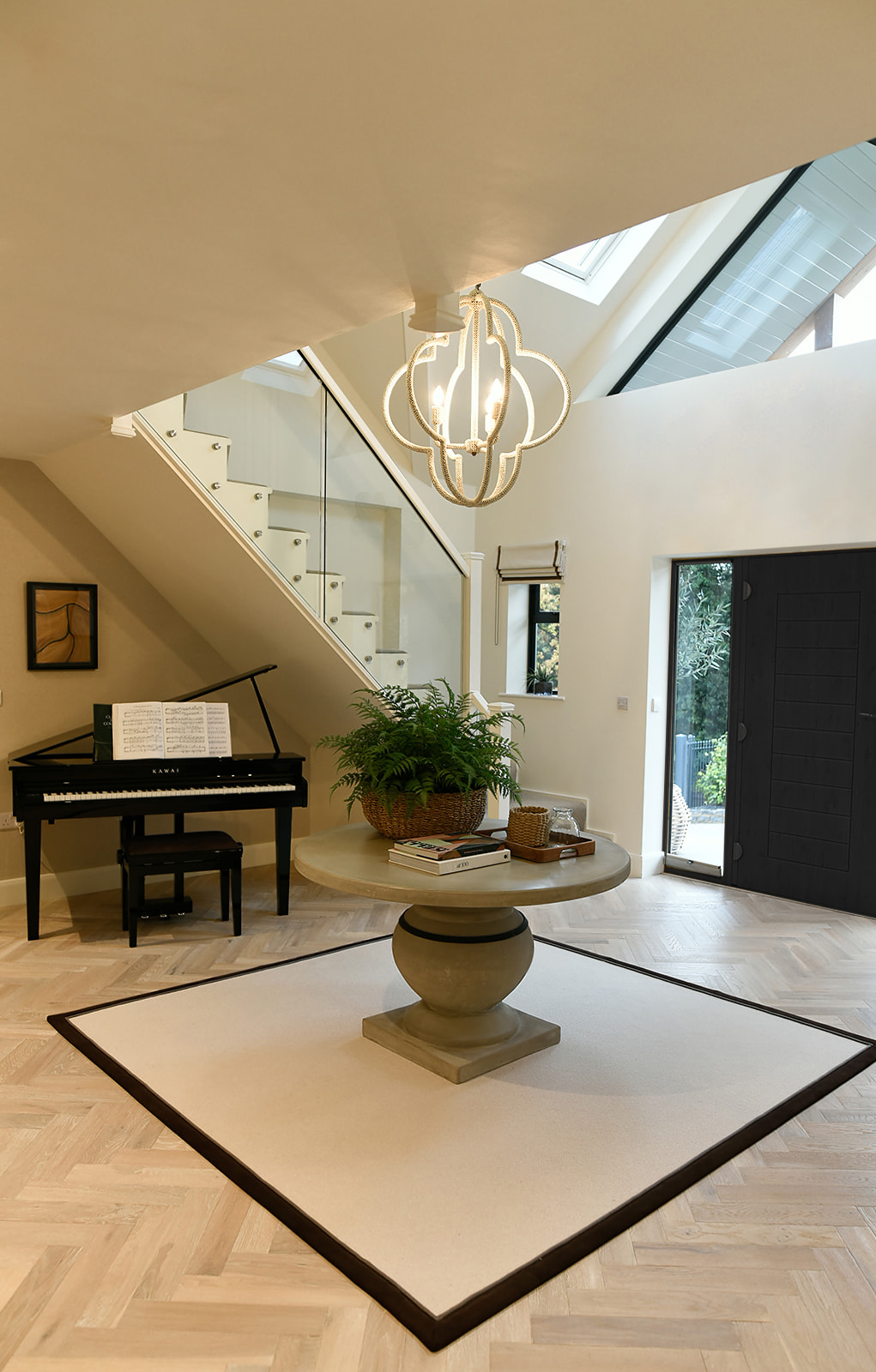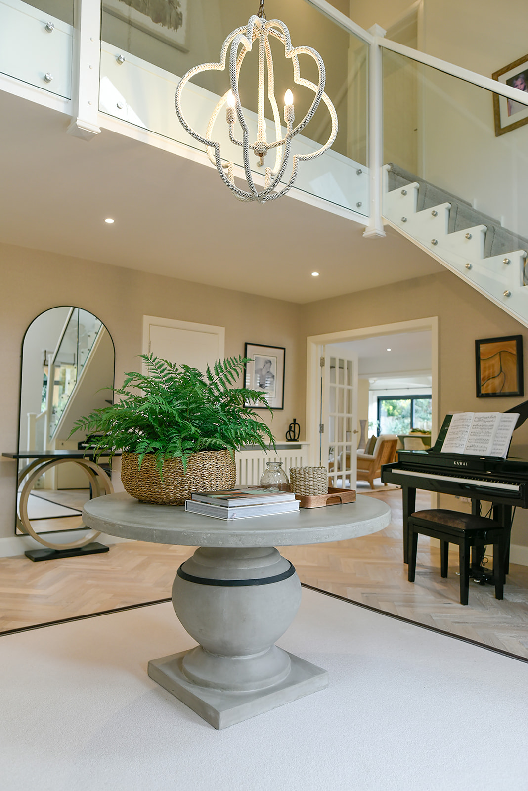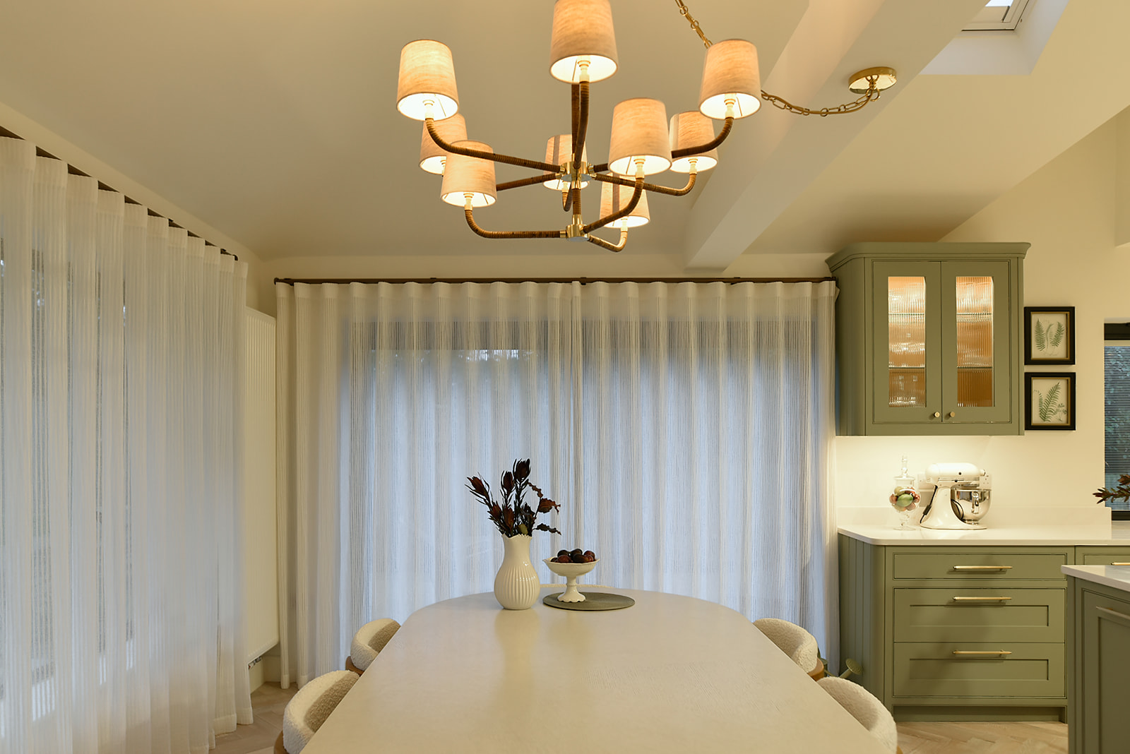 A stunning four-bedroom family home nestled in the highly sought-after area of Cobham. After recently downsizing, the homeowners wanted to bring a fresh, personal touch to their new build. A soft, inviting colour palette was introduced to add warmth throughout the space. By seamlessly blending indoor and outdoor elements, the kitchen was transformed into a light-filled, welcoming hub of the home. Natural materials in the furniture and lighting—such as the elegant Porta Romana bamboo pendant—further elevated the space with texture and character.